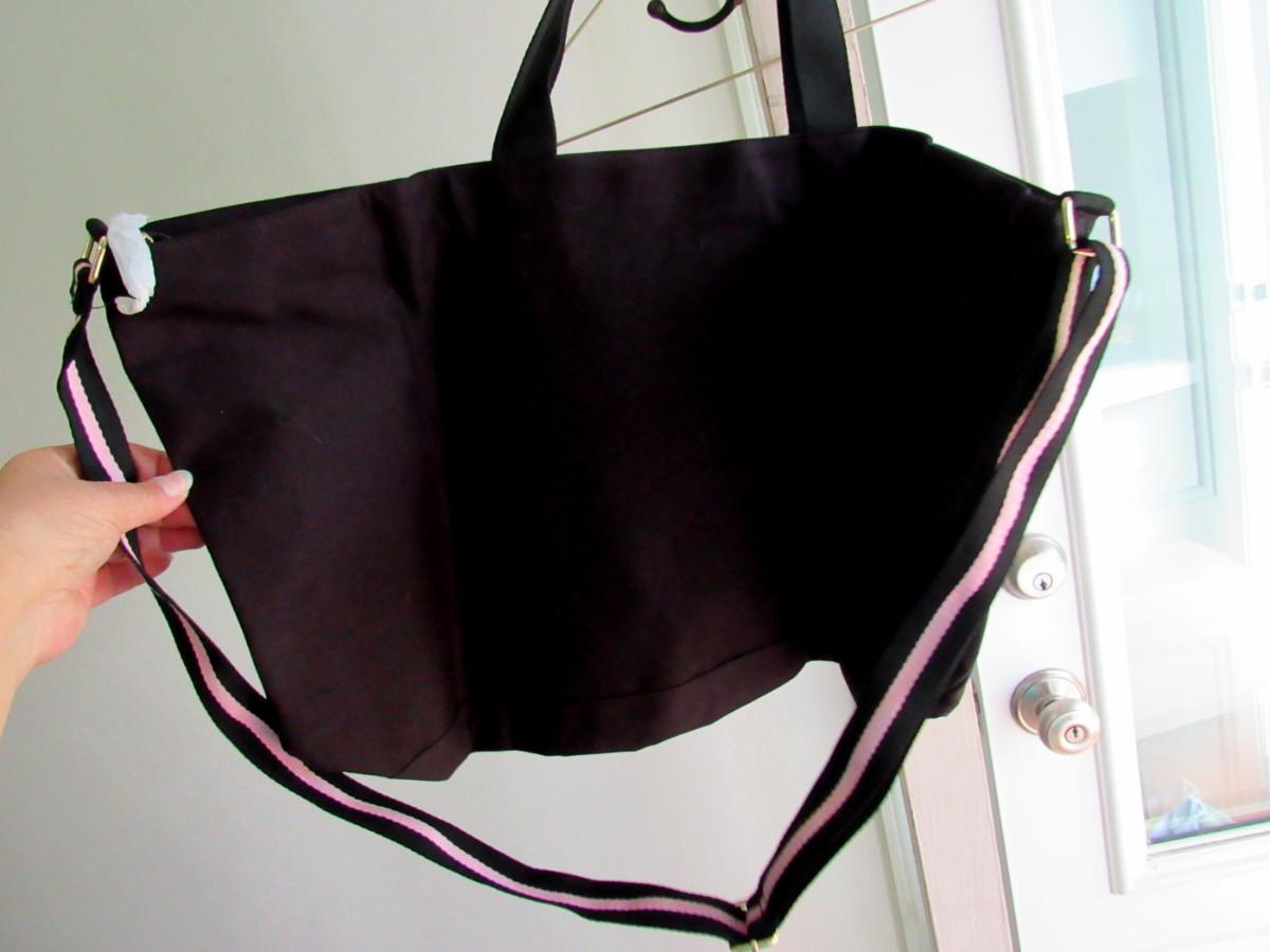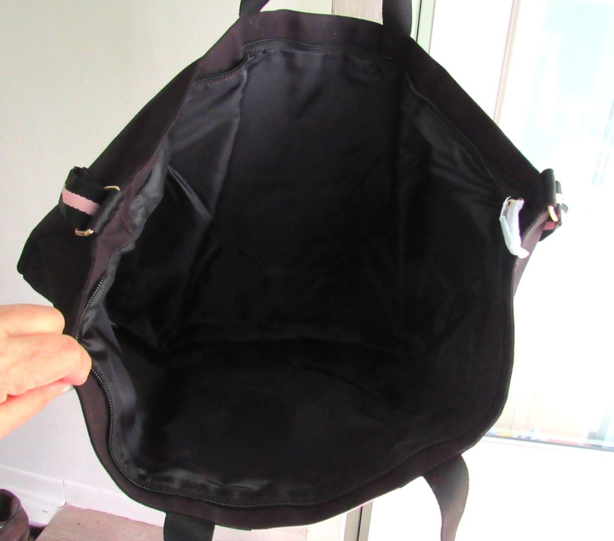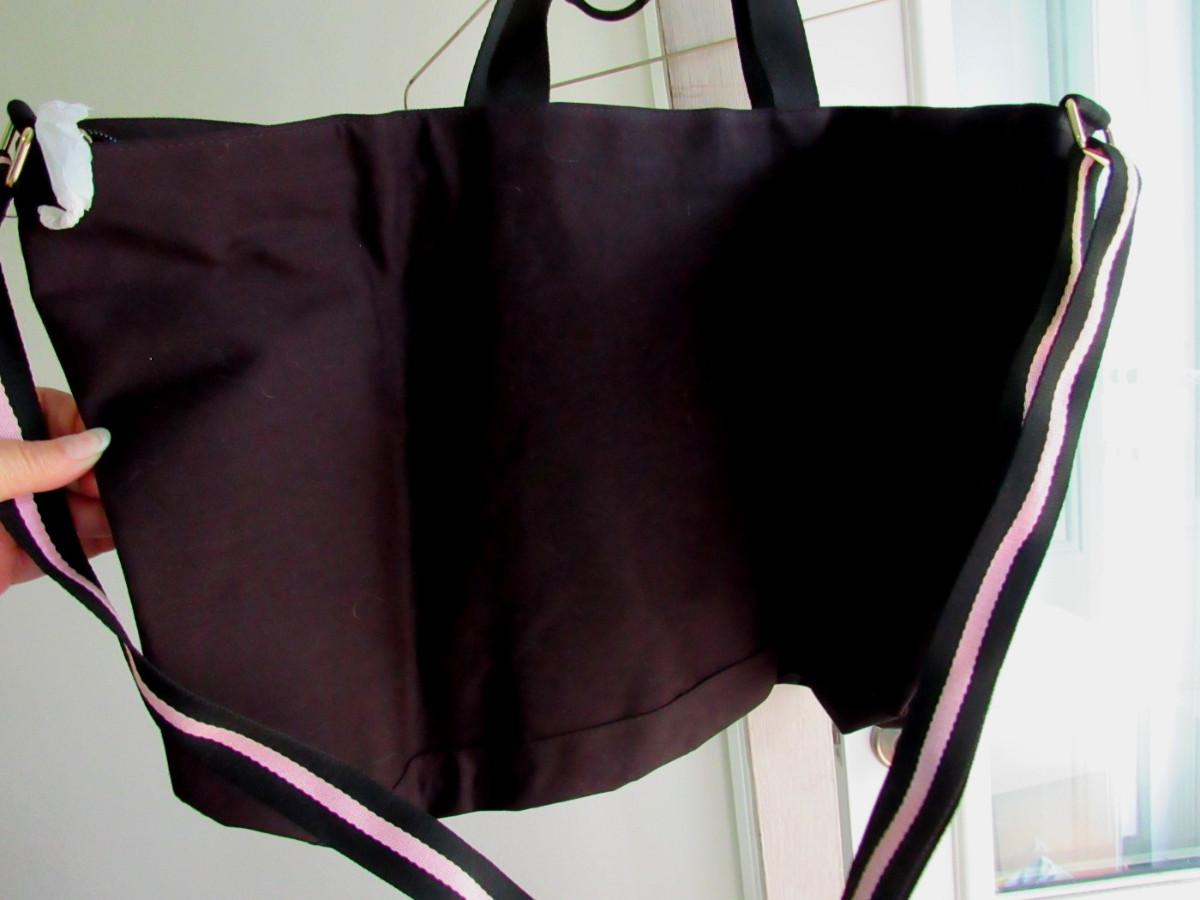Excellent never used, original label attached, was originally $60. 23" wide at the widest, nice and clean. Black, pink. white cotton, poly, PVC. Straps and zipper good.