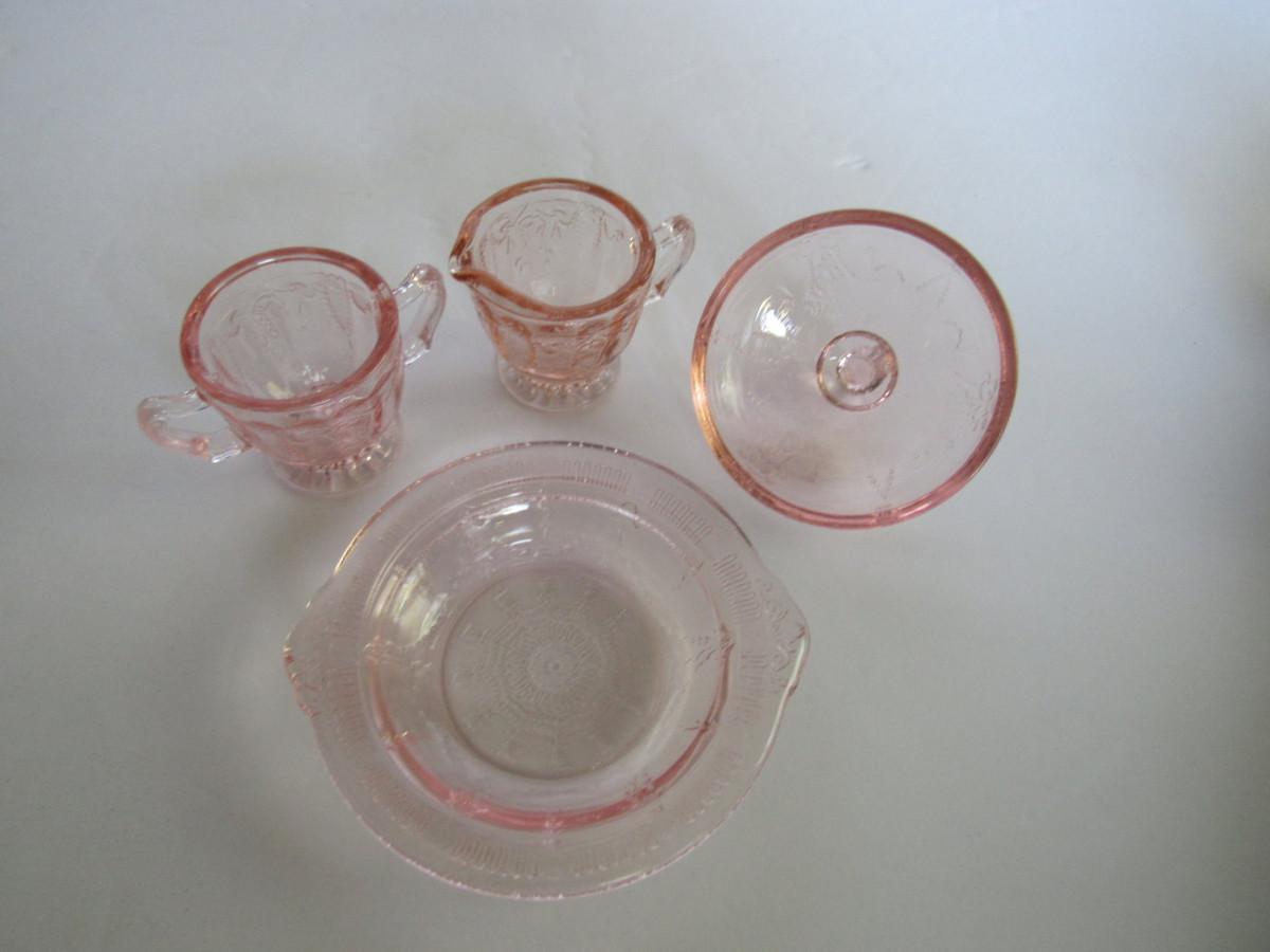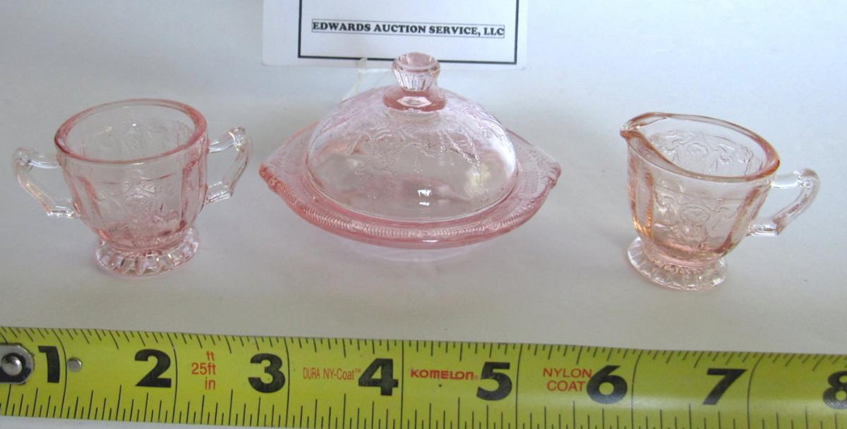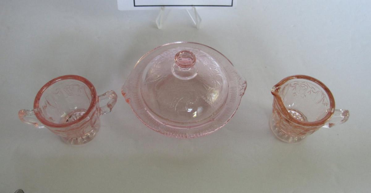 Child's Size Mosser Glass Jennifer Sugar, Creamer, Butter Dish, Jennifer, Pink