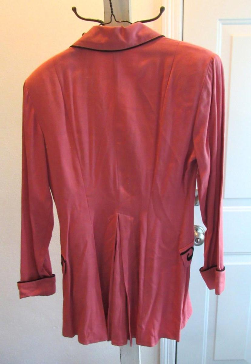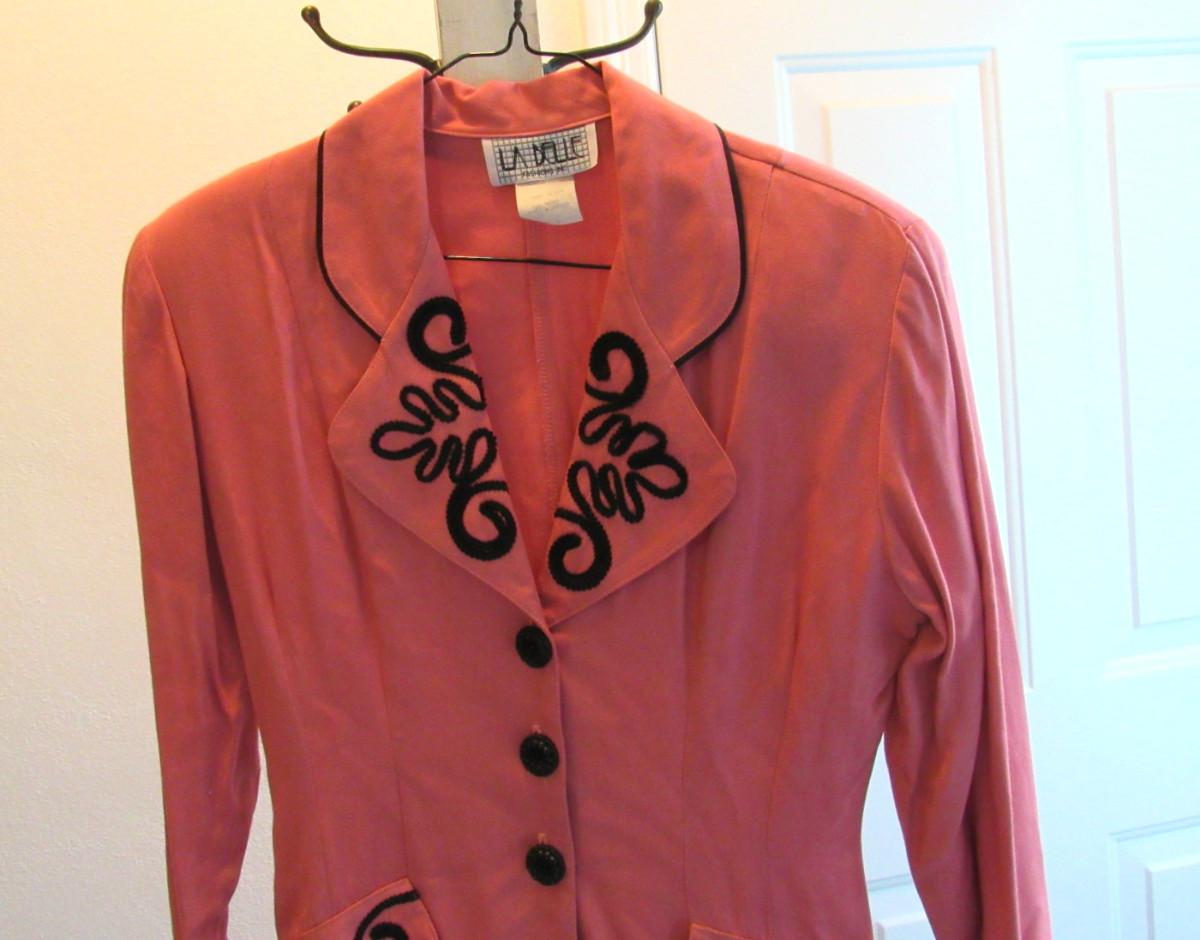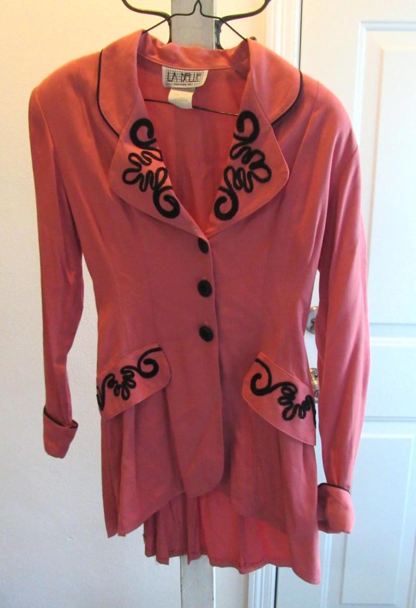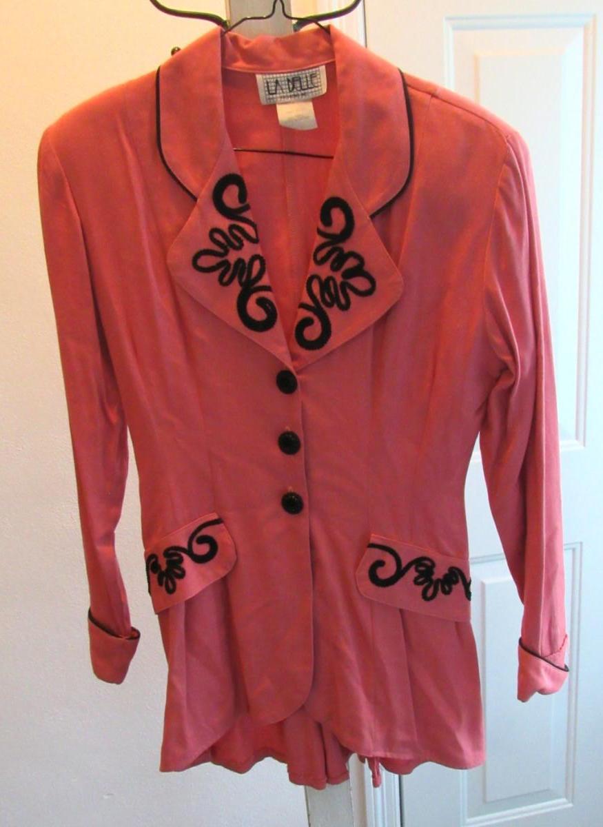 Pink and black interesting blazer type top. Button down front, V neckline with fancy trim. Cuffs with trim. Padded shoulders, faux pockets, pleated back. Nice buttons. LaBelle label, Size 3 it says. Overall nice shape. Shipping is available at actual shipping cost plus $5.00 handling fee per box for supplies/labor. See our terms for details. All sales are final. Condition notes may not be all inclusive, we may miss some issues as most vintage items are not in mint condition and have some degree of wear, paint loss, etc, but we always try to note obvious damage.