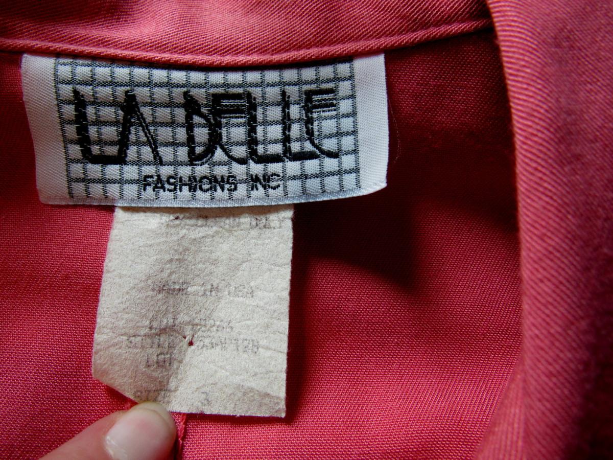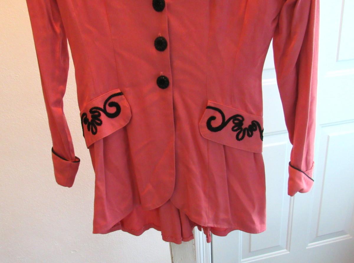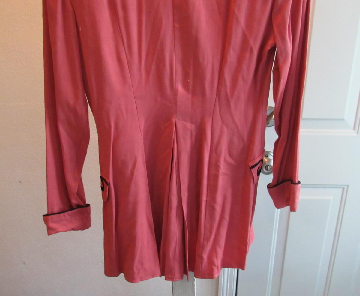 Pink and black interesting blazer type top. Button down front, V neckline with fancy trim. Cuffs with trim. Padded shoulders, faux pockets, pleated back. Nice buttons. LaBelle label, Size 3 it says. Overall nice shape. Shipping is available at actual shipping cost plus $5.00 handling fee per box for supplies/labor. See our terms for details. All sales are final. Condition notes may not be all inclusive, we may miss some issues as most vintage items are not in mint condition and have some degree of wear, paint loss, etc, but we always try to note obvious damage.