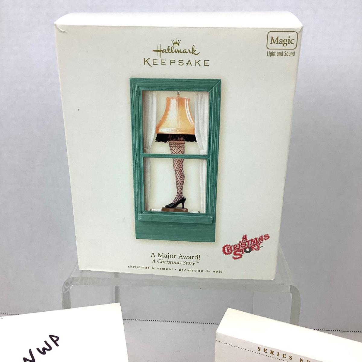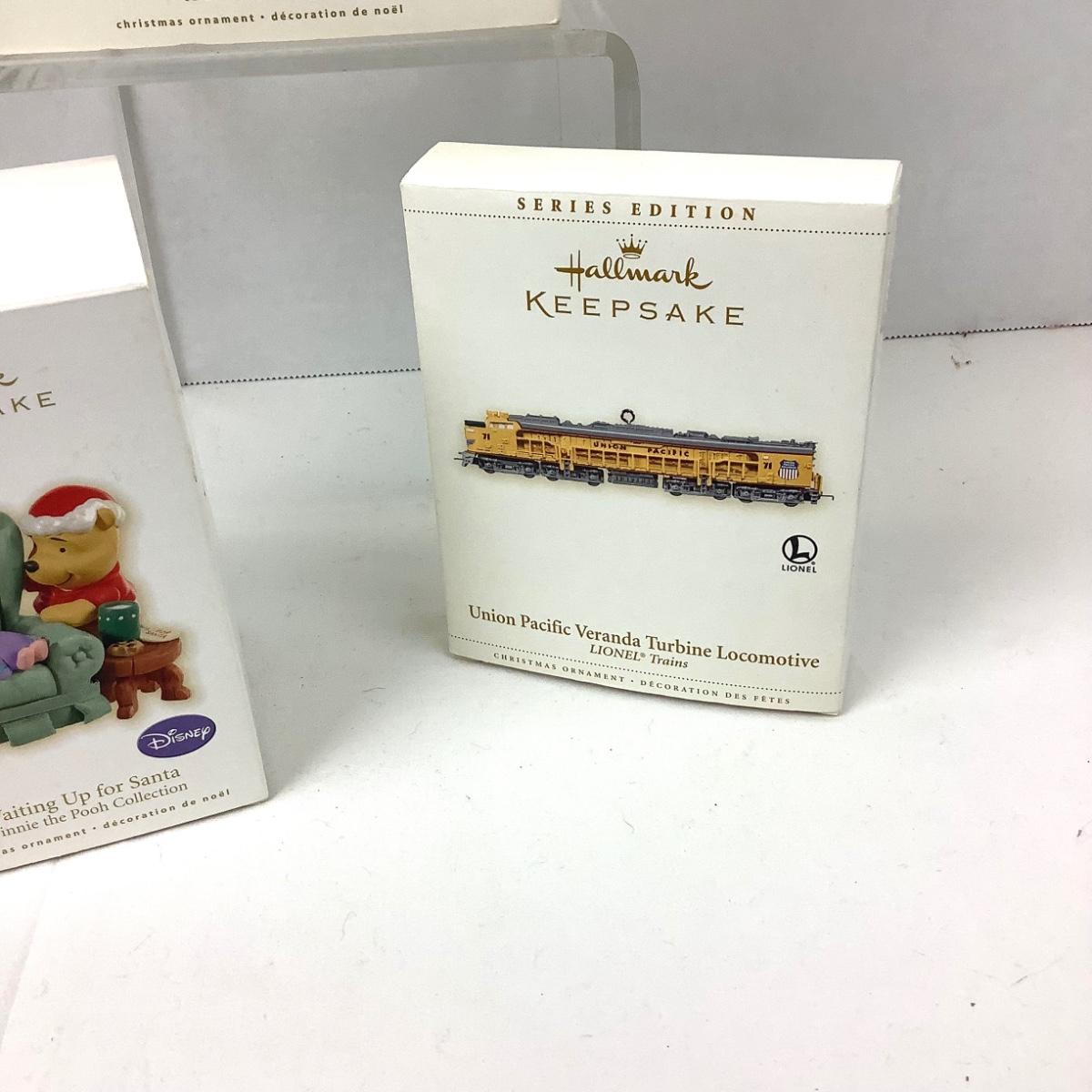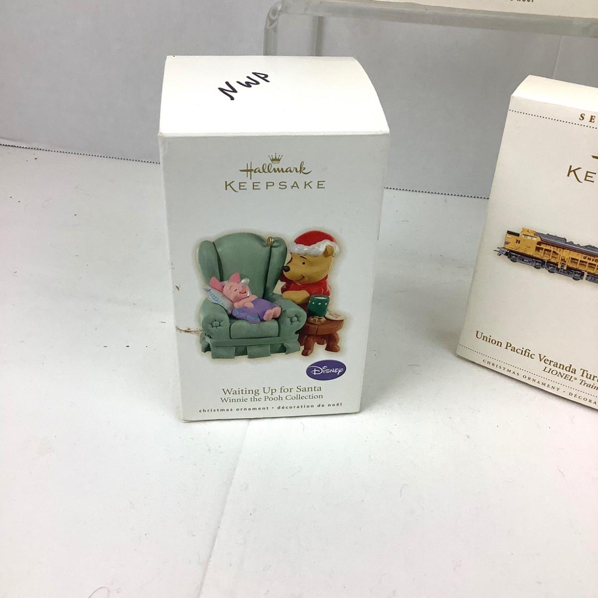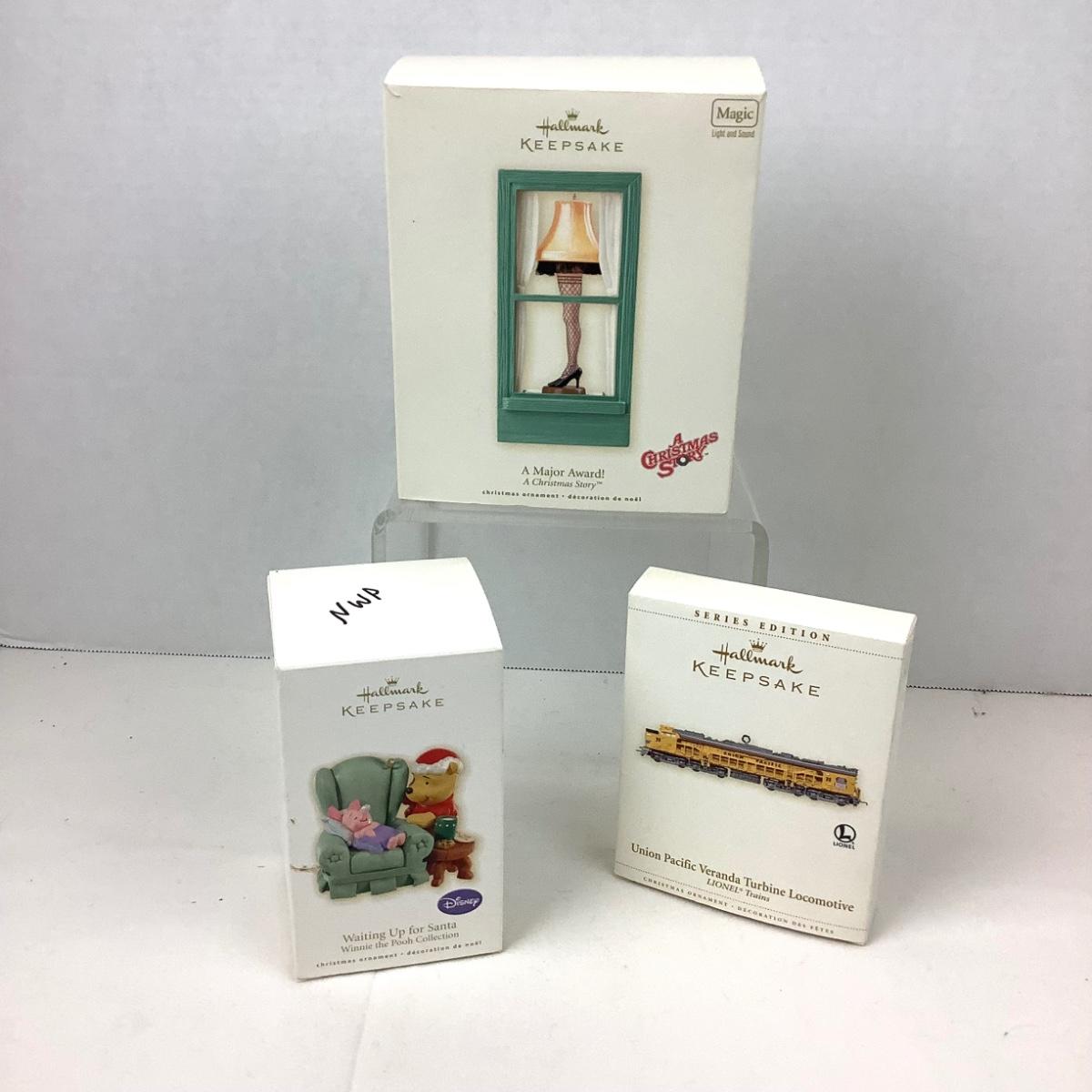 Union Pacific Veranda Turbine Lionel Locomotive, A Christmas Story Leg Lamp ornament, Pooh & Piglet Waiting for Santa.