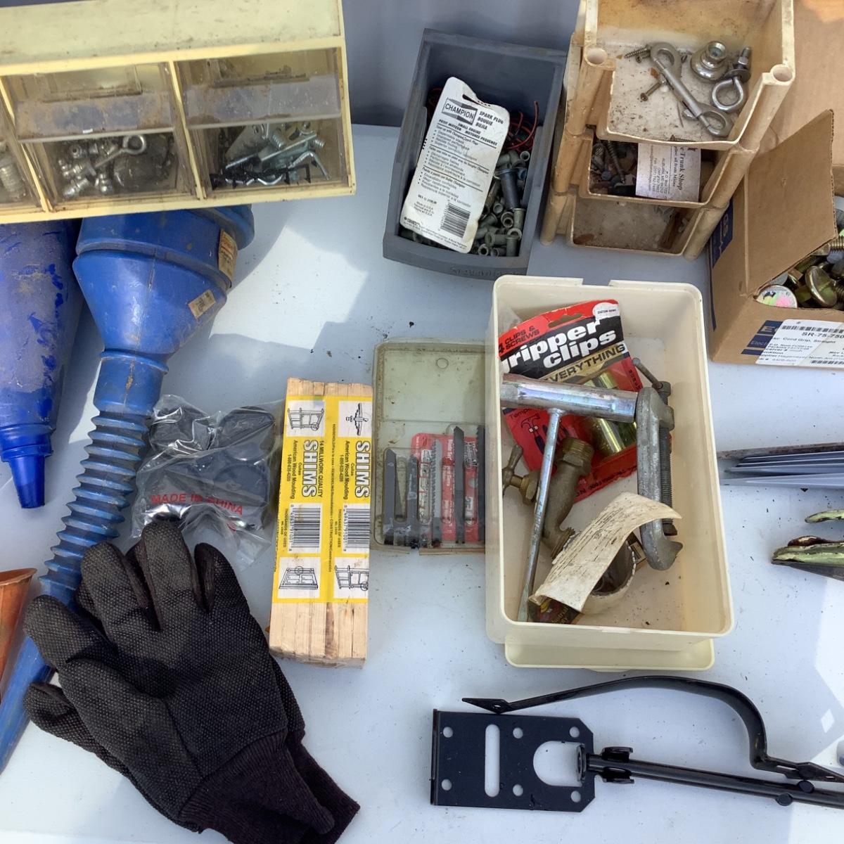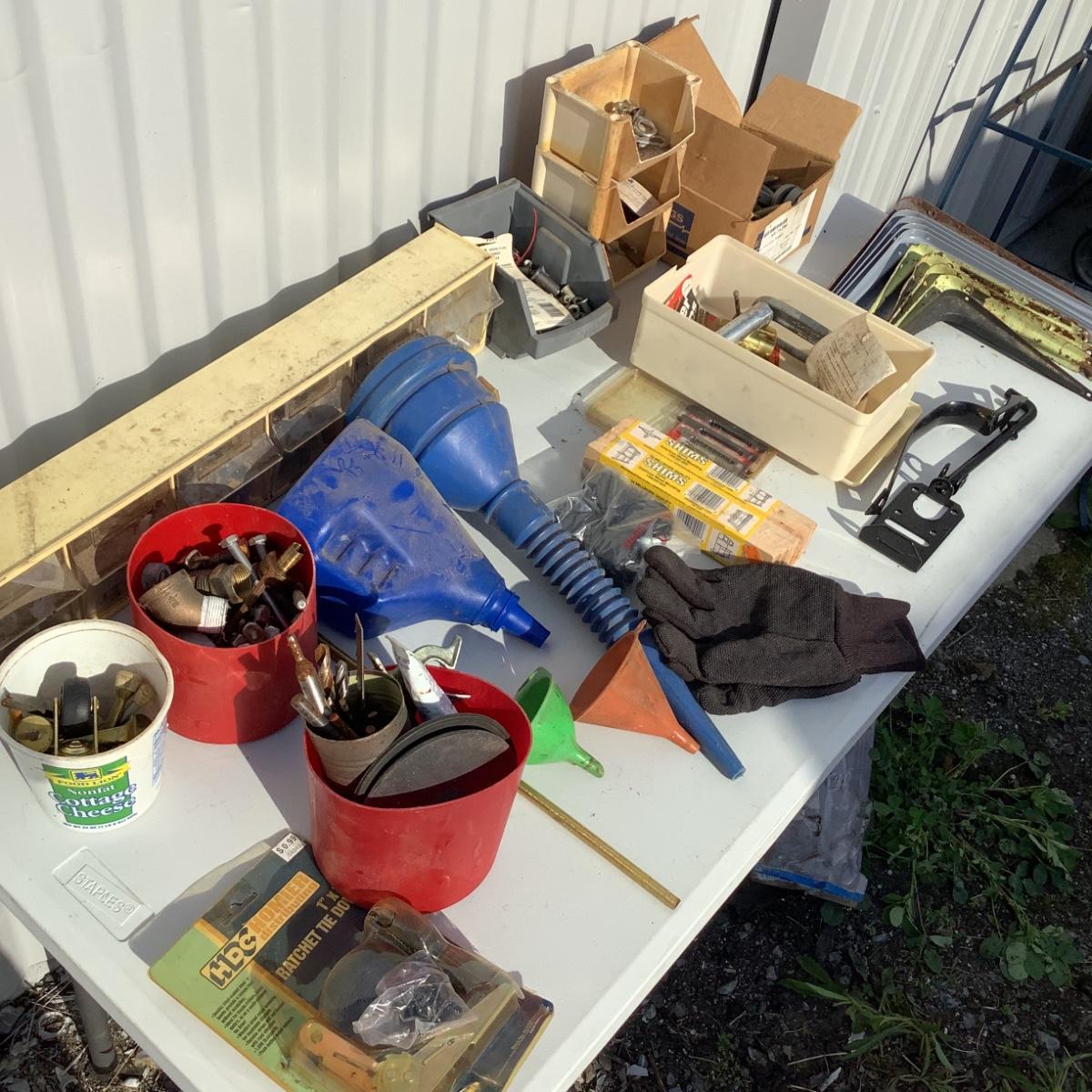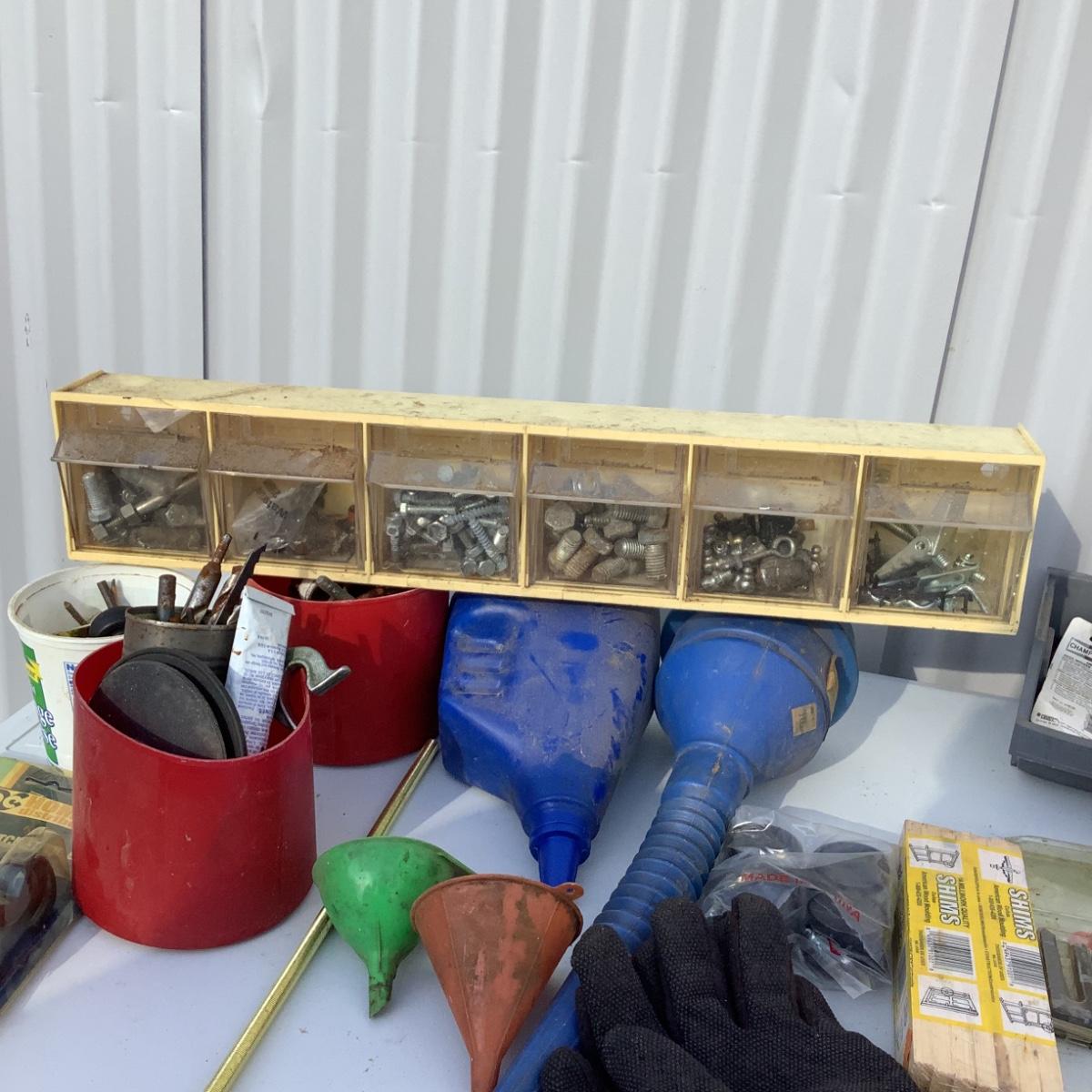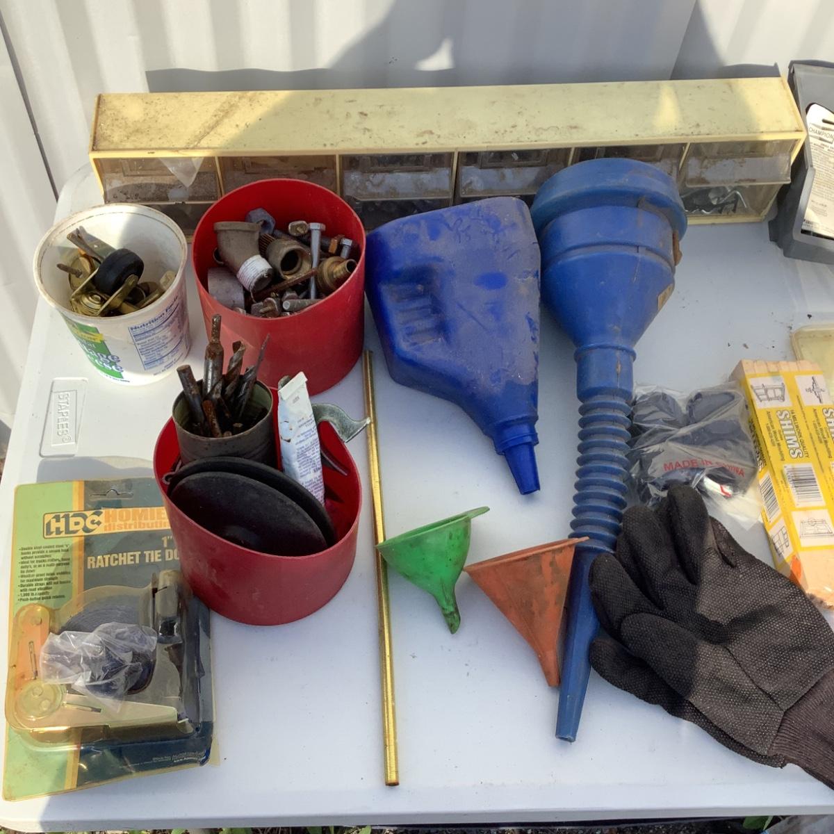 Includes funnels, screws, nails, bolts, gate lock, shelving brackets, gloves & more