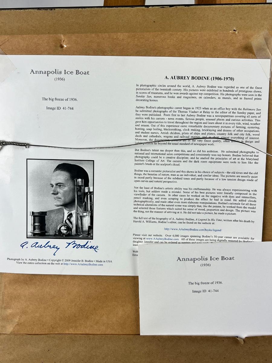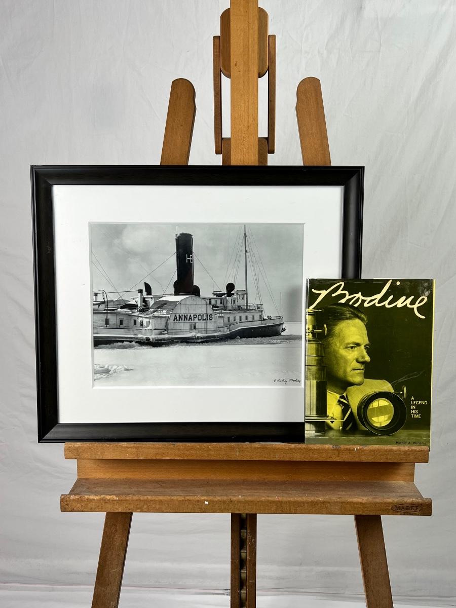 Framed photograph by A. Aubrey Bodine of "Annapolis Ice Boat" and includes a book of his work.