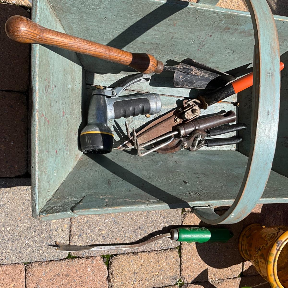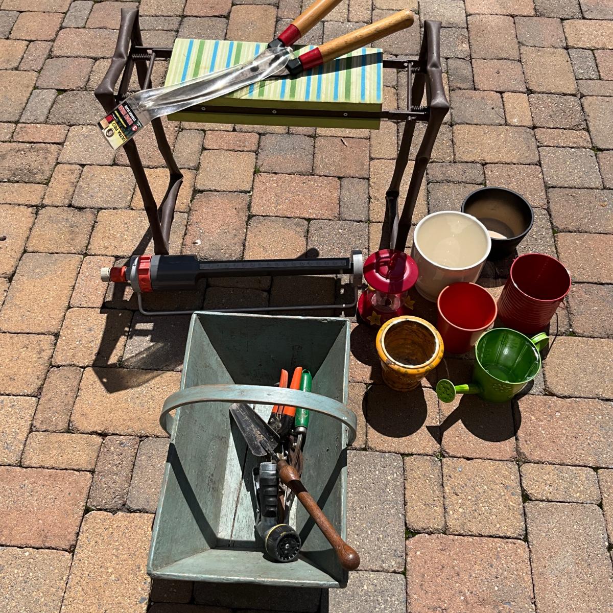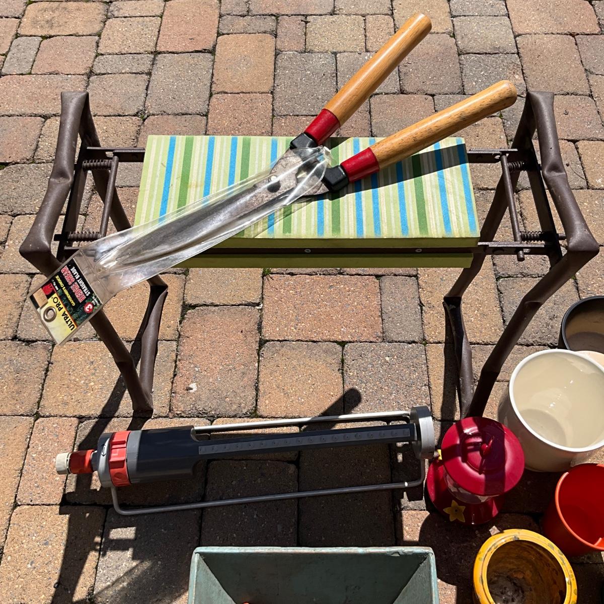 Lot contains edgers, garden bench, sprinkler, trimmers, pots, shears and more.