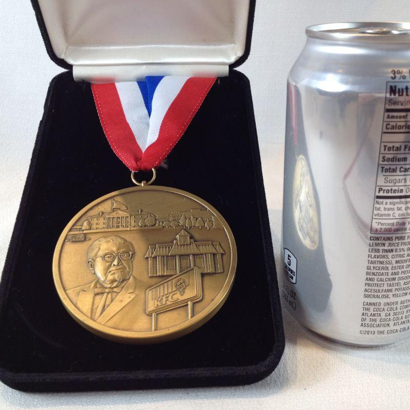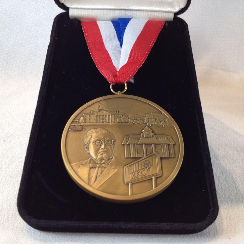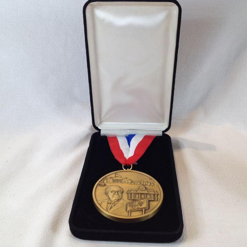 This lot is for a Kentucky Fried Chicken 1996 Team Medallion. Medallion is nicely and deeply embossed with the image of the Colonel, the Louisville Headquarters, a standard Restaurant Building and the KFC Signage. Quite an impressive piece. Must weigh near a pound. Comes in a nice velour box with a red, white and blue necklace ribbon attached. Reserve/Starting Bid is $20.