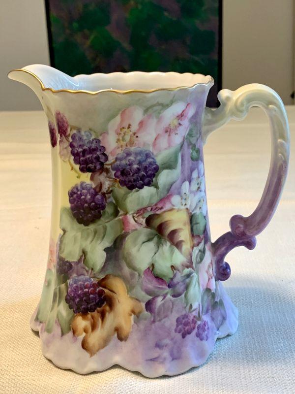 Hand painted antique pitcher, 7" tall, dated 1908. Very well done, blackberries & vines. Haviland France