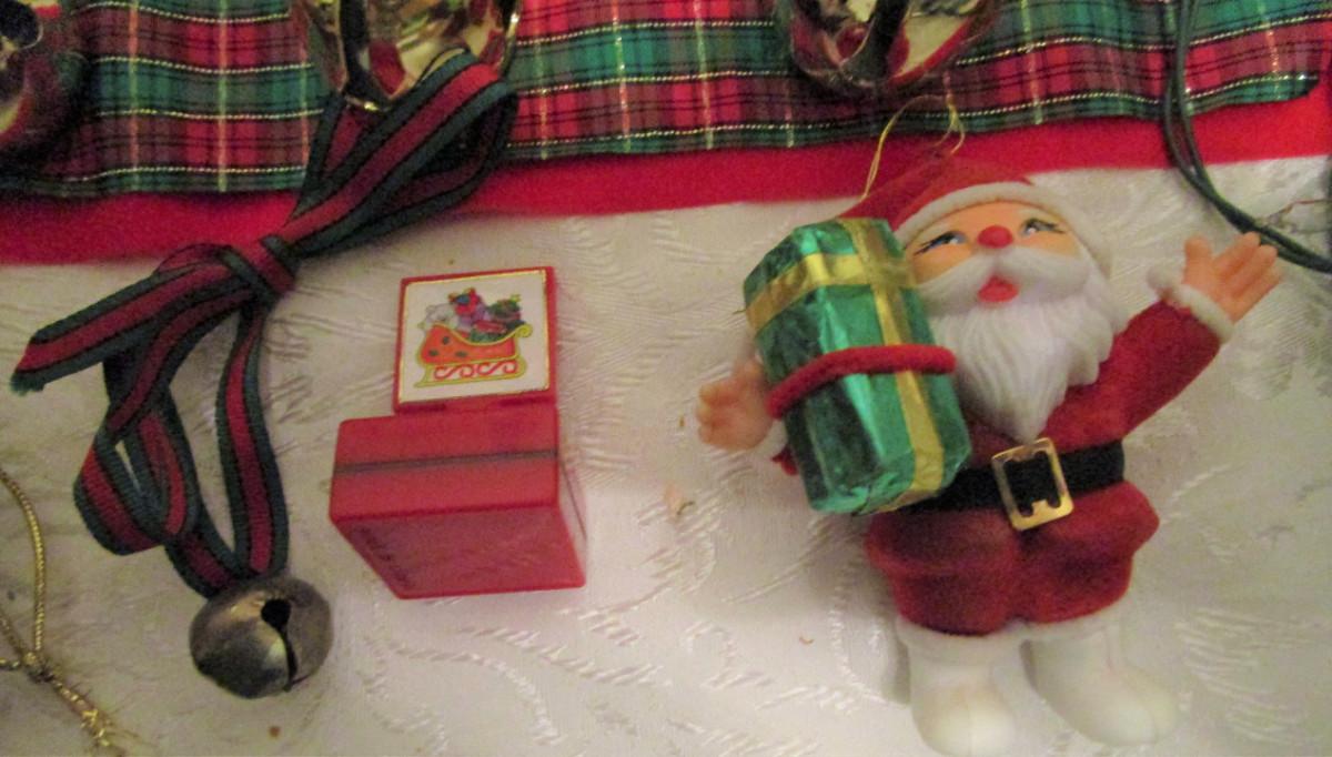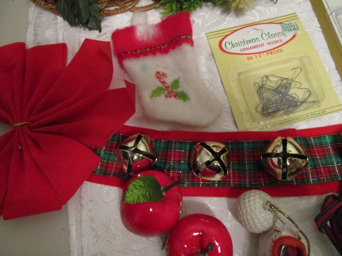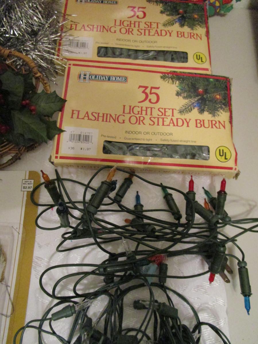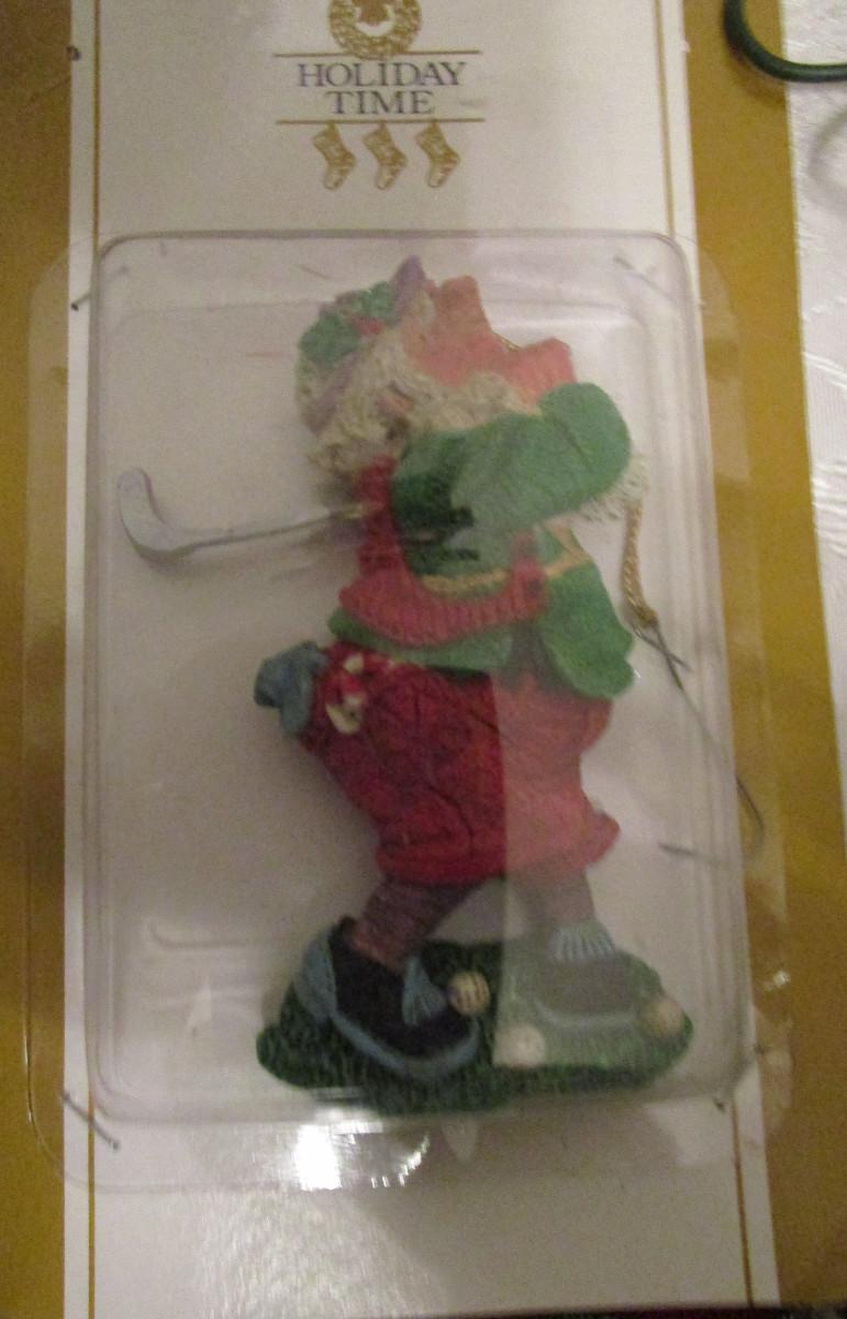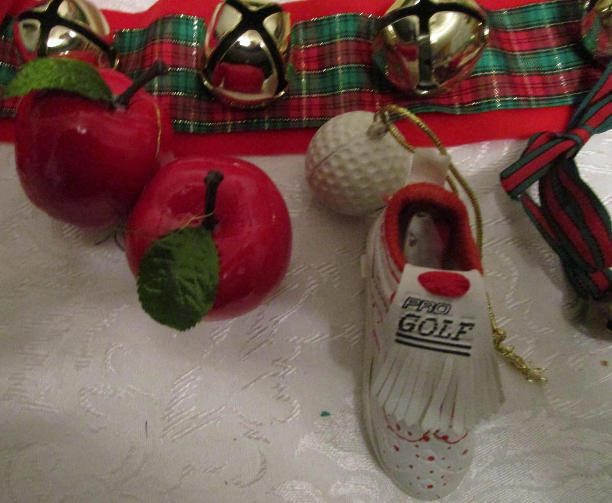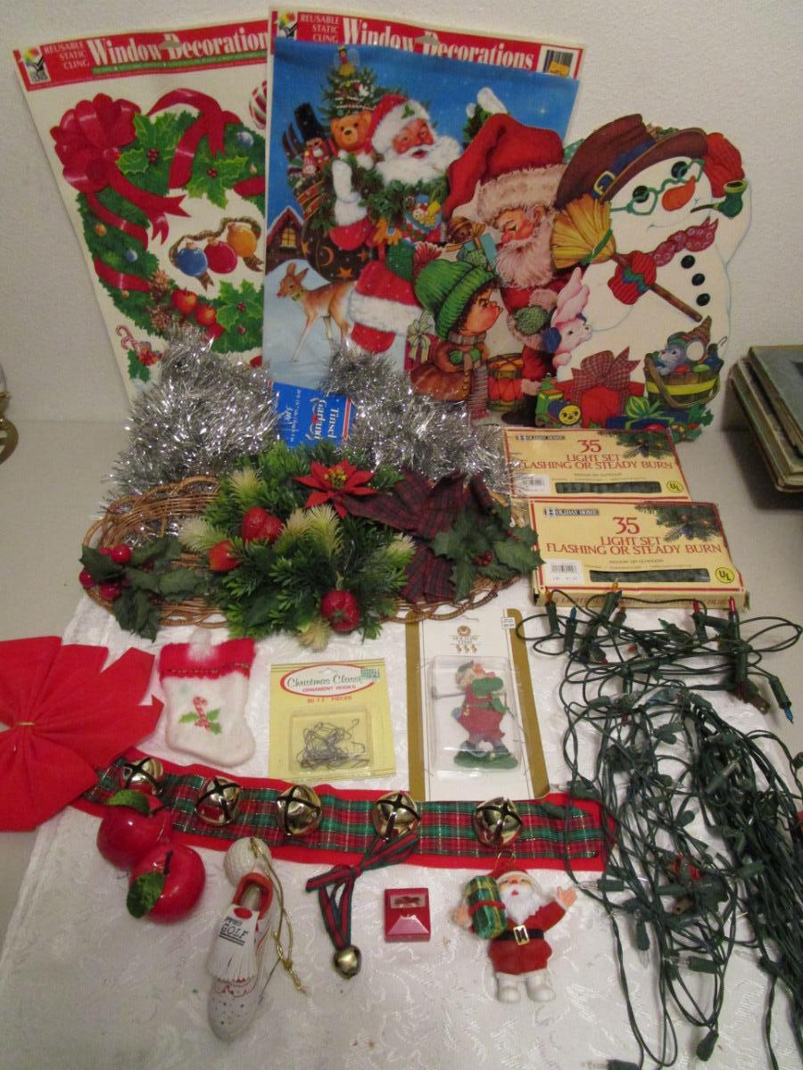 Two sets of 35 mini lights in box, white, can be flashing or steady burn; One set of 20 mini lights, multi-colored; Two sets of 35 mini lights, white; Set of five bells; small stocking; two apple ornaments; small bell on a ribbon; two Santa ornaments; Golf ball and Pro Golf Shoe ornament; small Christmas stamp; Two 20 Ft packages of tinsel garland; wall display; Two static cling window decorations, and Two cardboard cut outs.
