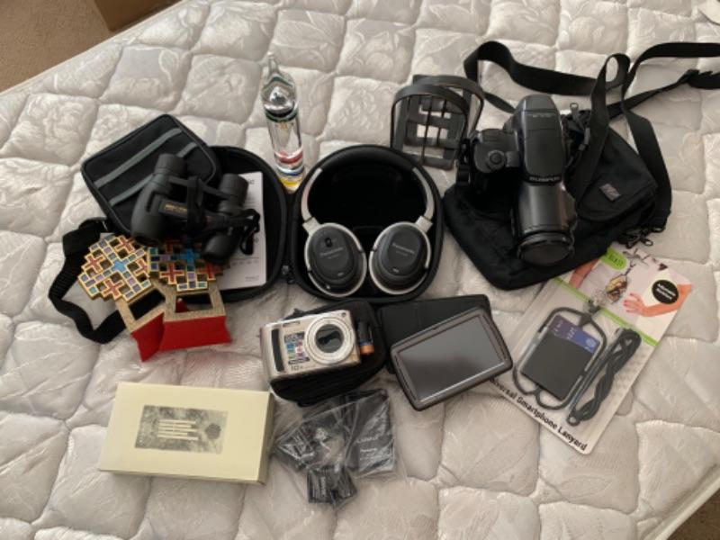 Electronics, cameras (Panasonic and Olympus), binoculars, Garmin GPS locator, wind chimes, etc.