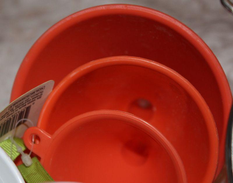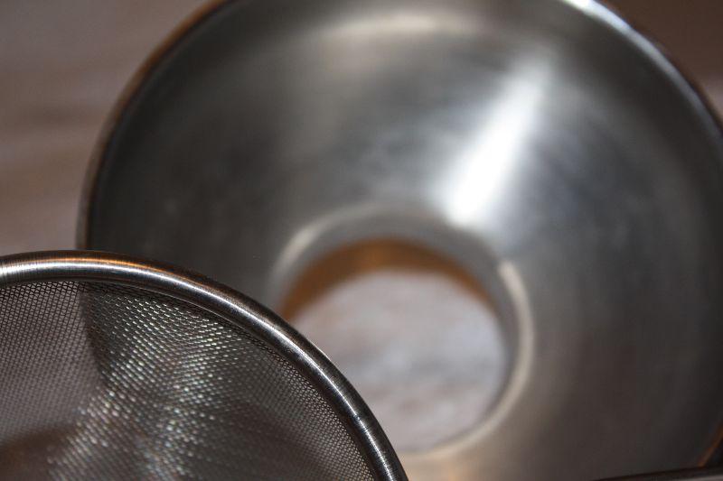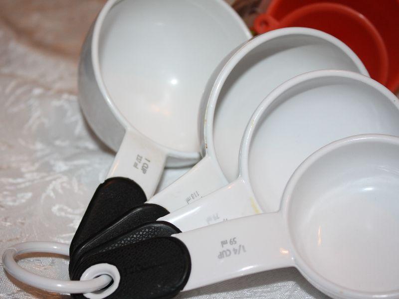 Kitchen Aid measuring cups, New 3 piece funnel set, 3 strainers, and a Canning funnel