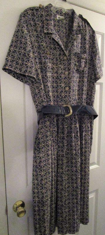 Lovely vintage Leslie Fay Dresse midi dress, shirt style button up top, collar, breast plackets faux pockets, elasticated waist with Navy blue belt Probably more like a size 14 in today's sizing