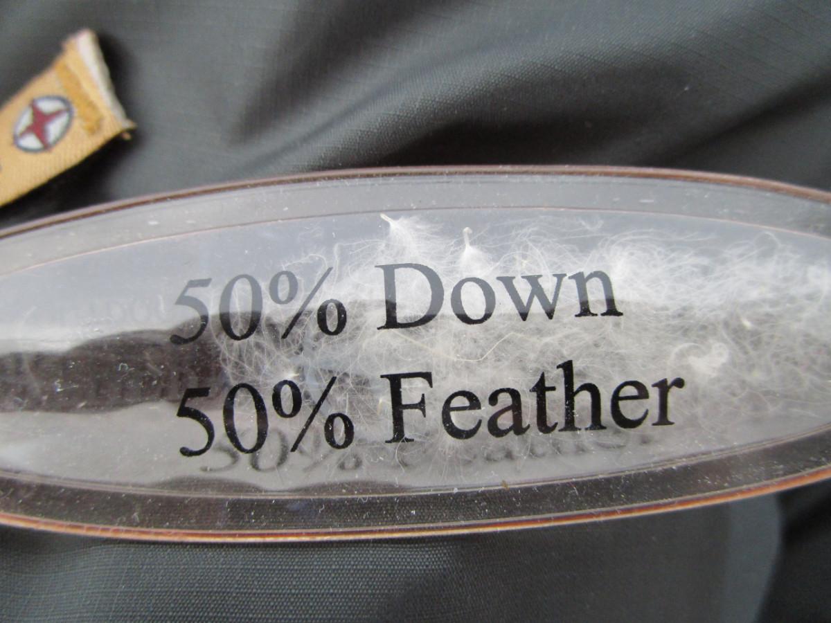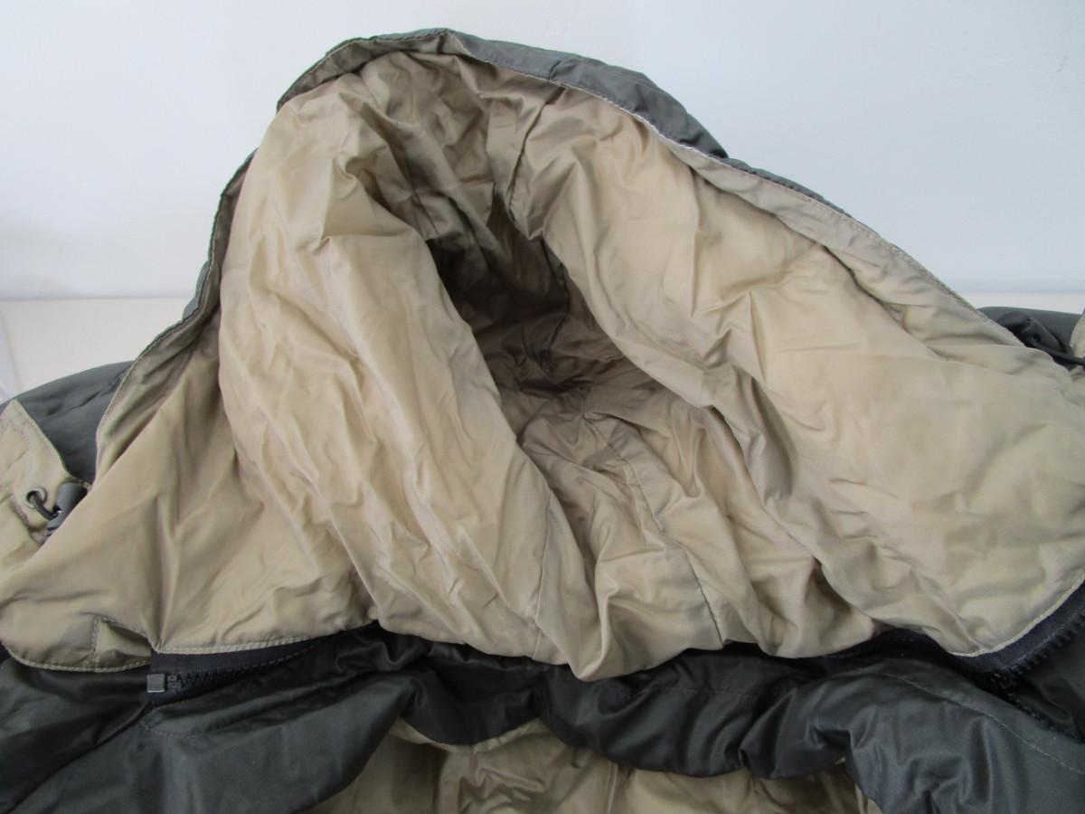 Men's Northern Expedition, 50% down, 50% feather, green exterior, tan interior. Waist tightener; detachable hood