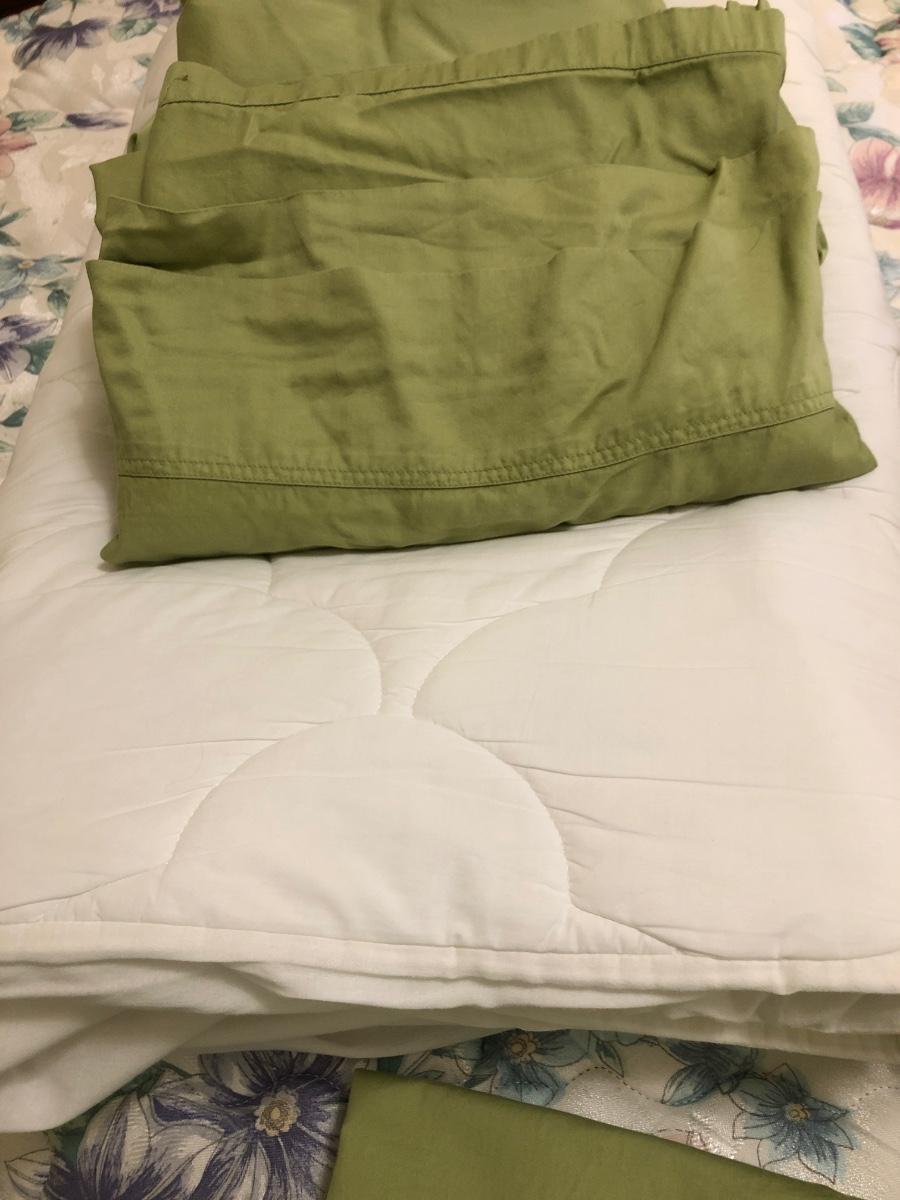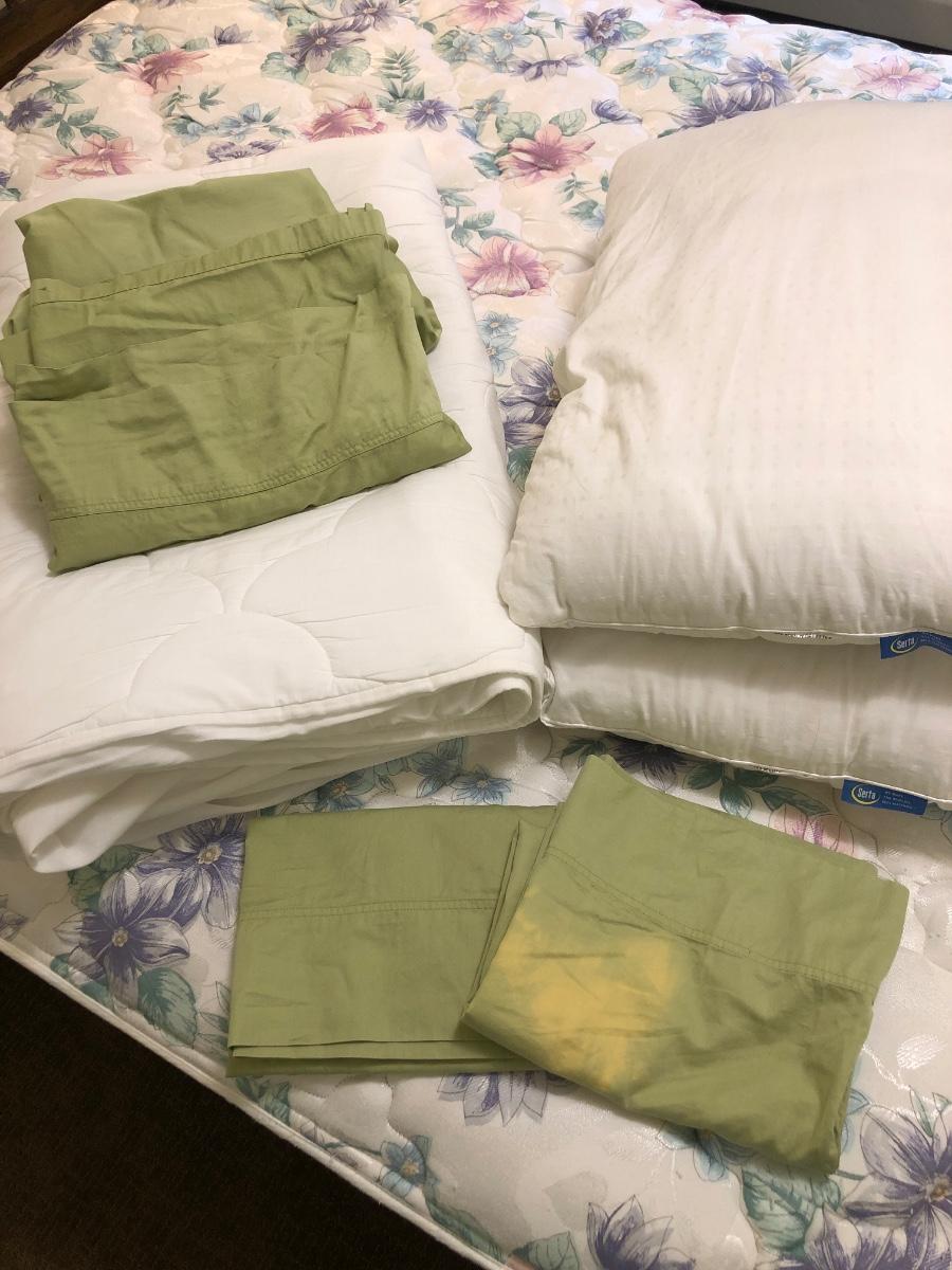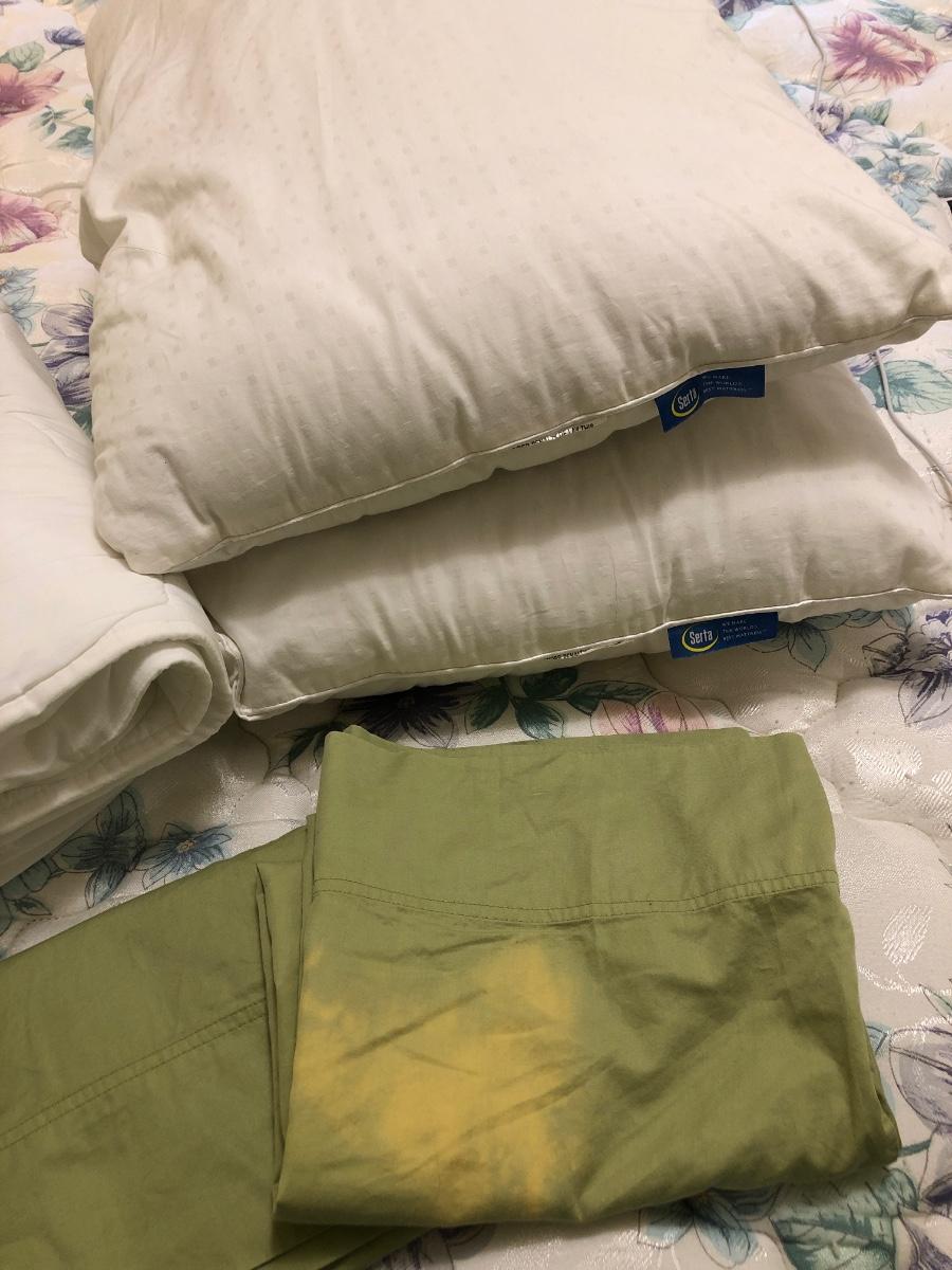 See pics. One pillowcase has discoloration, mattress pad has some tearing of the part that goes under the mattress.