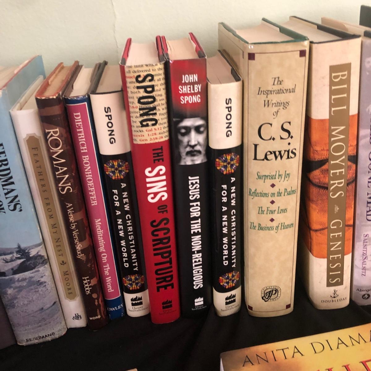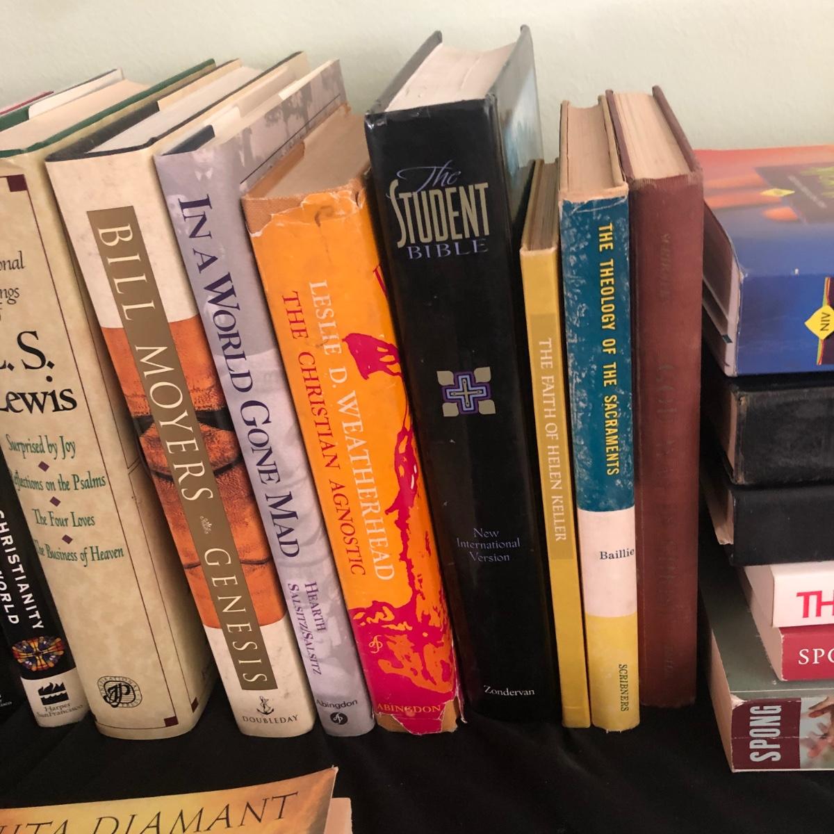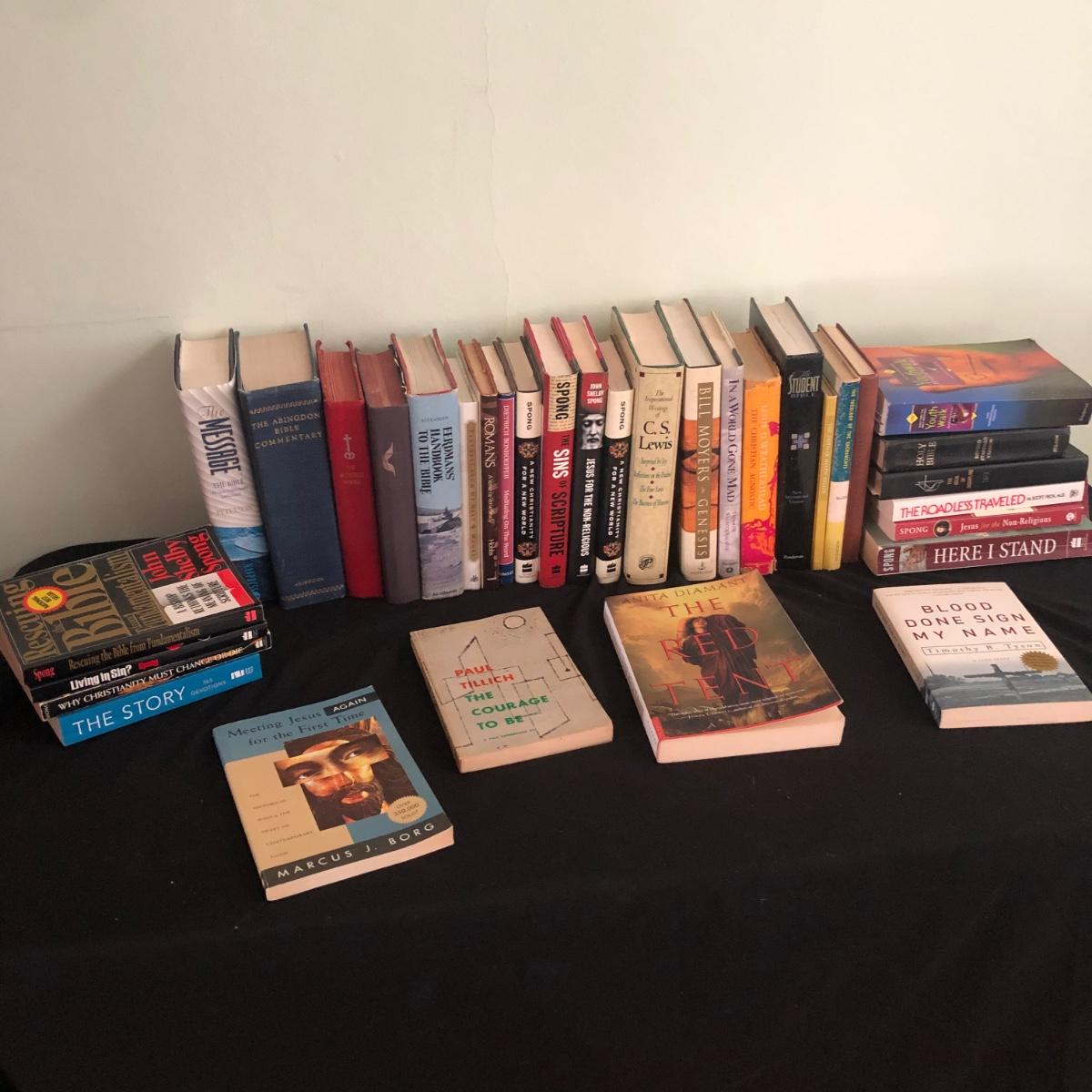 Lot includes 20 hardback books and 14 soft cover books. Book authors include theologians such as, Paul Tillich, John Spong and other authors such as, C.S. Lewis, Bill Moyers and Scott Peck. There are leather bound Bibles included. Local pick up only.