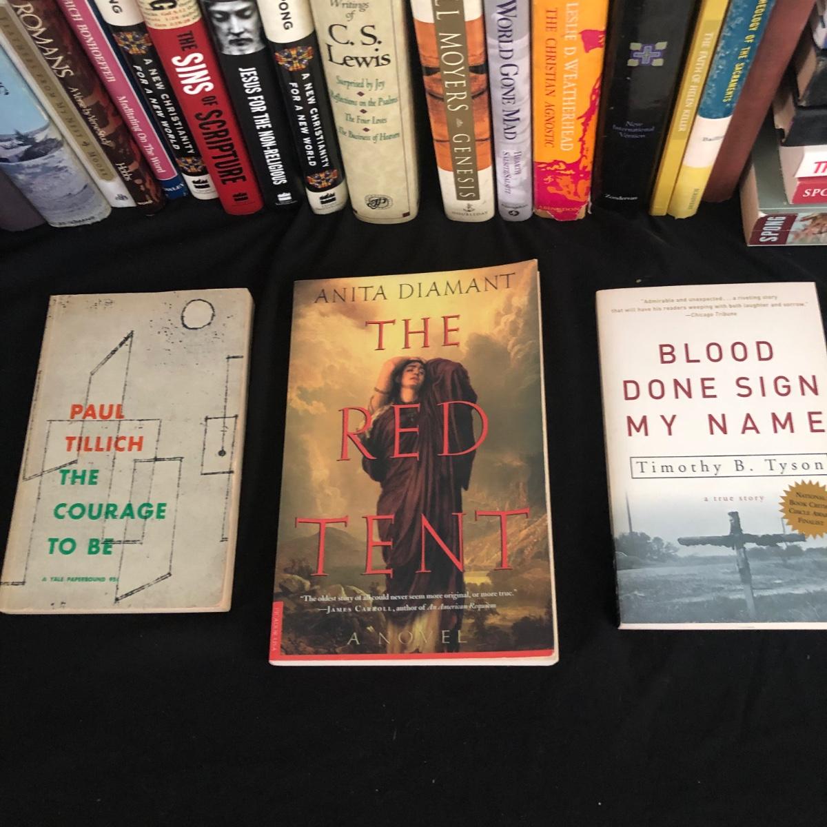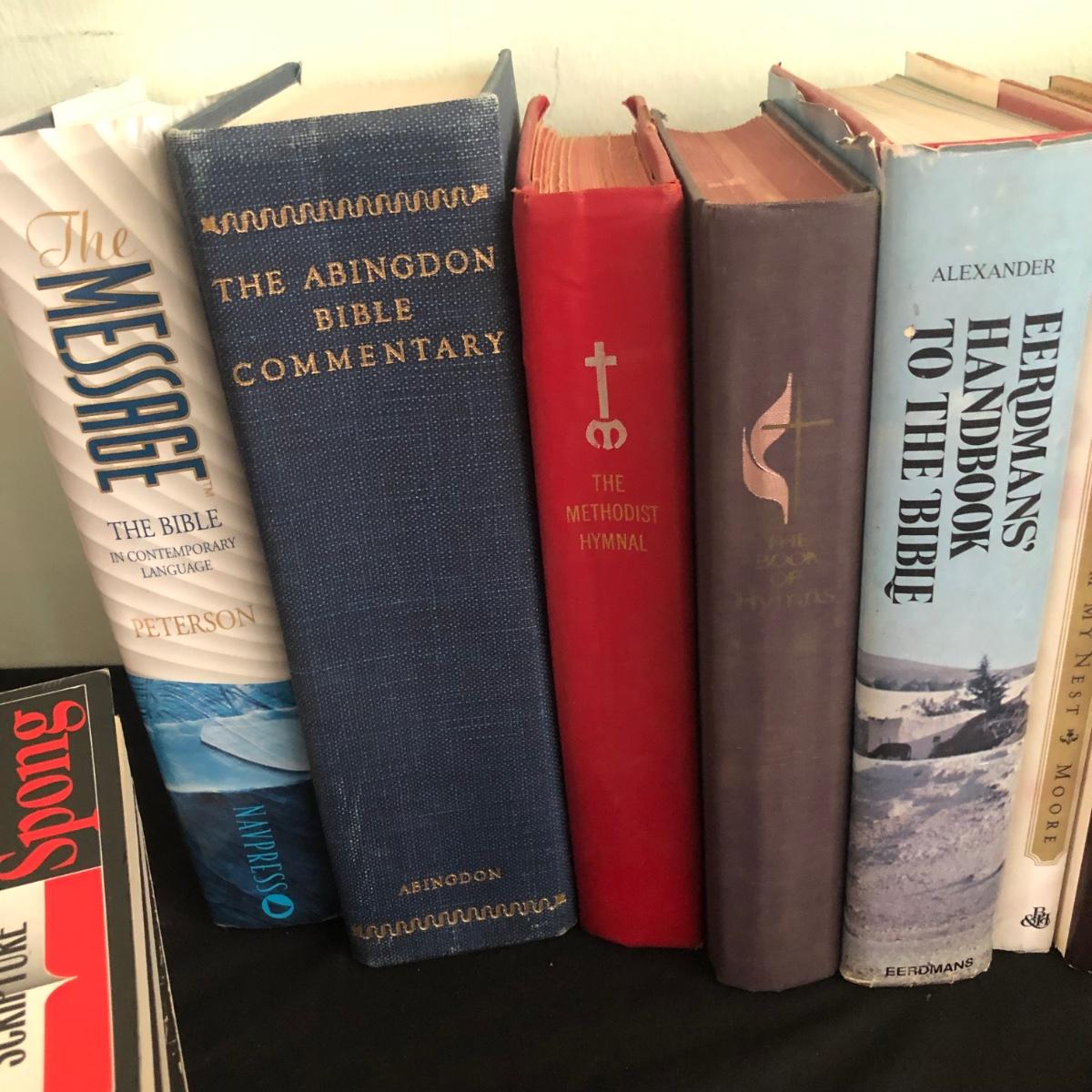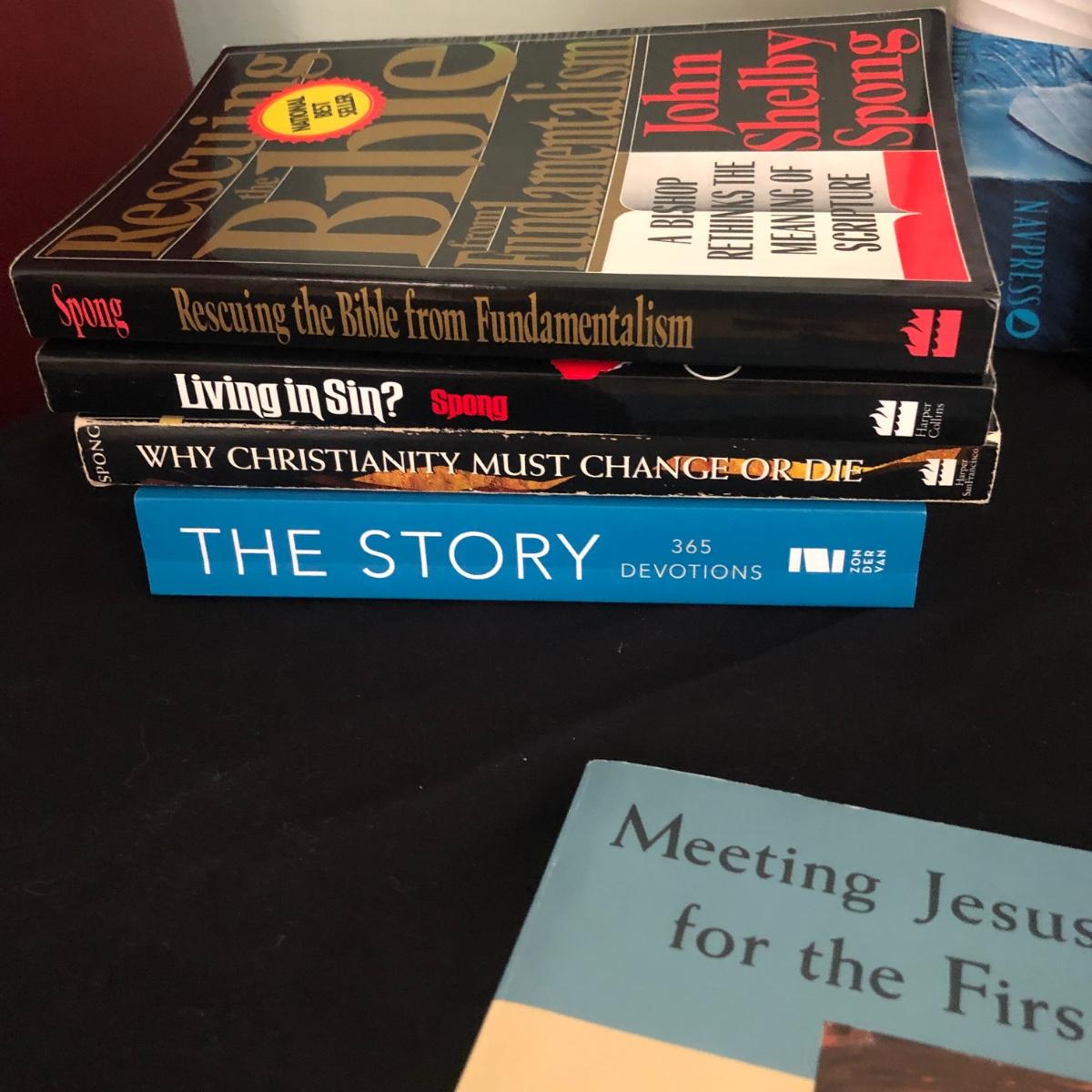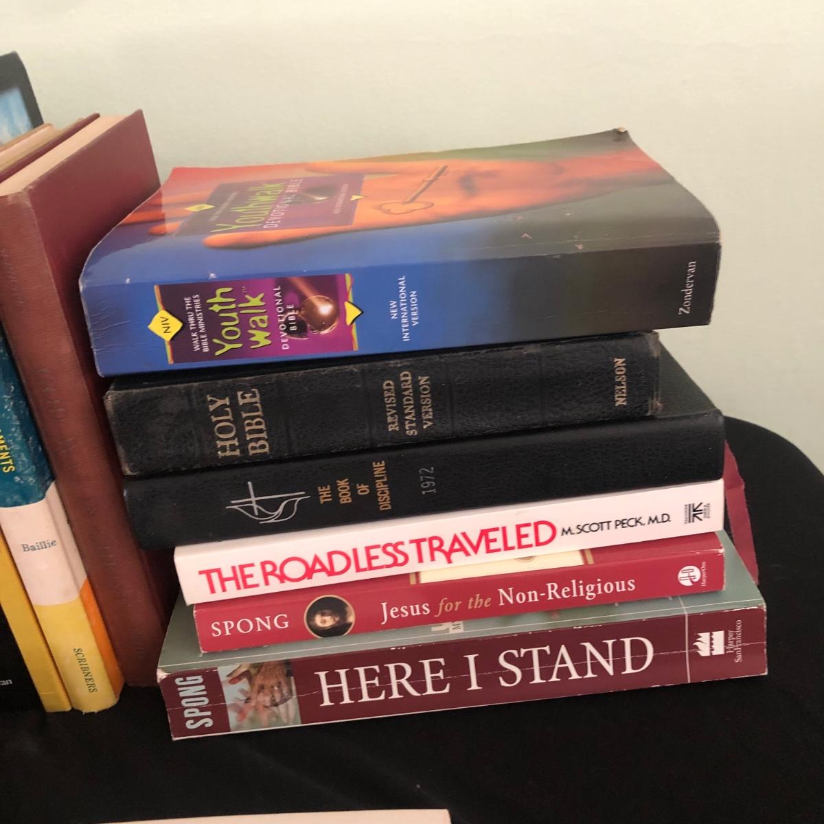 Lot includes 20 hardback books and 14 soft cover books. Book authors include theologians such as, Paul Tillich, John Spong and other authors such as, C.S. Lewis, Bill Moyers and Scott Peck. There are leather bound Bibles included. Local pick up only.
