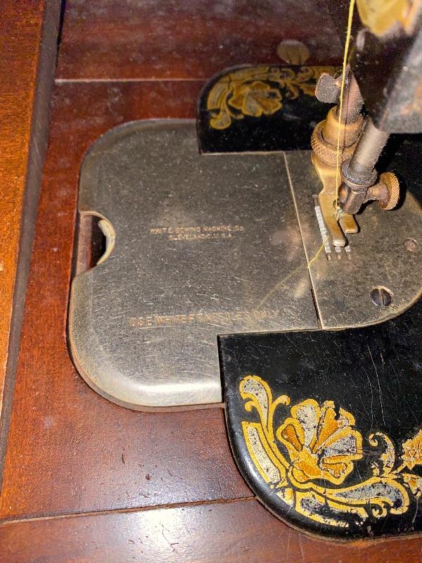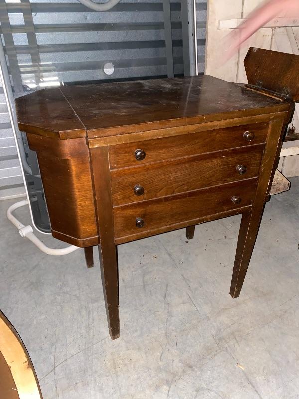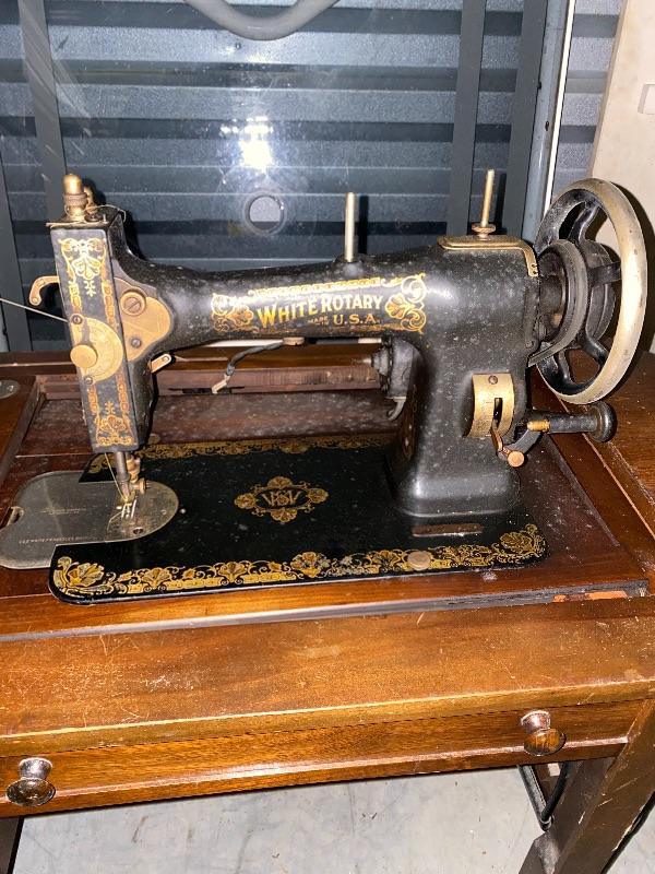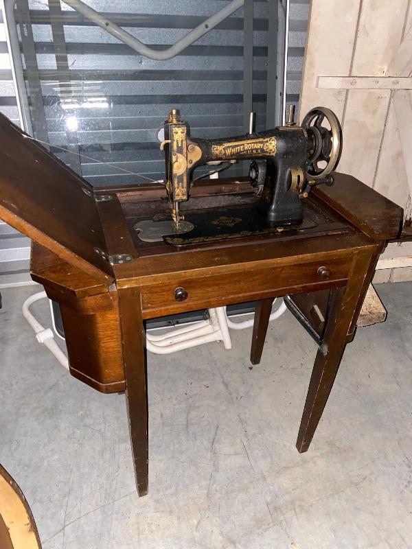 White Rotary sewing machine with sewing table. Beautiful machine in great condition. Unable to test if working condition. Sides of table open. 32.5”w x 17”d x 31”h