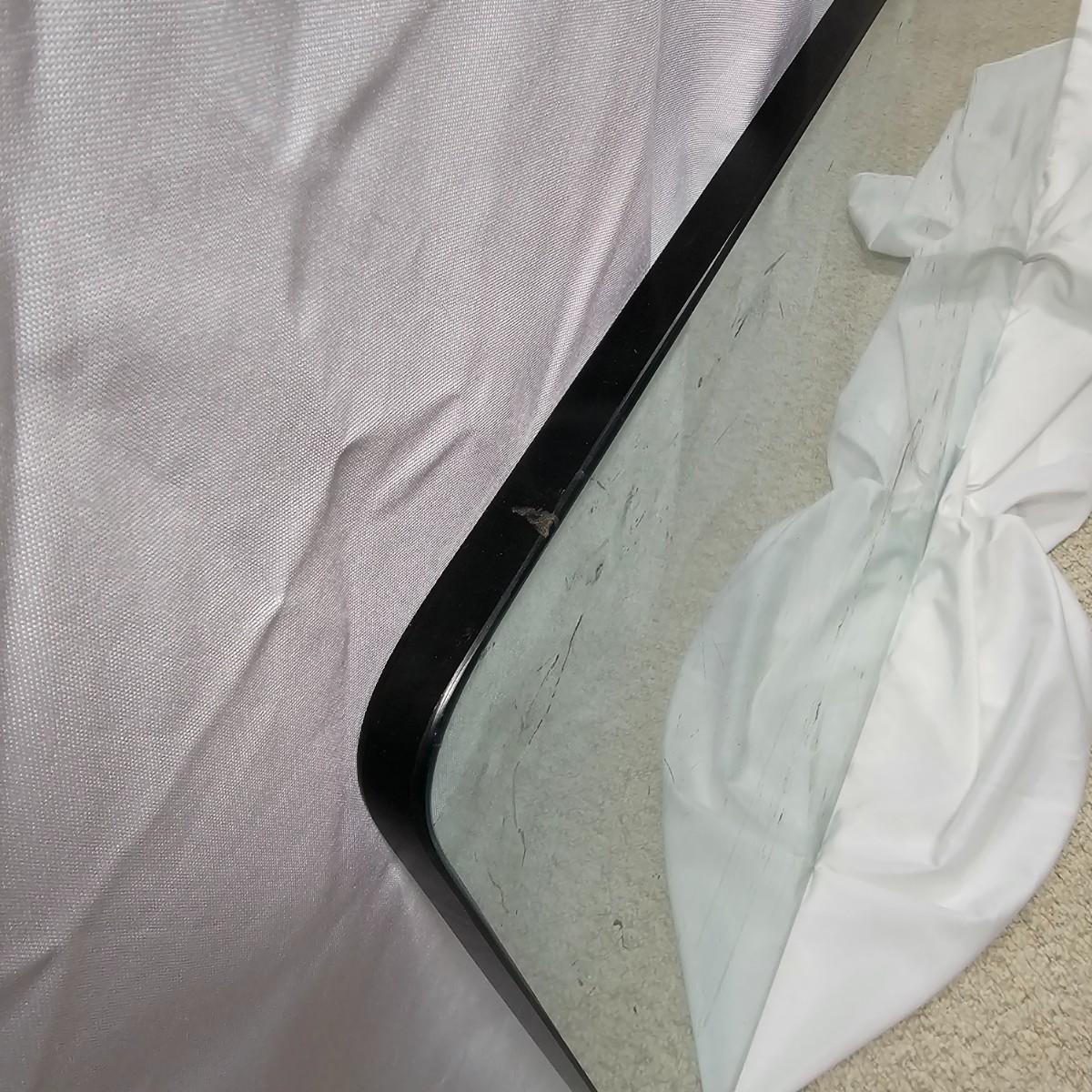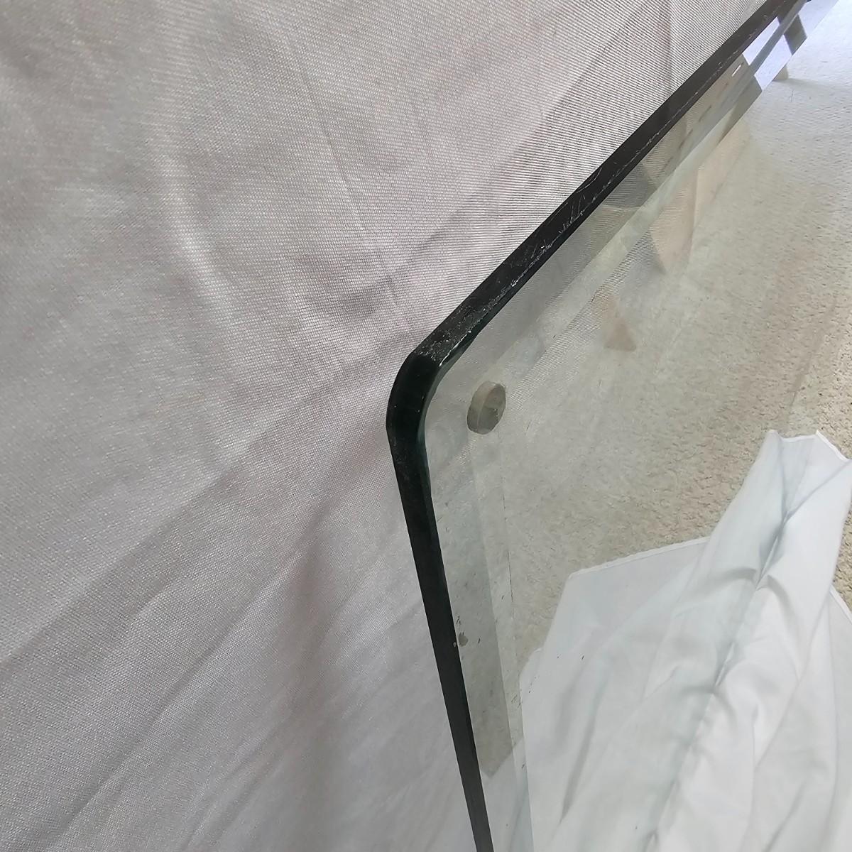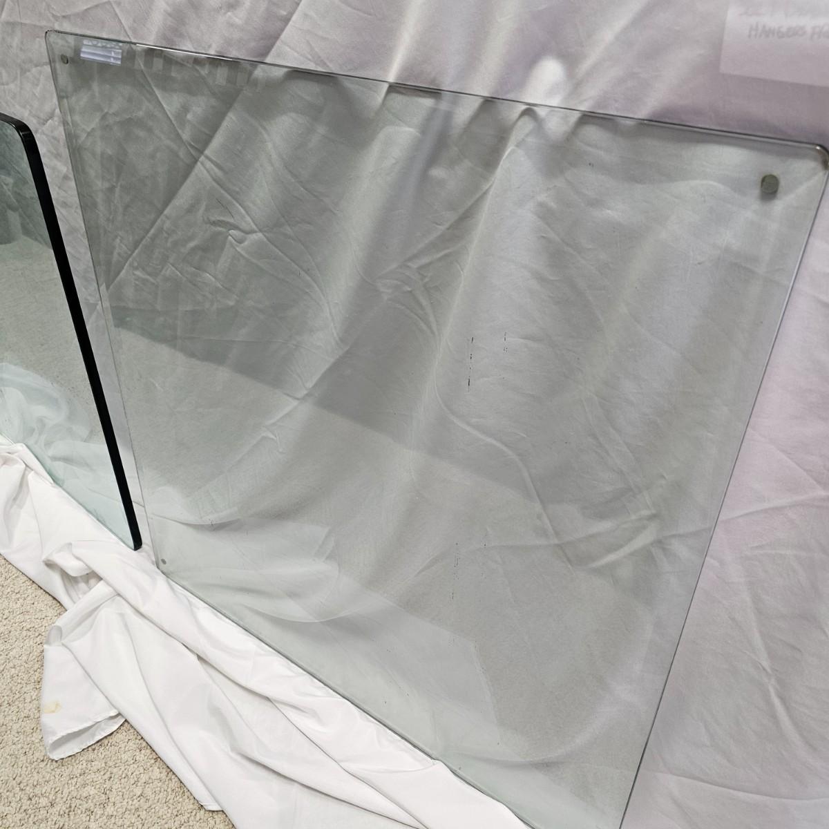 Two.large tempered glass tabletops for desk or other uses. Large lass measures 3/4" thick, is 48"W x 33"D and has beveled edges. Some minor scratches on surface of both items. Smaller piece is 3/8" thick and 38"square. See photos for details. Local pickup only.. Winning bidder must bring assistance to help move and load this item due to its weight and/or size. These items are located in the basement with a flight of stairs or alternatively a garden path with approximately 15 steps that can be used to go around the side of the house. Bring additional help to move them.