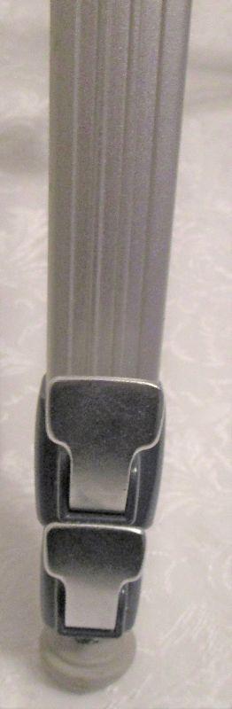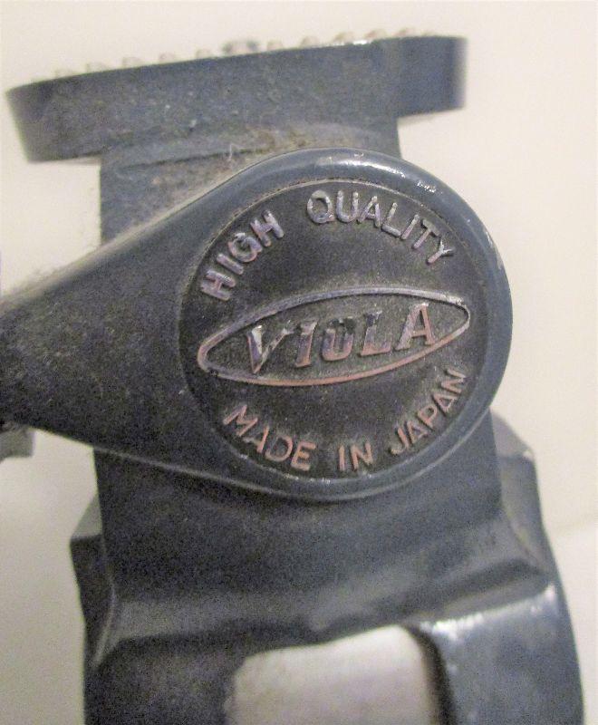 Vintage camera tripod that functions perfectly. Viola model 3CLBL, Label reads 'High Quality Made in Japan'. The legs have three sections, that lock together with sturdy clips. All the clips work perfectly and stay tight. The feet have screw-on rubber tips that can be retracted to reveal a metal point, depending on the terrain. 22" high to total extension 62"