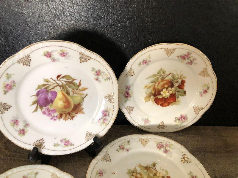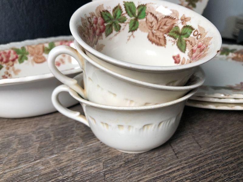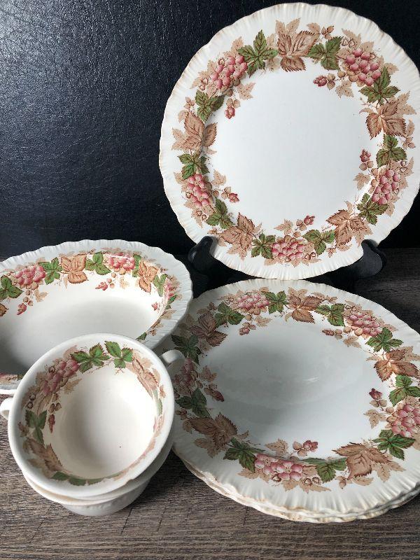 Barlaston of Etruria . Made in England Wedgwood Dishes. Lot includes four plates, serving bowl and three teacups.