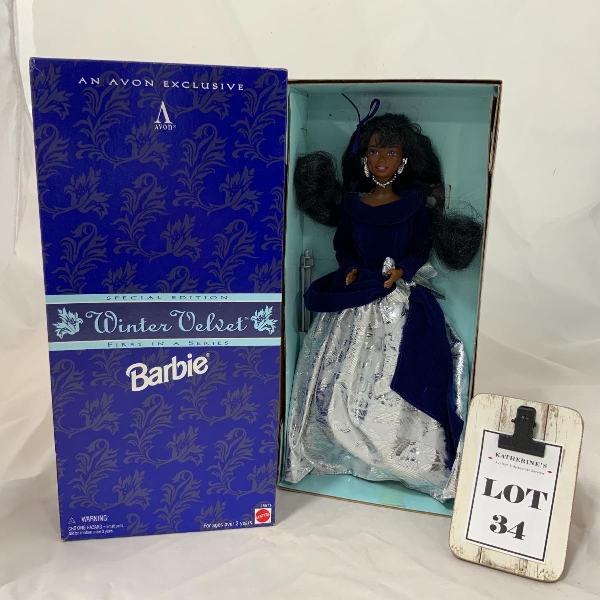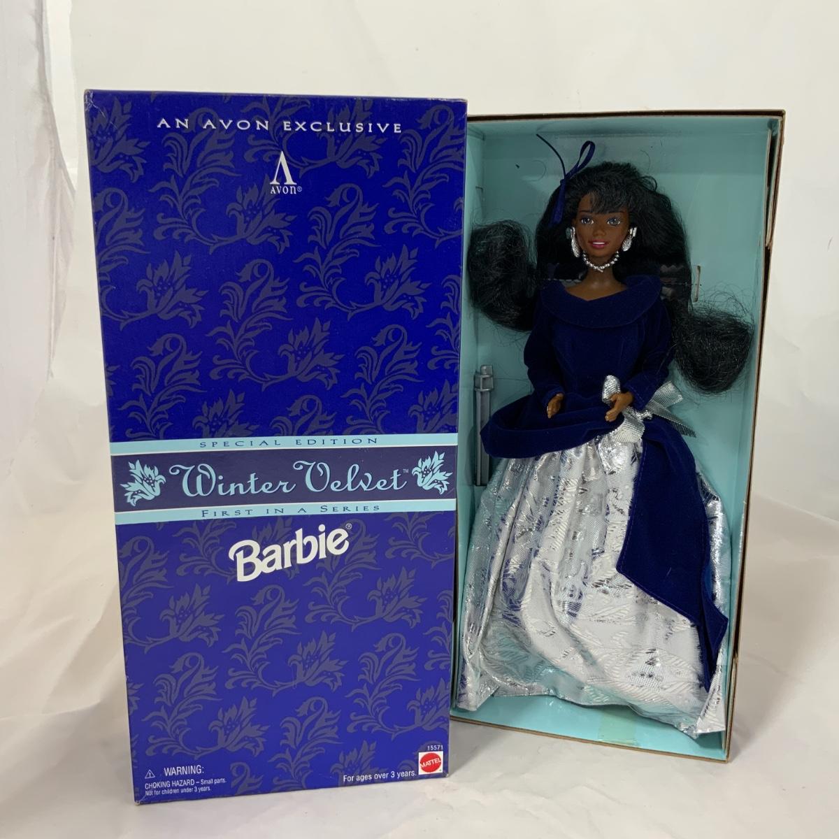 A beautiful Winter Velvet Barbie, released in 1995. Put out by Avon, an exclusive Barbie. She is new, in box. The box lid label does not match the Barbie itself, pictured. Please see photos for details and condition. !!! Proceeds from this auction will be donated to the NEW COMMUNITY SHELTER in Green Bay, Wisconsin. Please see Sale Description to the Left for more information. !!! ::: Shipping is available on this lot. If you require shipping you must let us know at the close of the auction. We will coordinate with you after the item has been won. Shipping fees will include insurance up to or exceeding the value of all items being mailed. If you have any questions regarding this lot please contact the auctioneer either via this website, by direct email or by phone. PICK UP TIMES and other important information can be found in the TERMS and DESCRIPTION of the auction. Please take a look for pertinent information. Thanks!