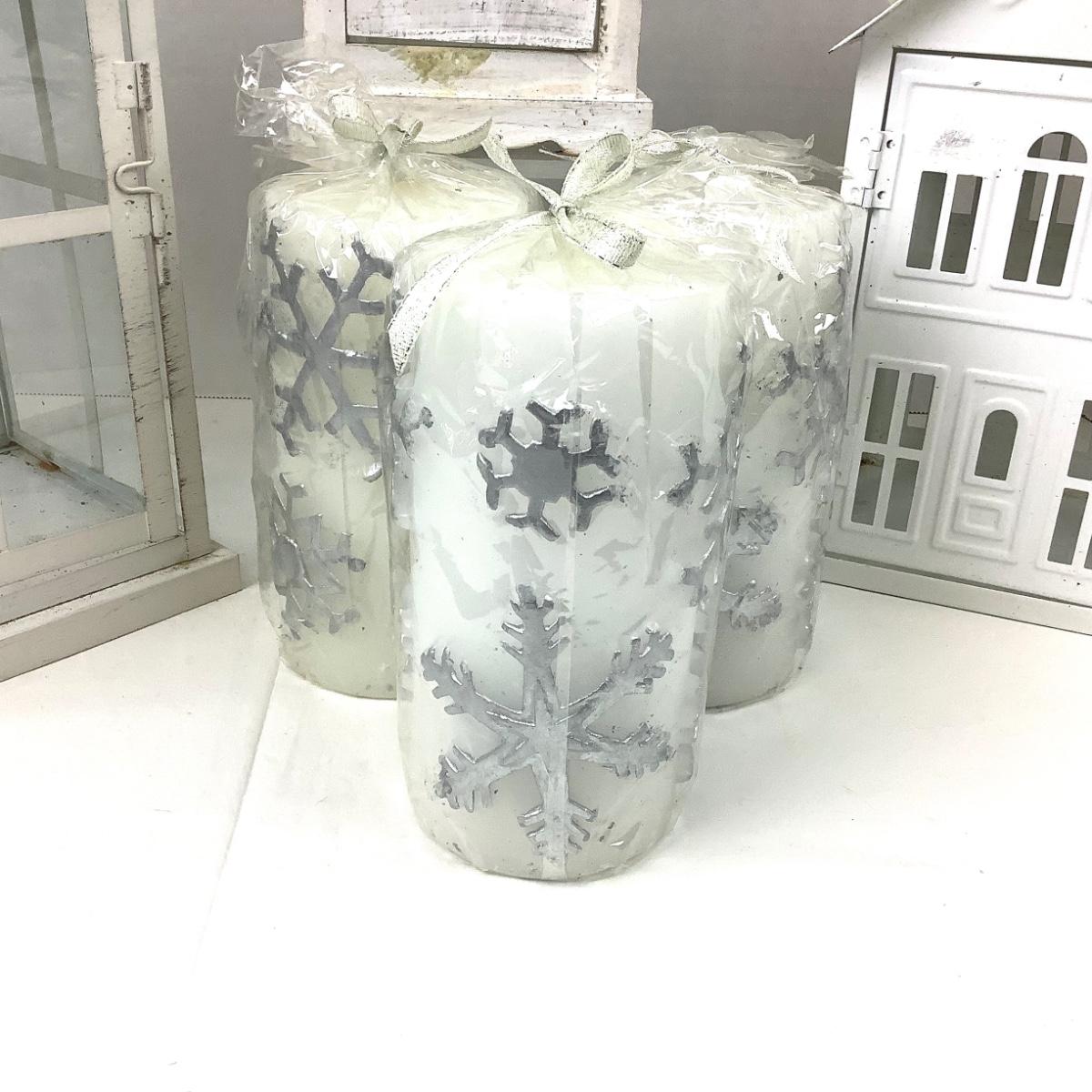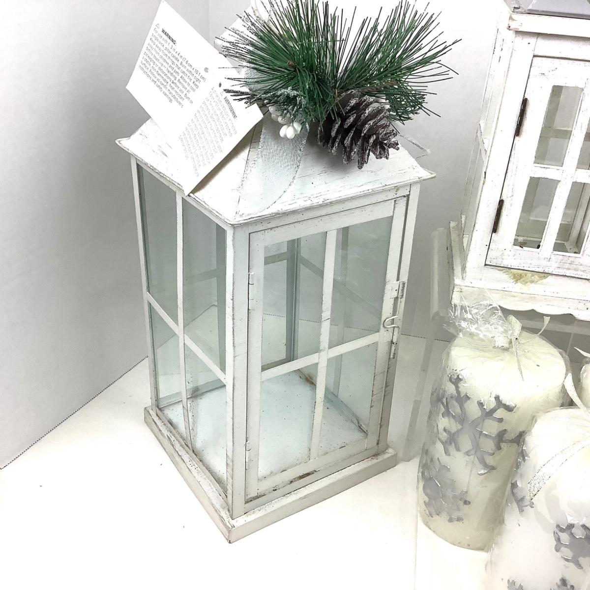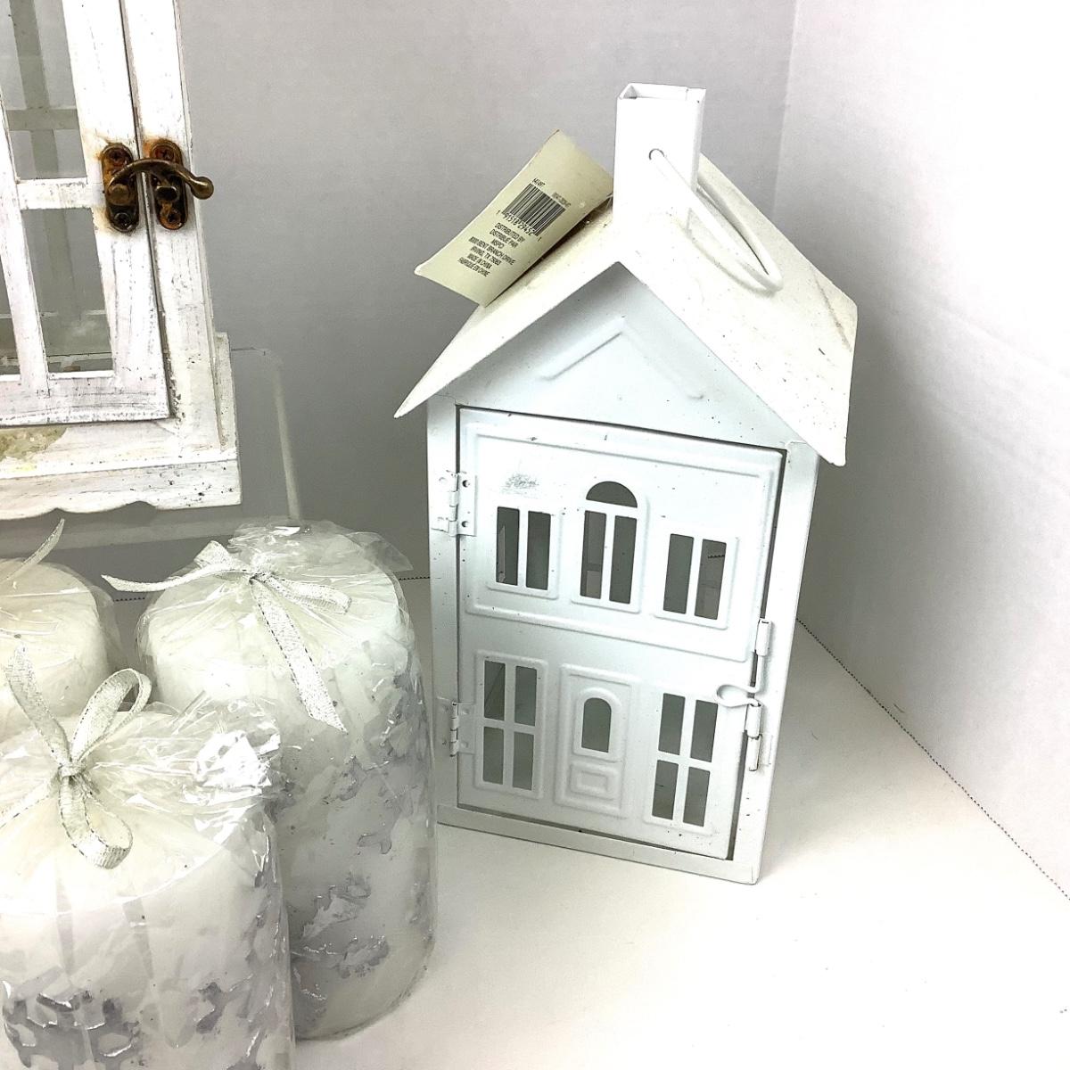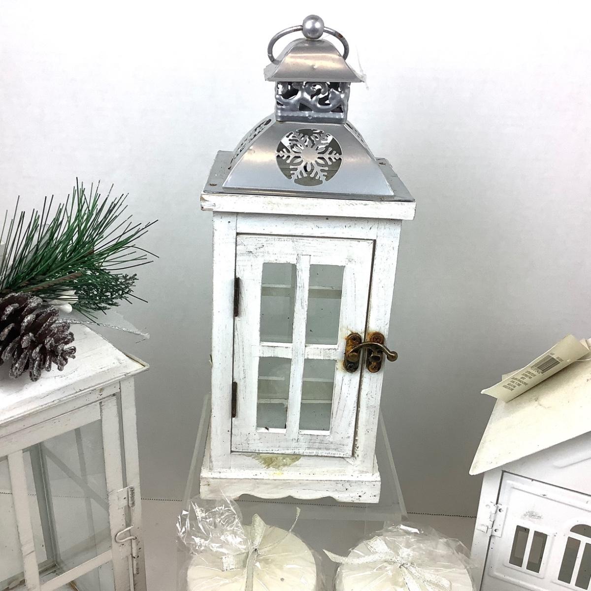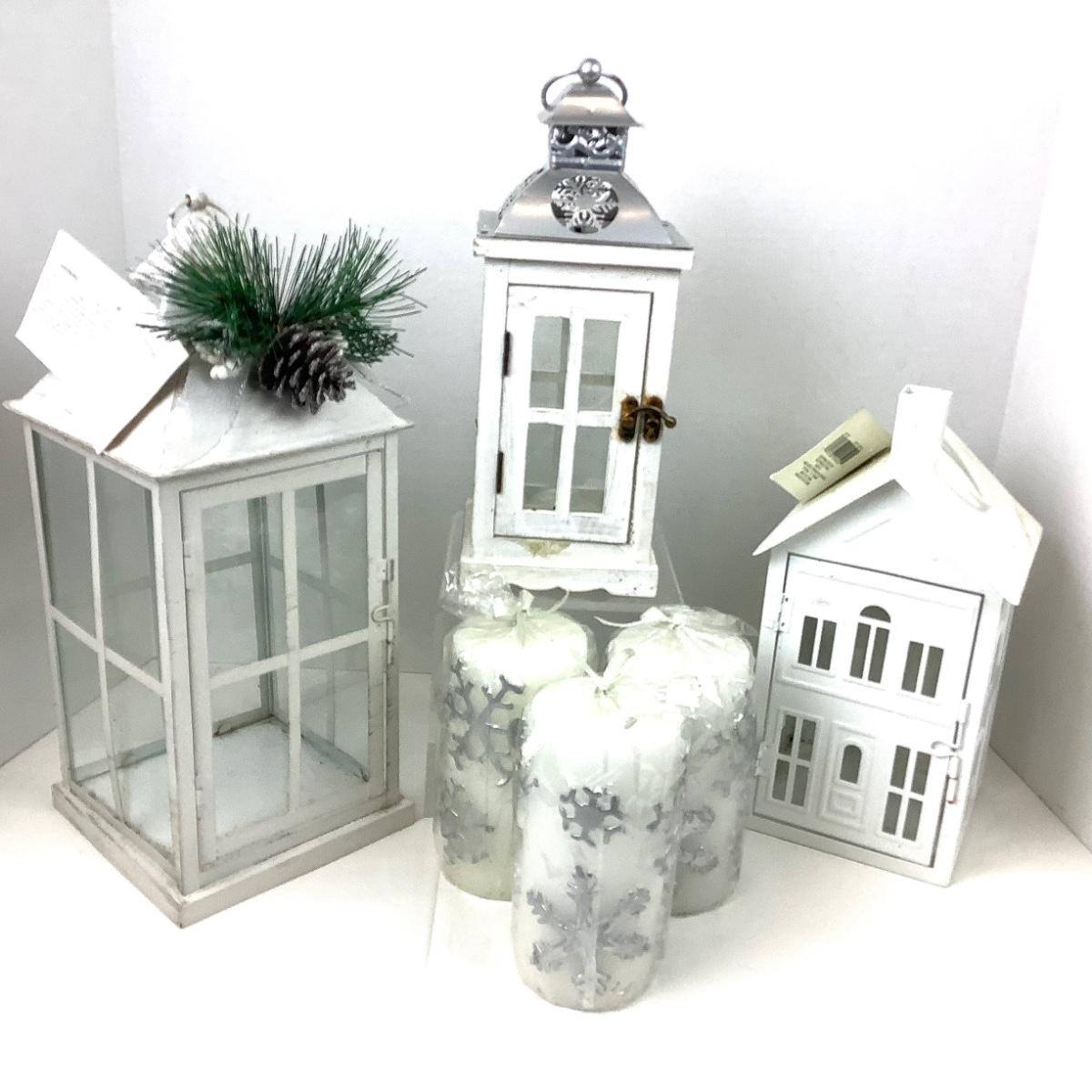 There are 3 lanterns in the lot for candles, there are 3 new white candles with silver snowflakes. The lanterns are 14" x 6", 10" x 6", 12" x 4". The candles are new and measures 6" x 3".