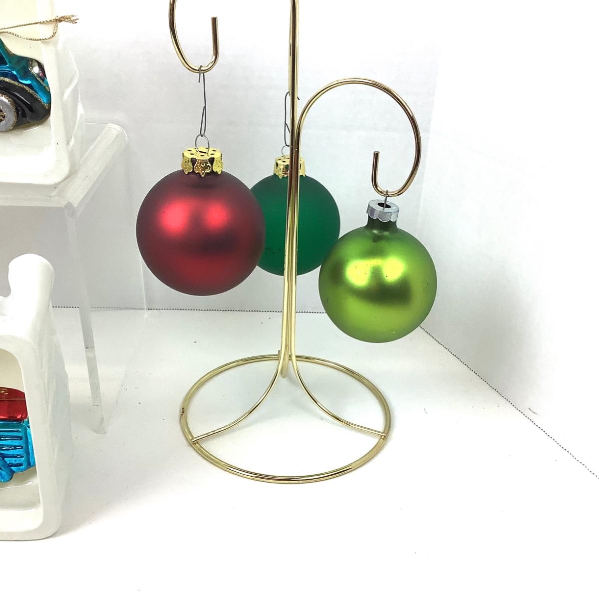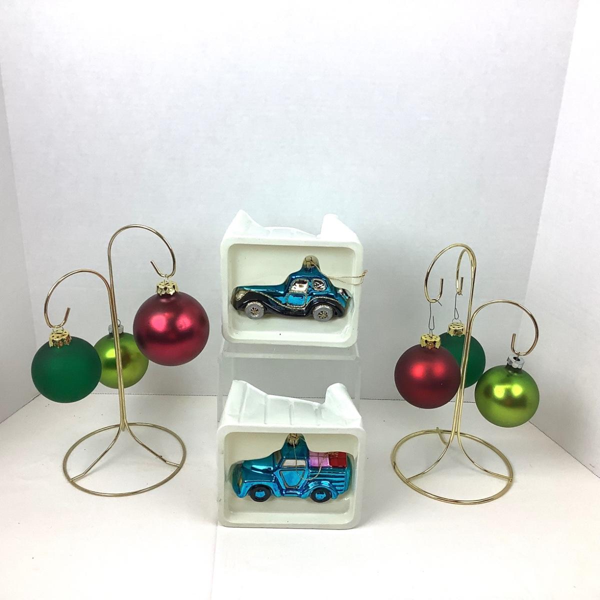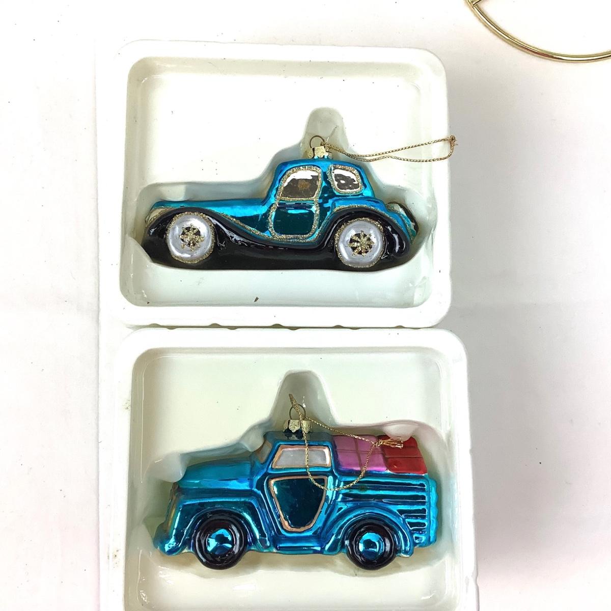 There are 2 handblown blue vehicles that measure 5" x 2", assorted 6 glass red and green glass ornaments.
