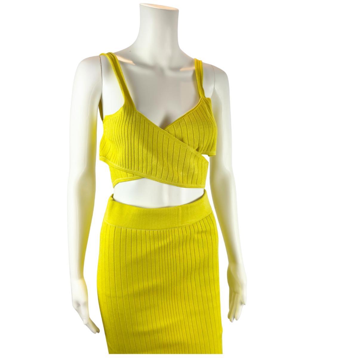 Eleagant and vibrant yellow rayon set featuring a crossover bra top and a sleek, high-waisted skrit. Perfect for an evening out or a stylish event.
