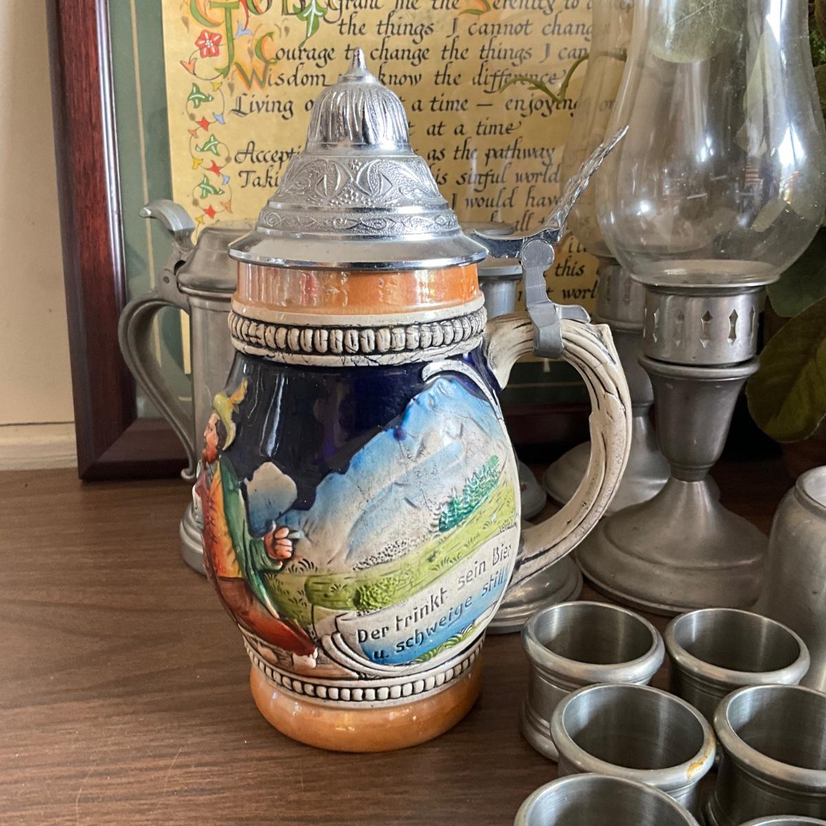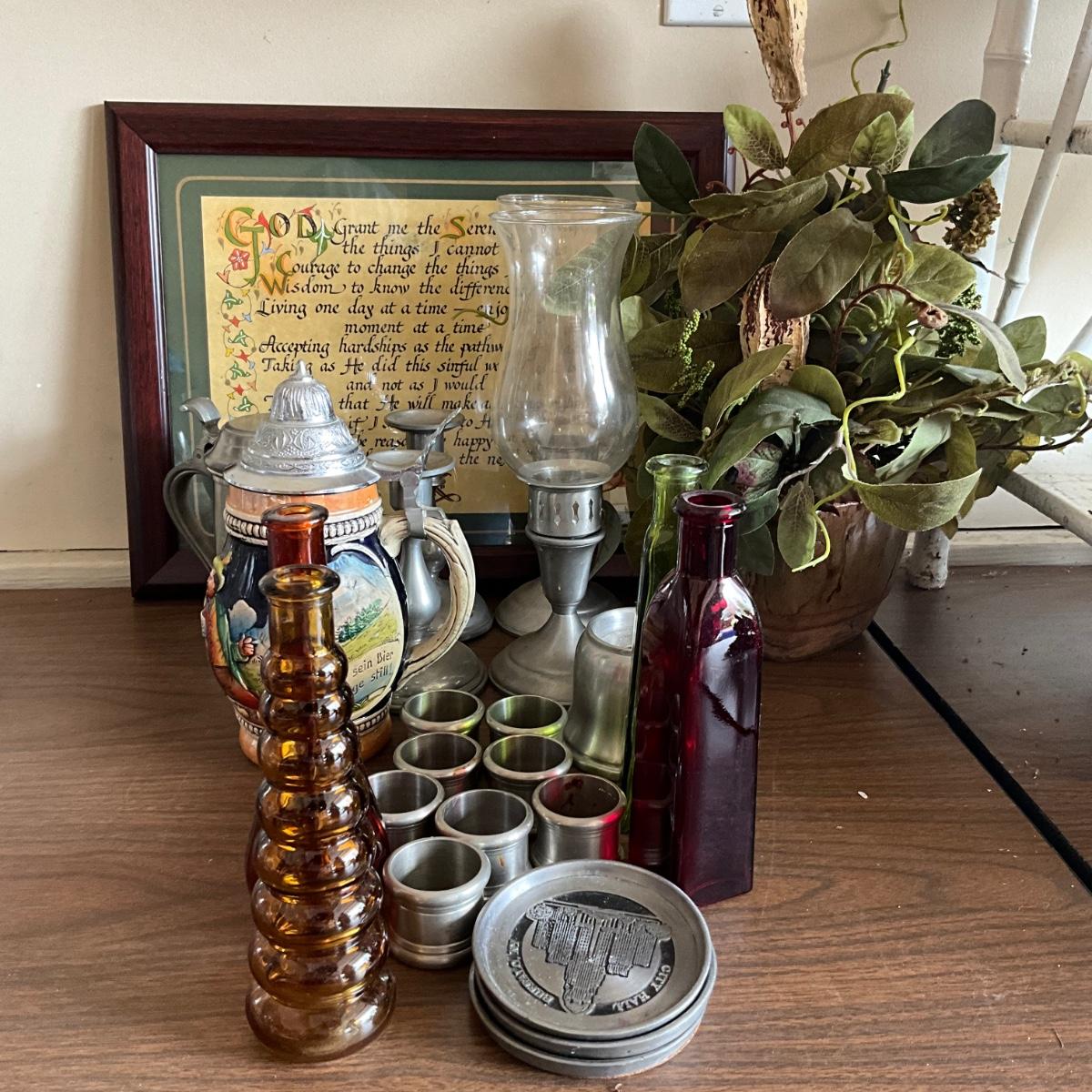 Stein, pewter coasters and napkin rings, faux arrangement and more.