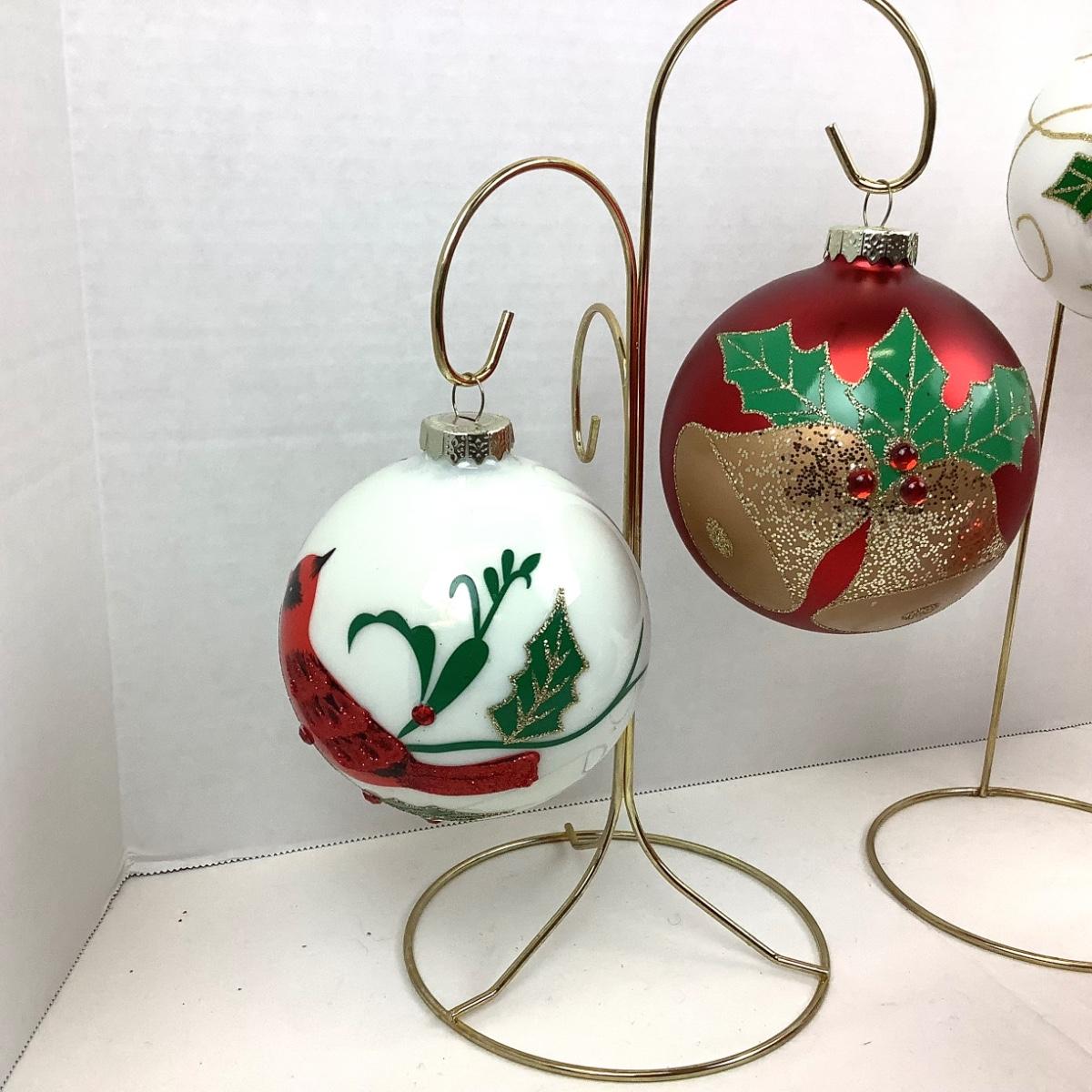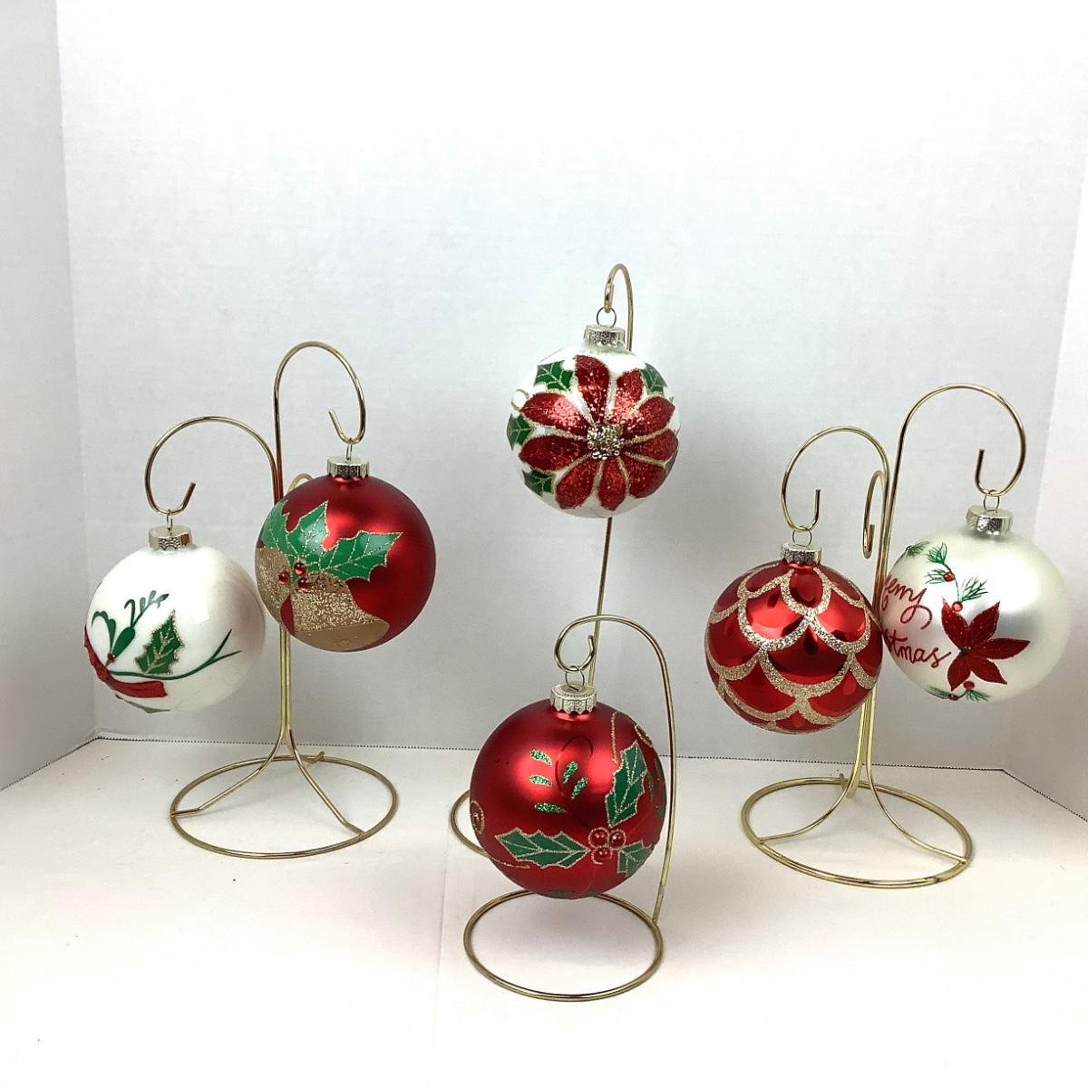 There are 6 ornaments in the lot, glitter-glass, statement ornaments. They are 4" in diameter.