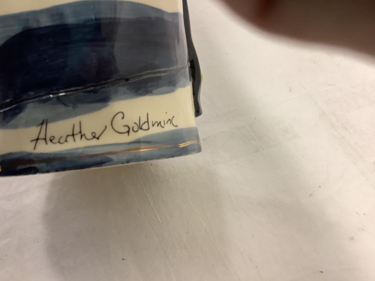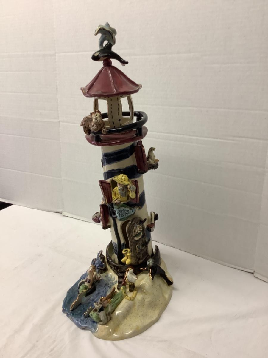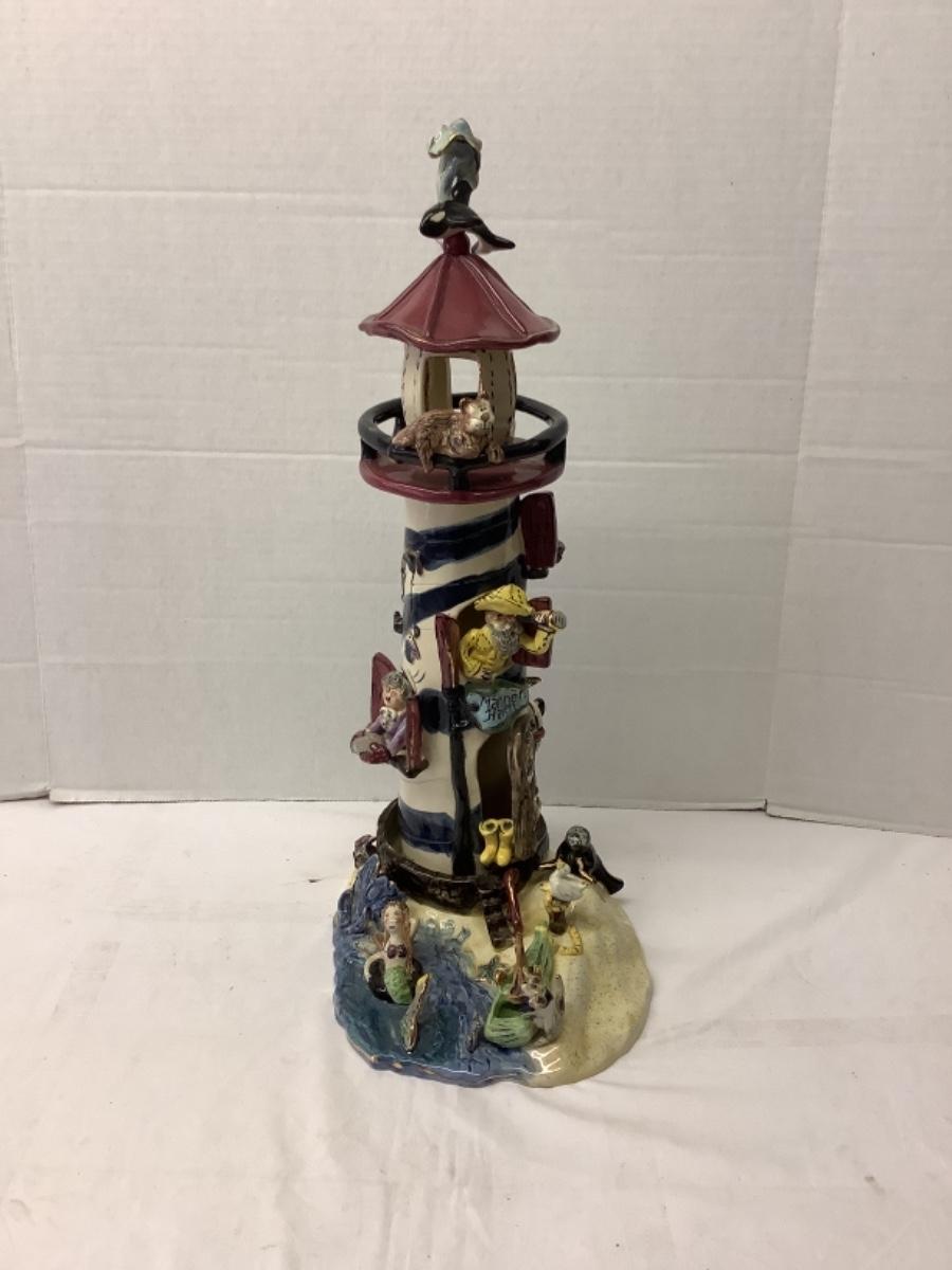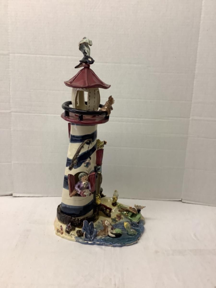 346. Clayworks Blue Sky Signed 2 pc. Ceramic Lighthouse by Heather Goldminc