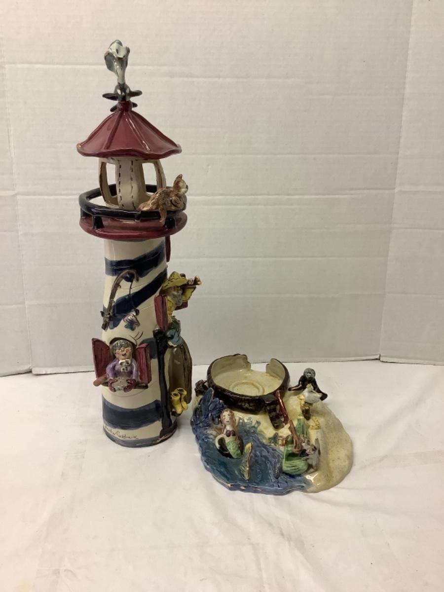 Signed 2 pc Ceramic Lighthouse by Heather Goldminc