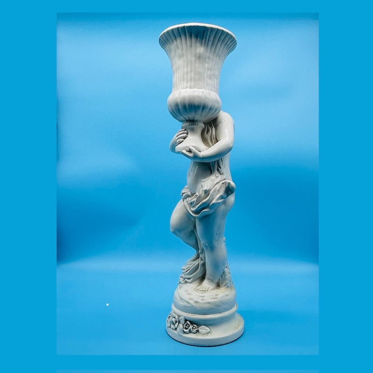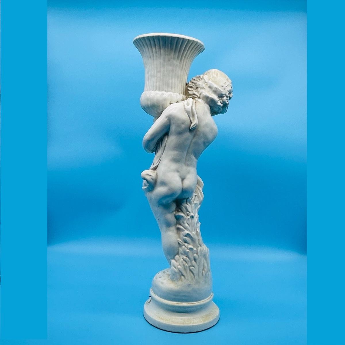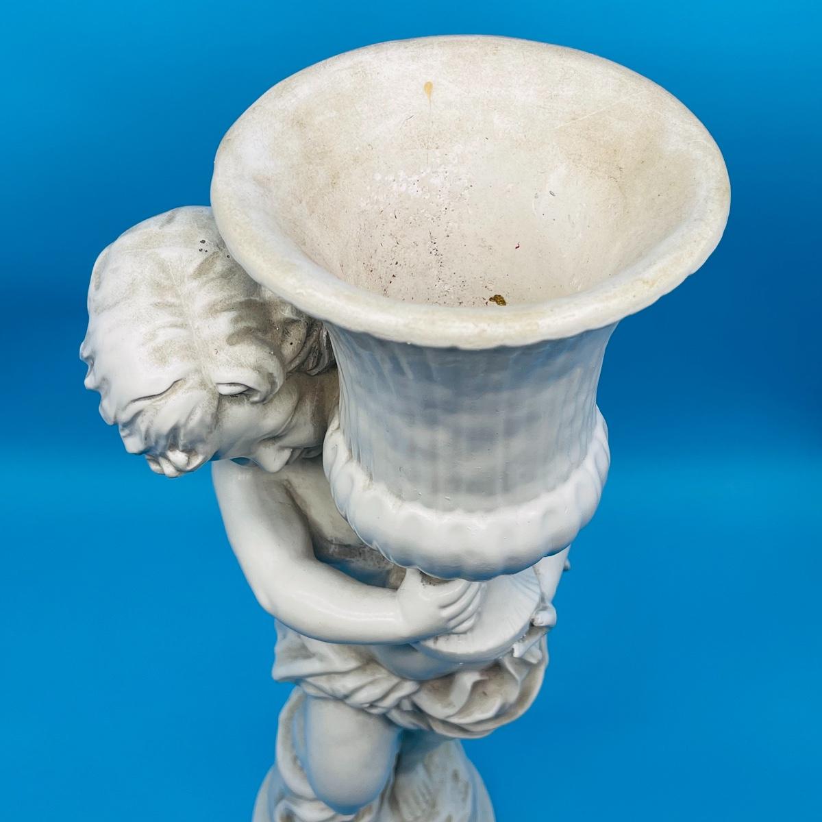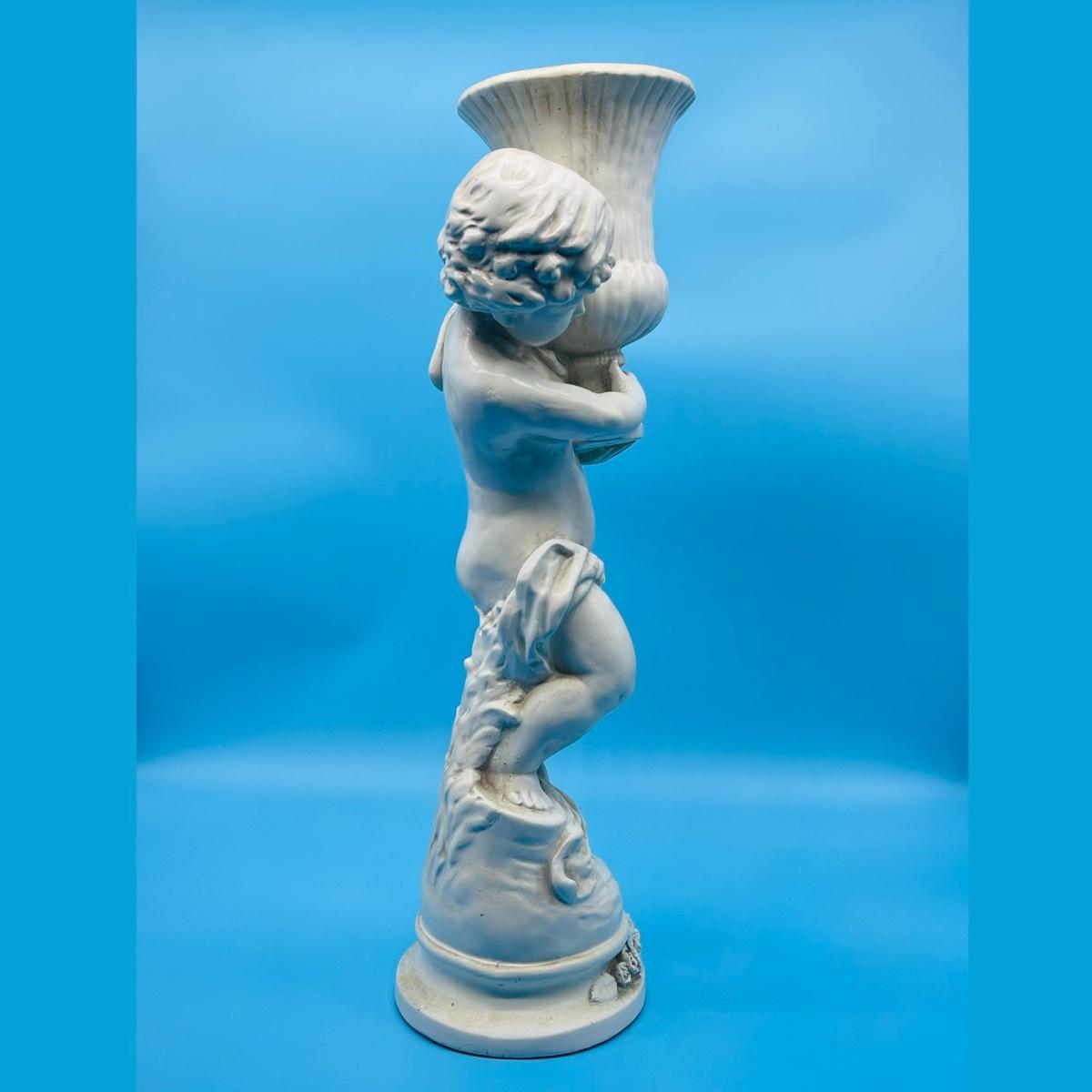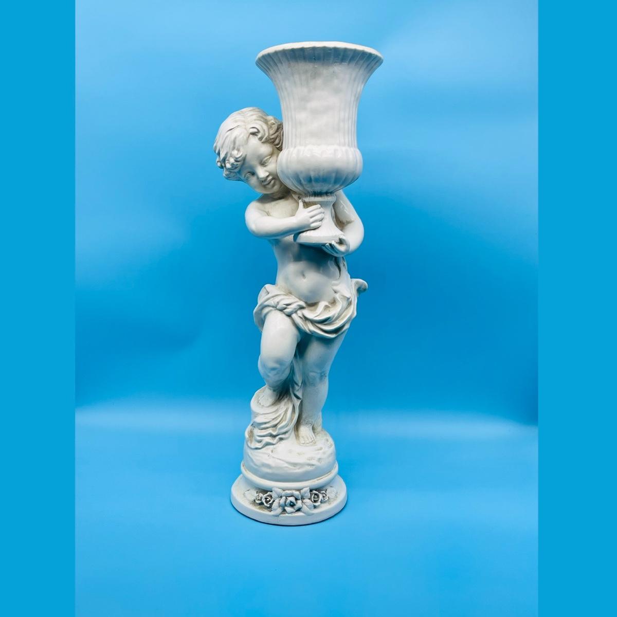 Plaster Cherub holding a vase.
