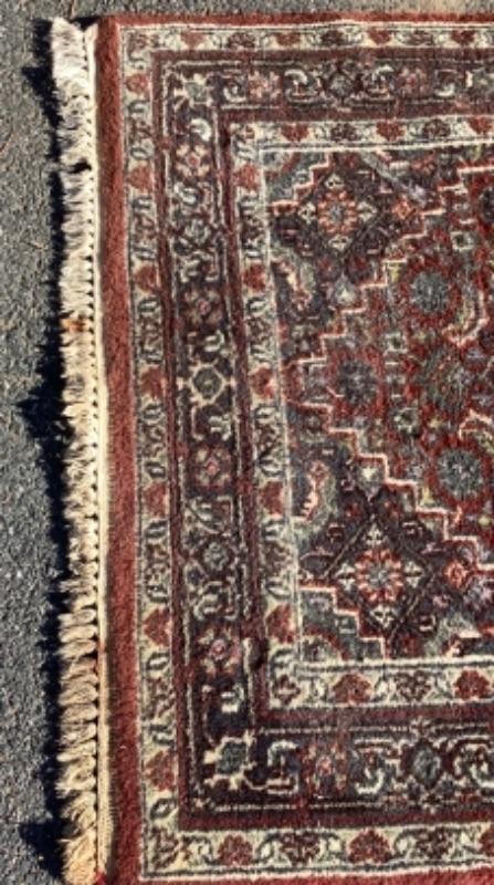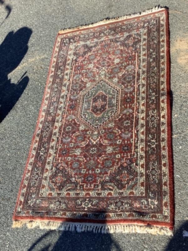 Measures 36-1/2” wide and 63” long, Has a few spots on fringe (see photos)