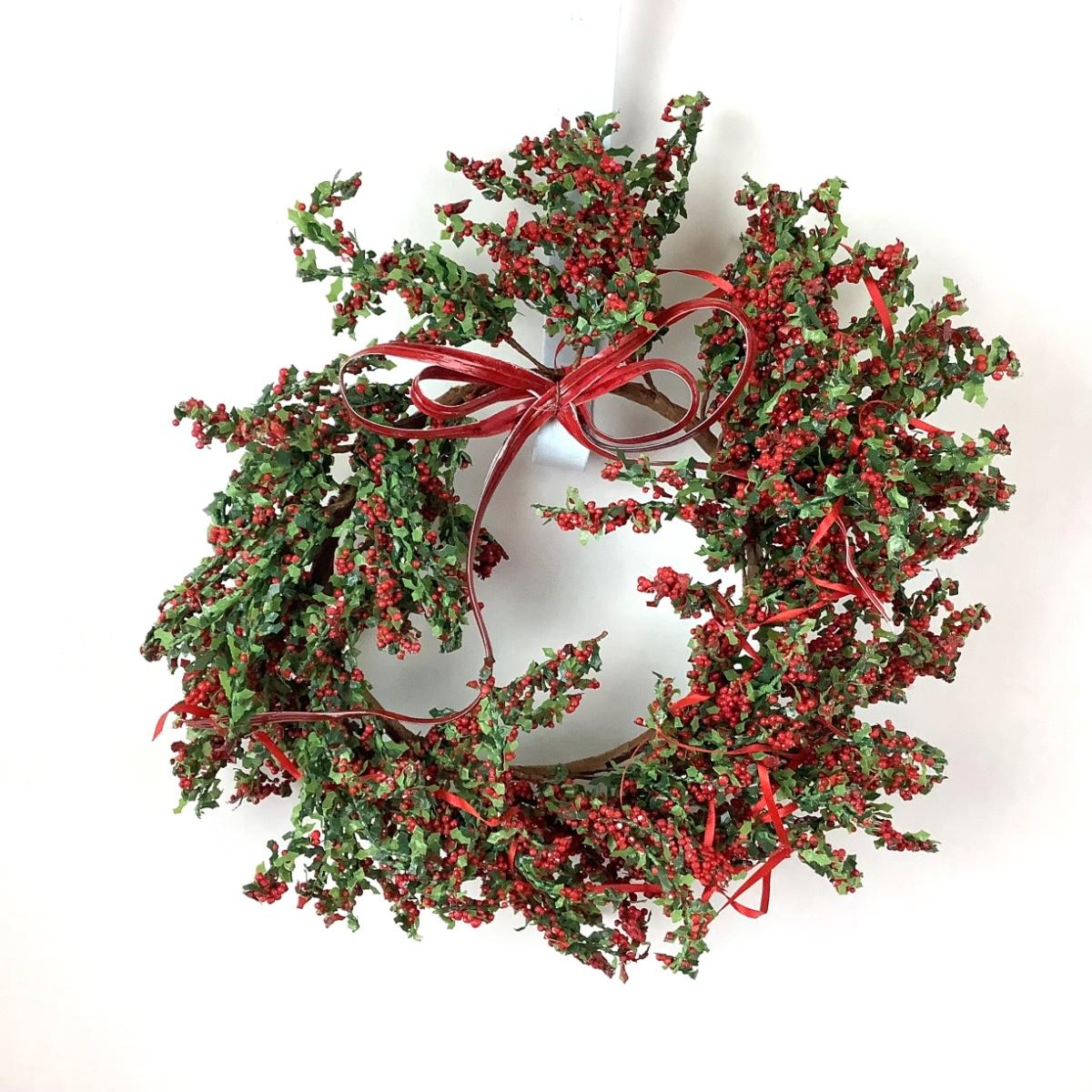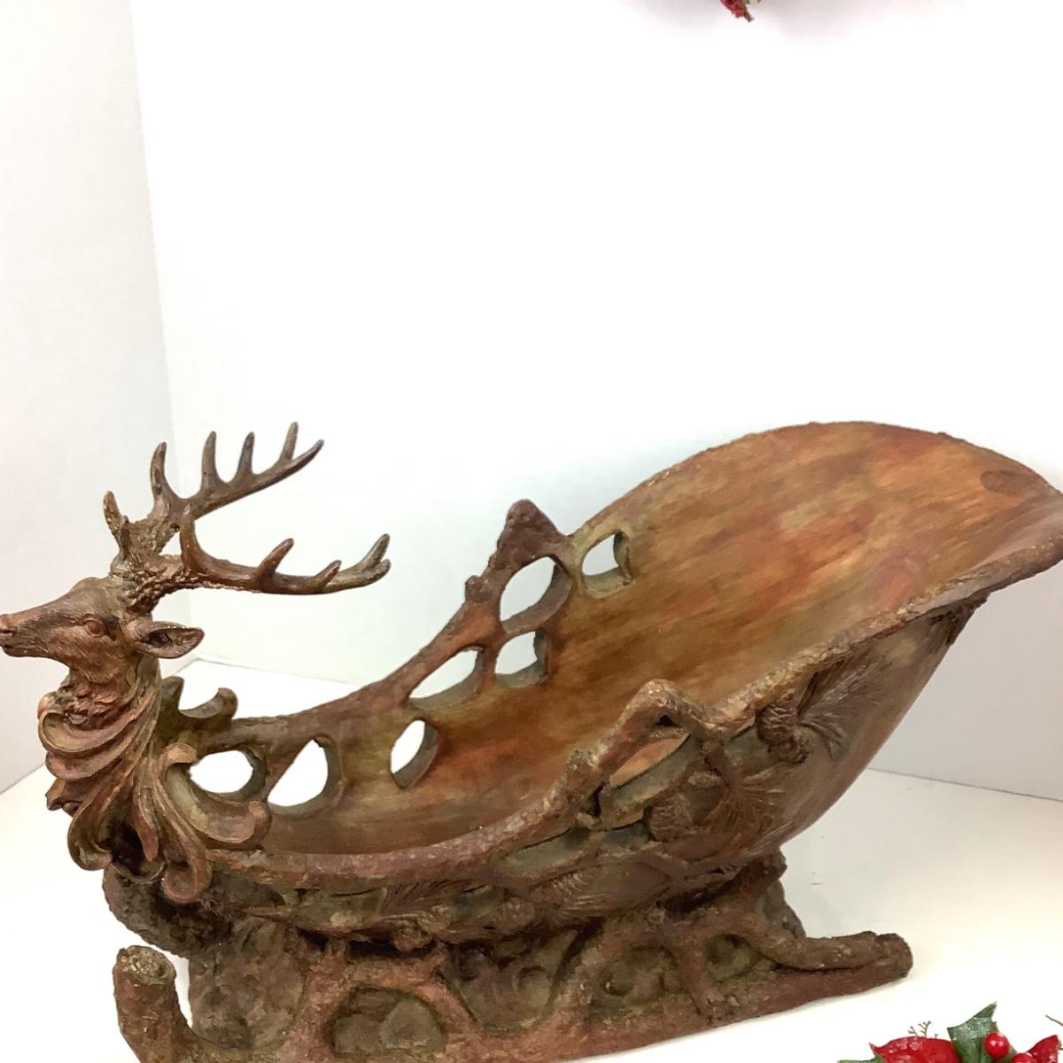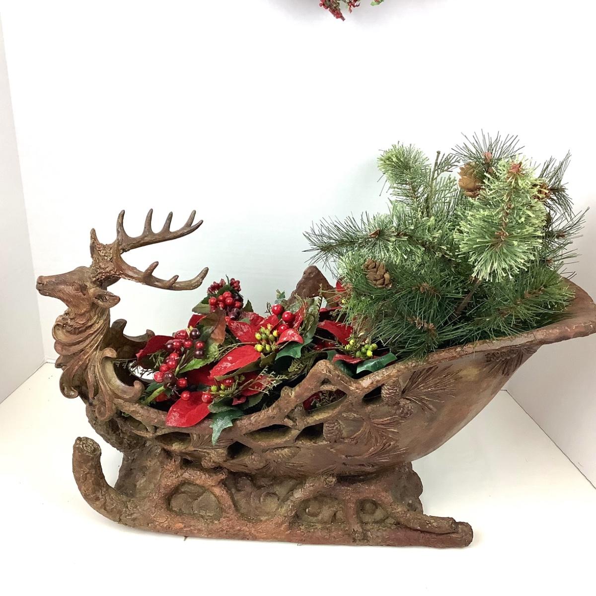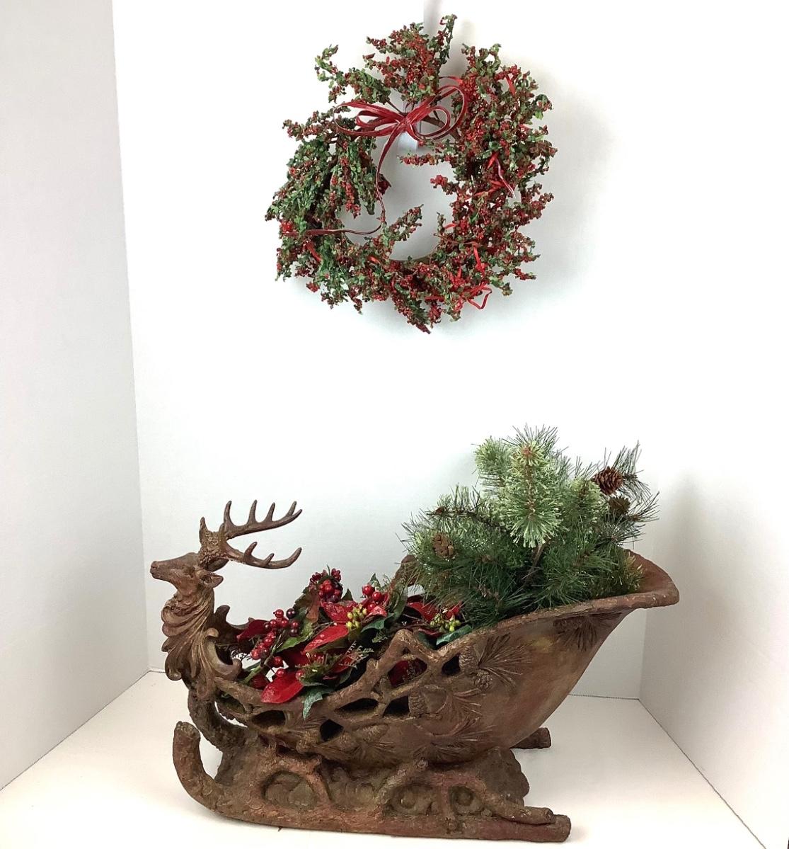 The lot contains a 8" diameter holly berry wreath, composite sleigh, faux greens and 10 poinsettia place card holders. The sleigh measures 20" x 10" x 8".