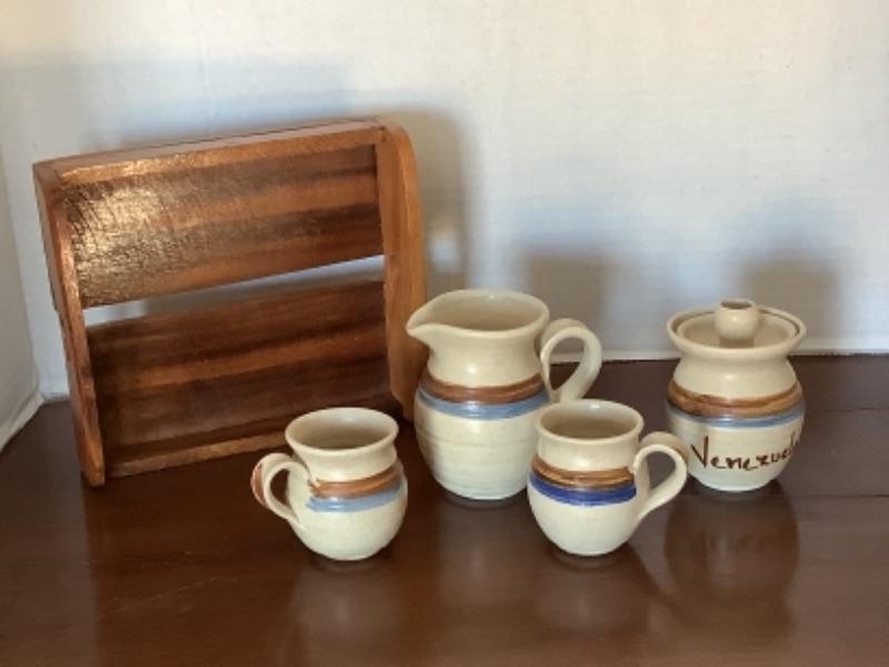Signed pottery cream and sugar with two teacups and wooden tray signed Venezuela ALJ