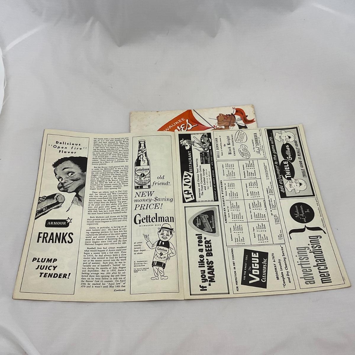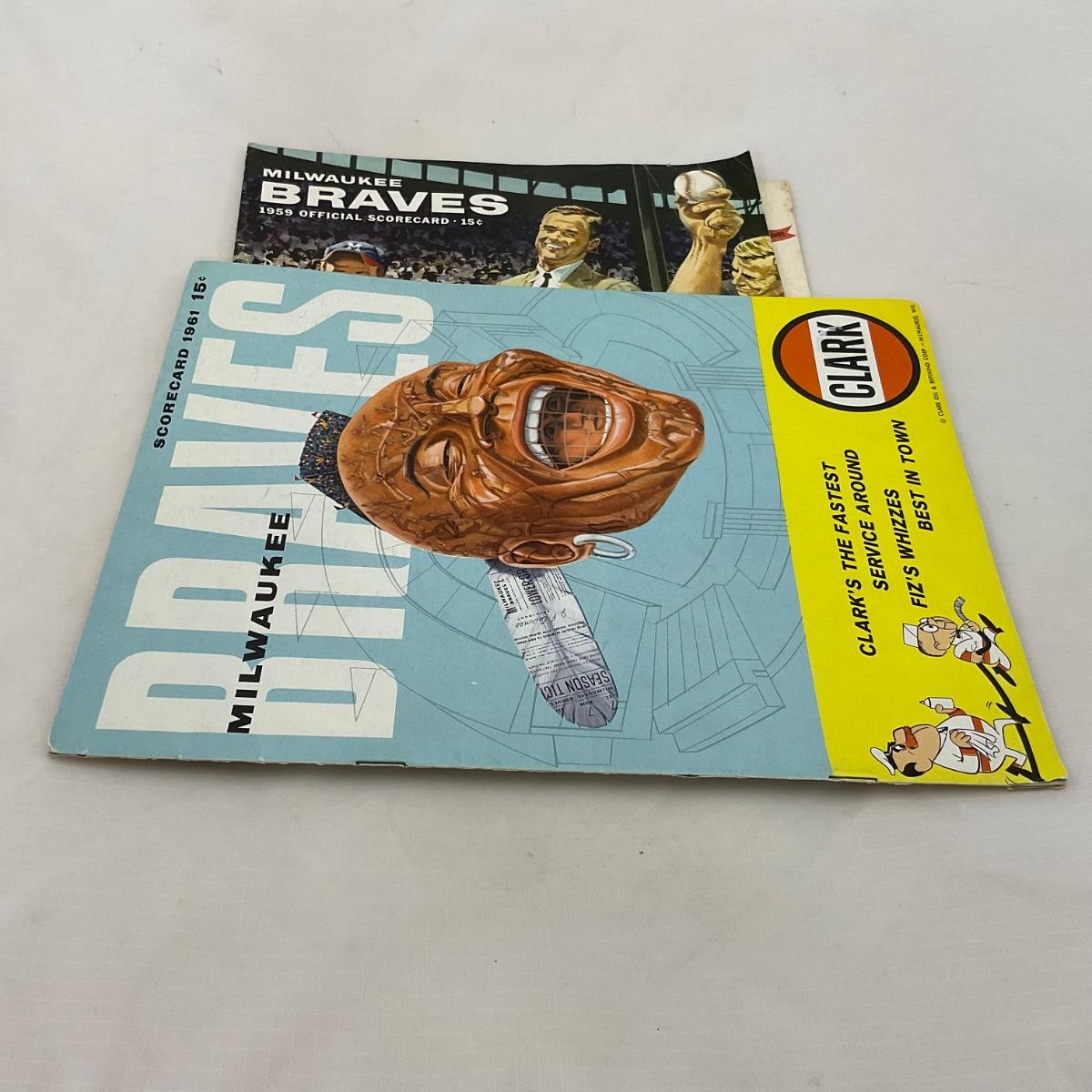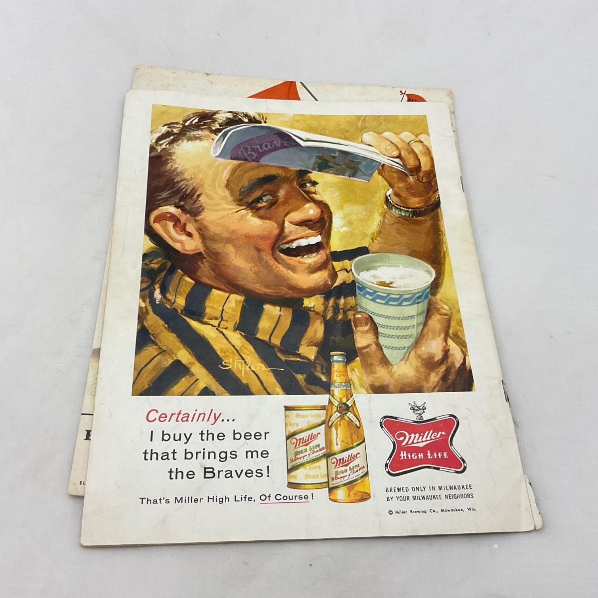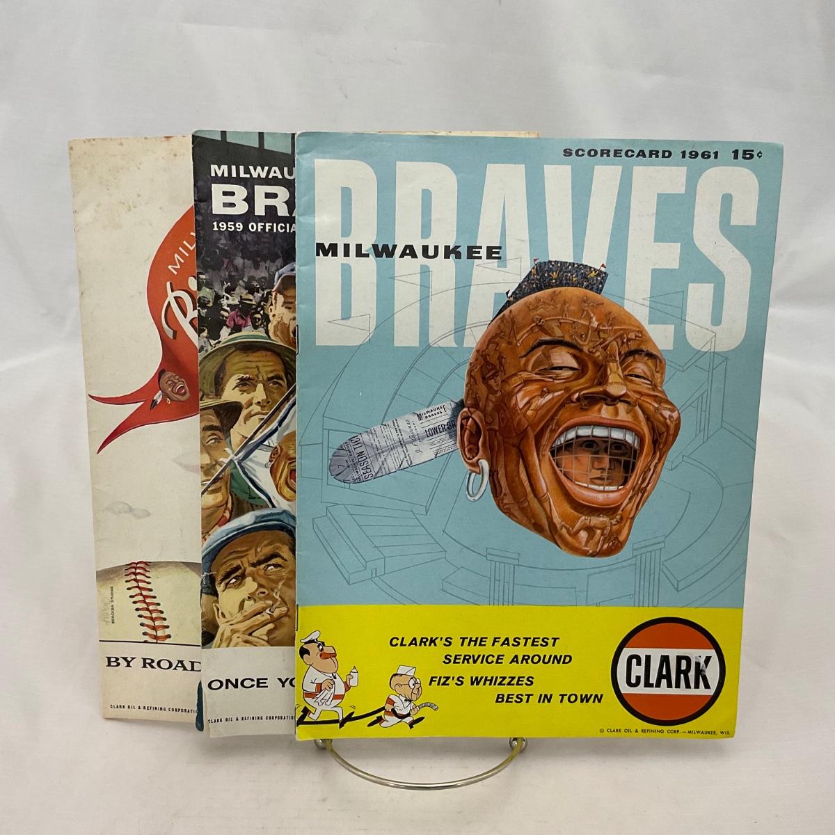 Three Milwaukee Braves baseball programs including years 1958, 1959, and 1961. Slight damage (as pictured). Please see photos for details and condition. ::: Shipping is available on this lot. If you require shipping you must let us know at the close of the auction. We will coordinate with you after the item has been won. Shipping fees will include insurance up to or exceeding the value of all items being mailed. If you have any questions regarding this lot please contact the auctioneer either via this website, by direct email or by phone. PICK UP TIMES and other important information can be found in the TERMS and DESCRIPTION of the auction. Please take a look for pertinent information. Thanks!