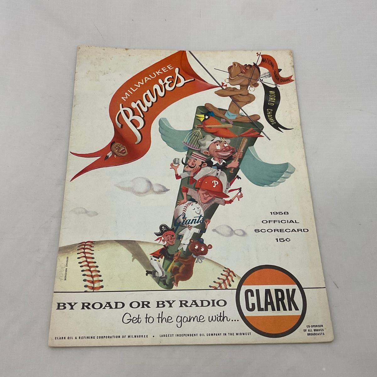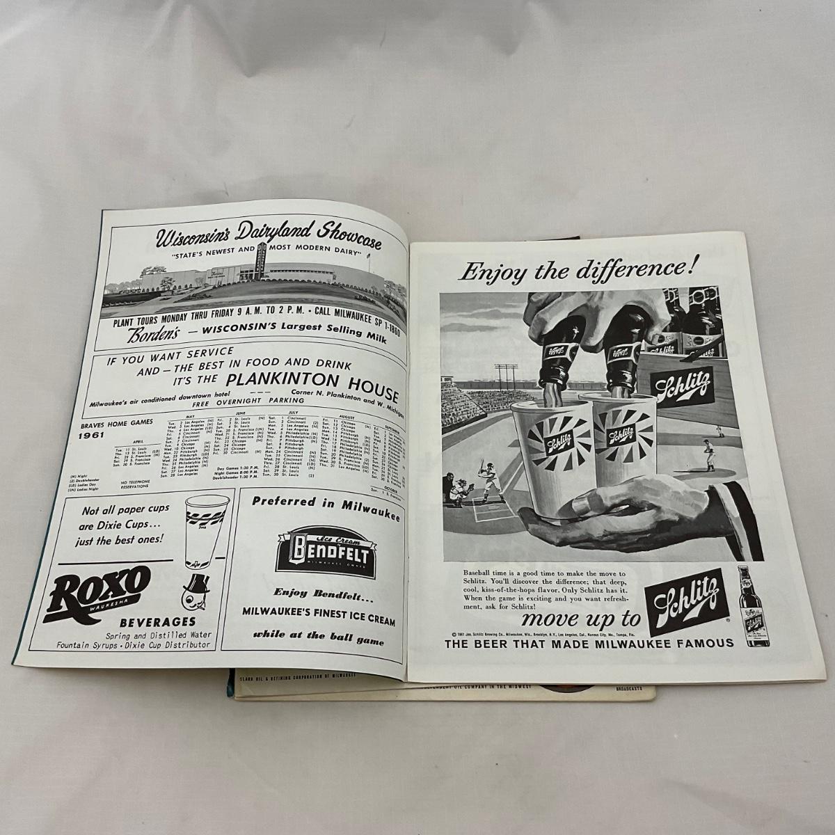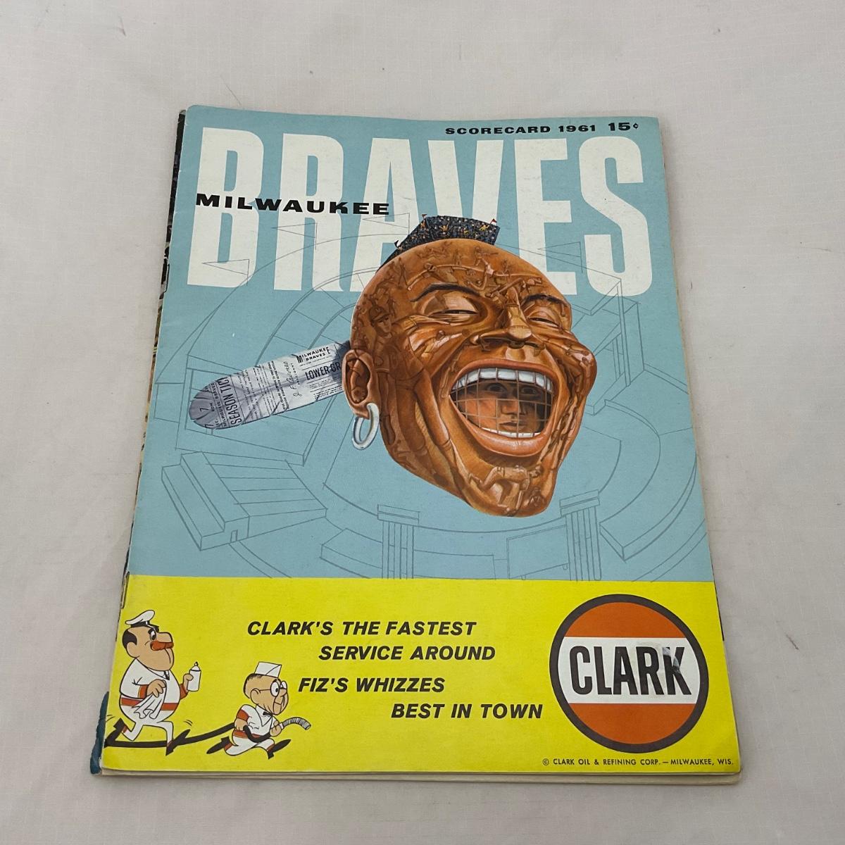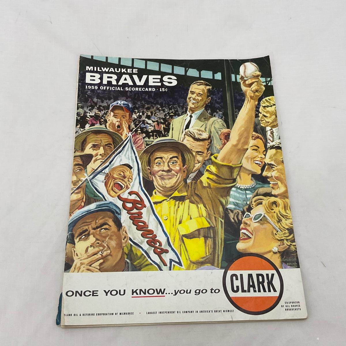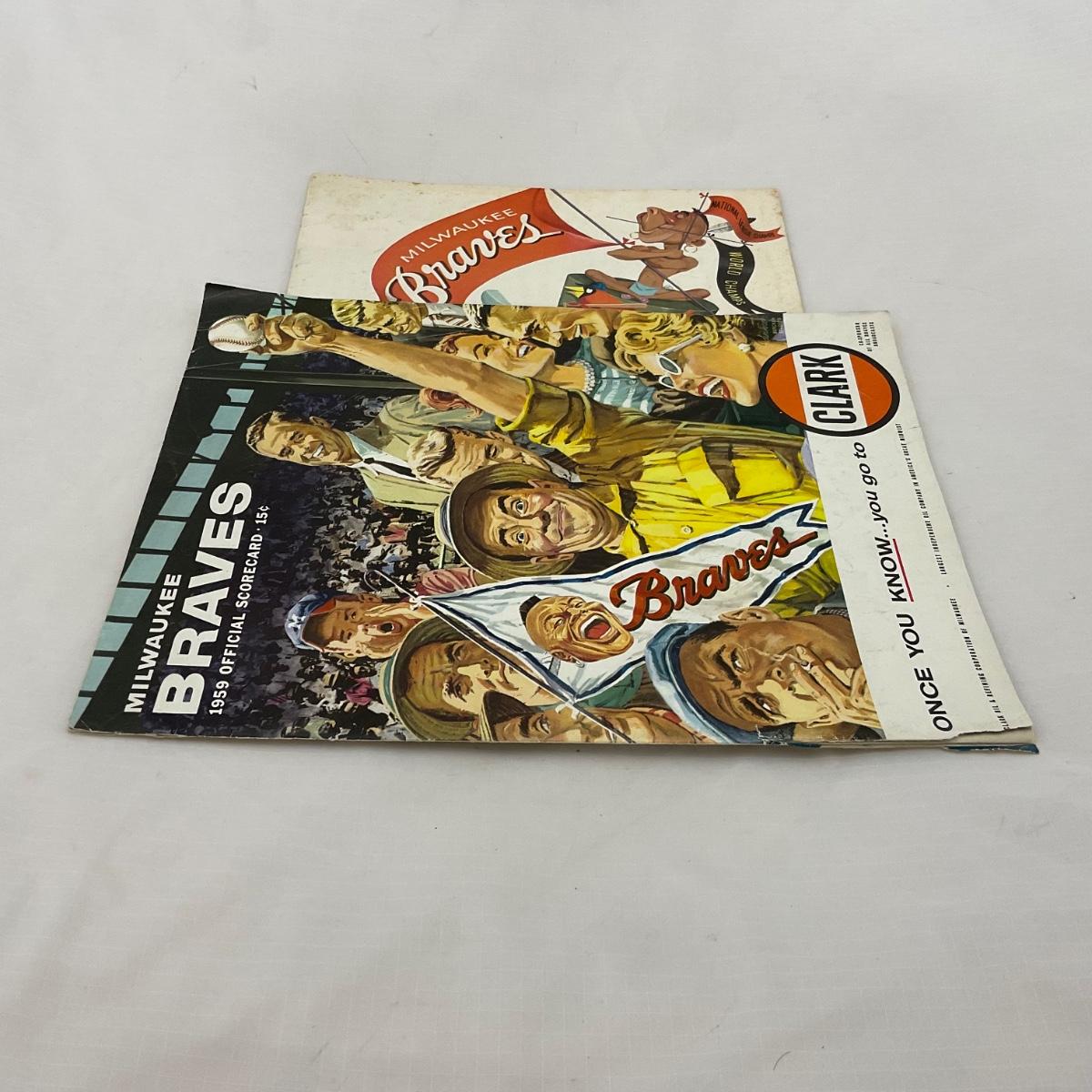 Three Milwaukee Braves baseball programs including years 1958, 1959, and 1961. Slight damage (as pictured). Please see photos for details and condition. ::: Shipping is available on this lot. If you require shipping you must let us know at the close of the auction. We will coordinate with you after the item has been won. Shipping fees will include insurance up to or exceeding the value of all items being mailed. If you have any questions regarding this lot please contact the auctioneer either via this website, by direct email or by phone. PICK UP TIMES and other important information can be found in the TERMS and DESCRIPTION of the auction. Please take a look for pertinent information. Thanks!