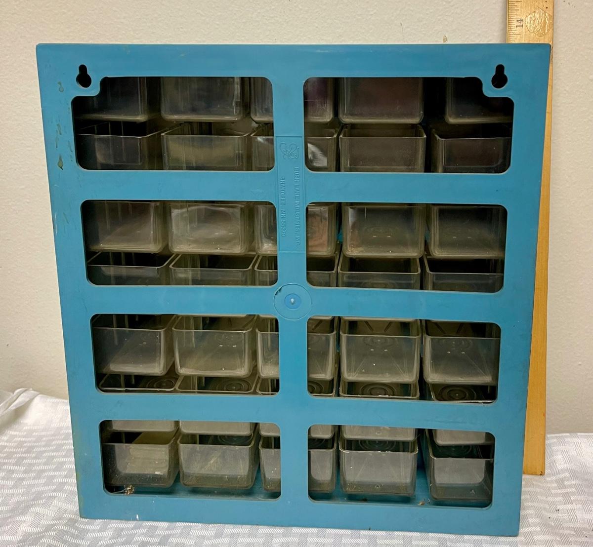 Organizer is empty, drawers are see-through plastic. Blue plastic cabinet. In good used condition