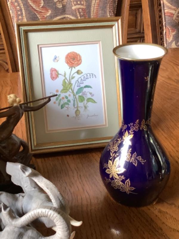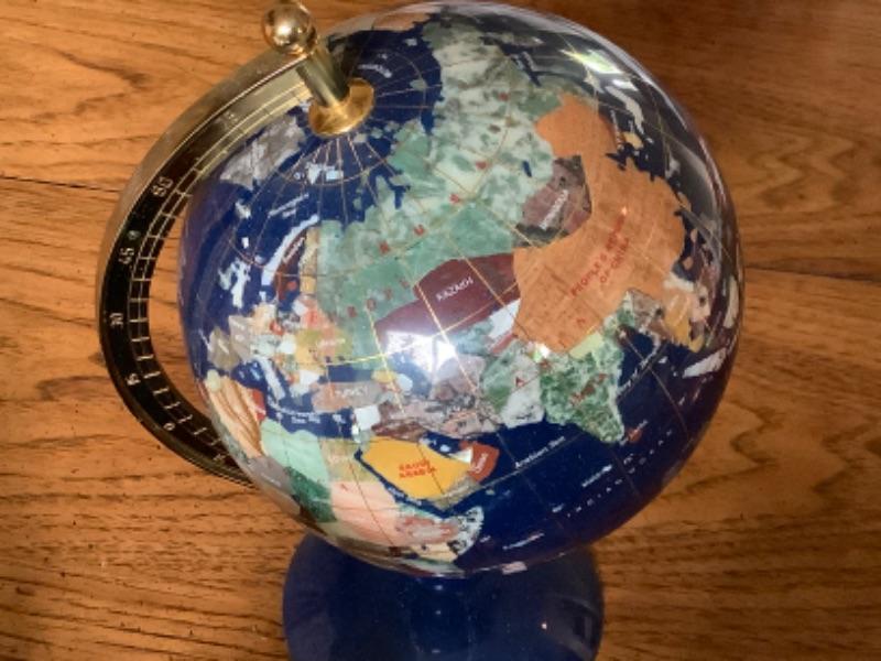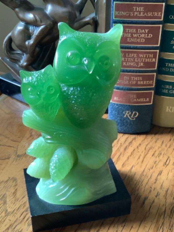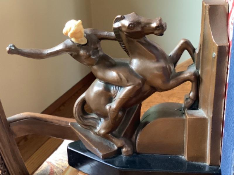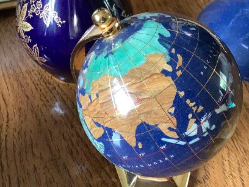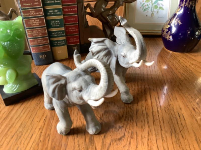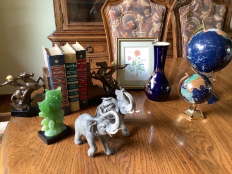 Book ends as is, ceramic elephants, owl statue, vase, and two globes made of semi-precious stones.