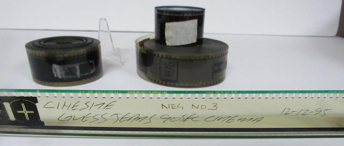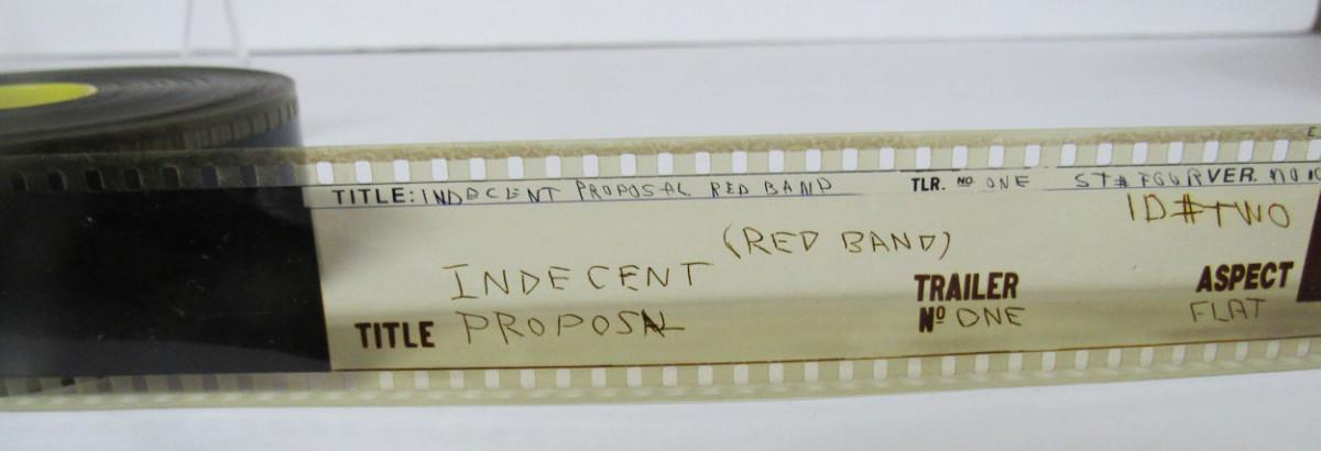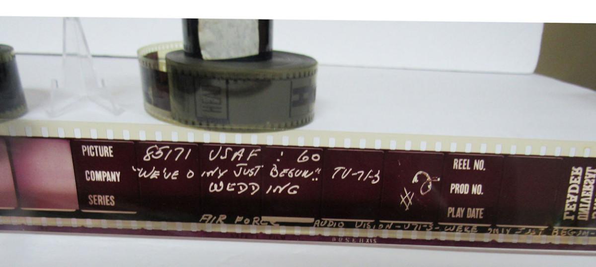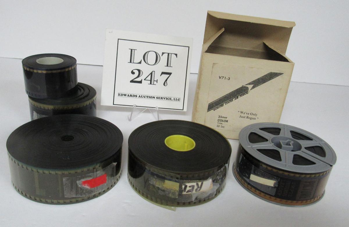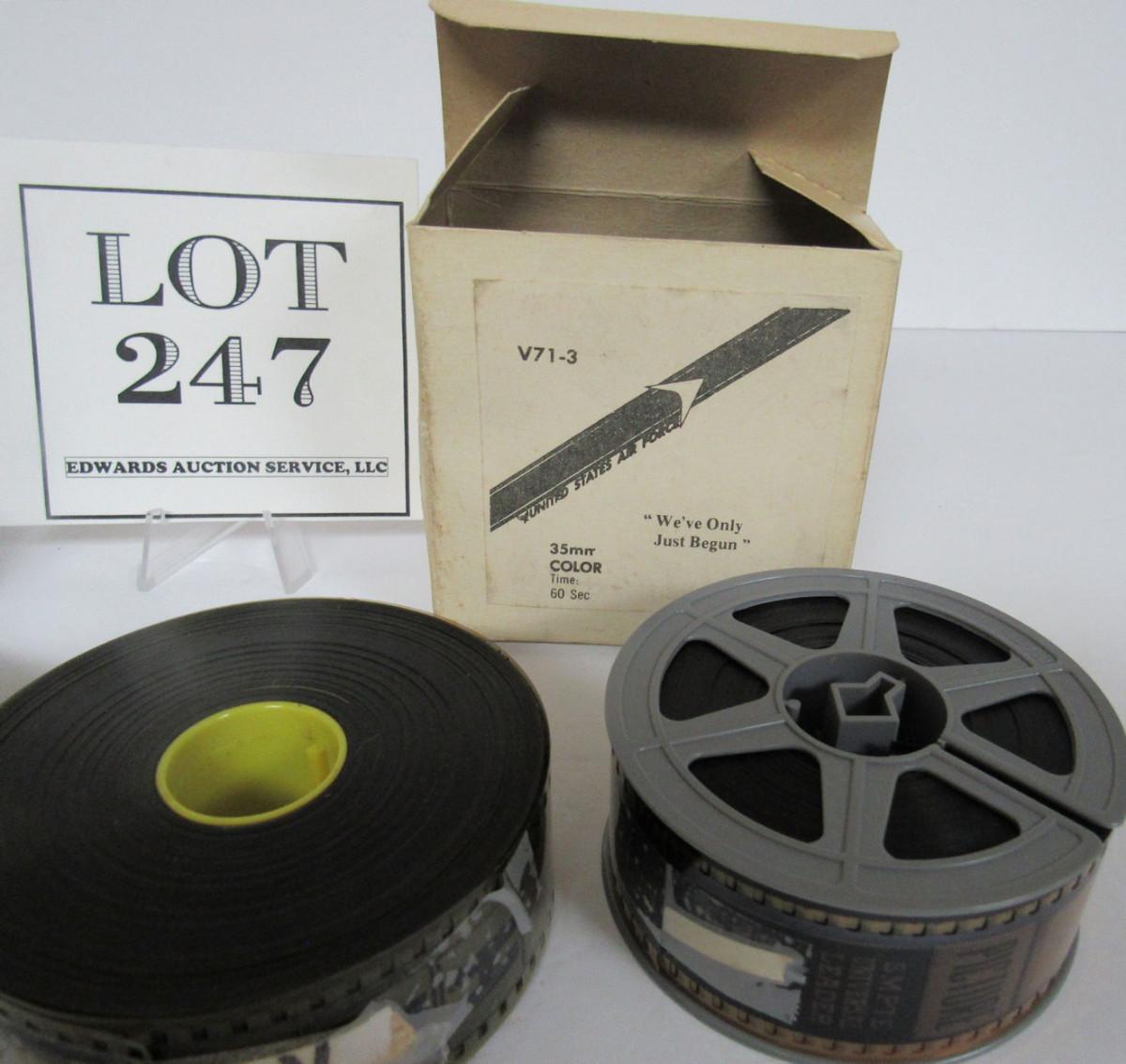 35 mm Film Reels, 1 Appears to be Basketball, 1 Is Indecent Proposal Trailer, 1 is USAF Wedding Only Just Begun, 1 Unknown