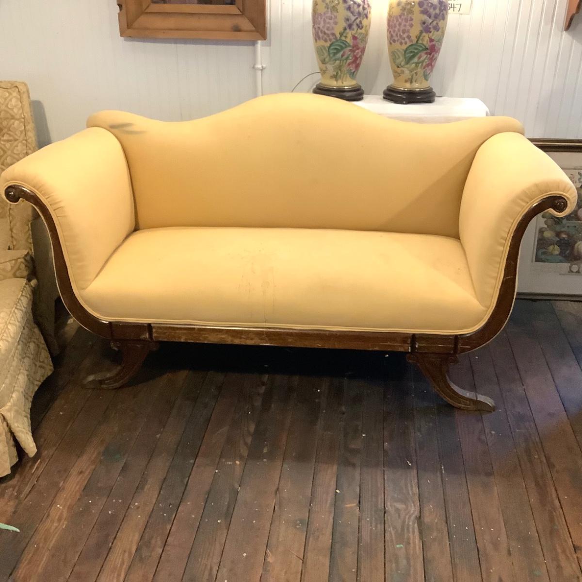350 Vintage Camel Back Upholstered Duncan Phyfe Loveseat