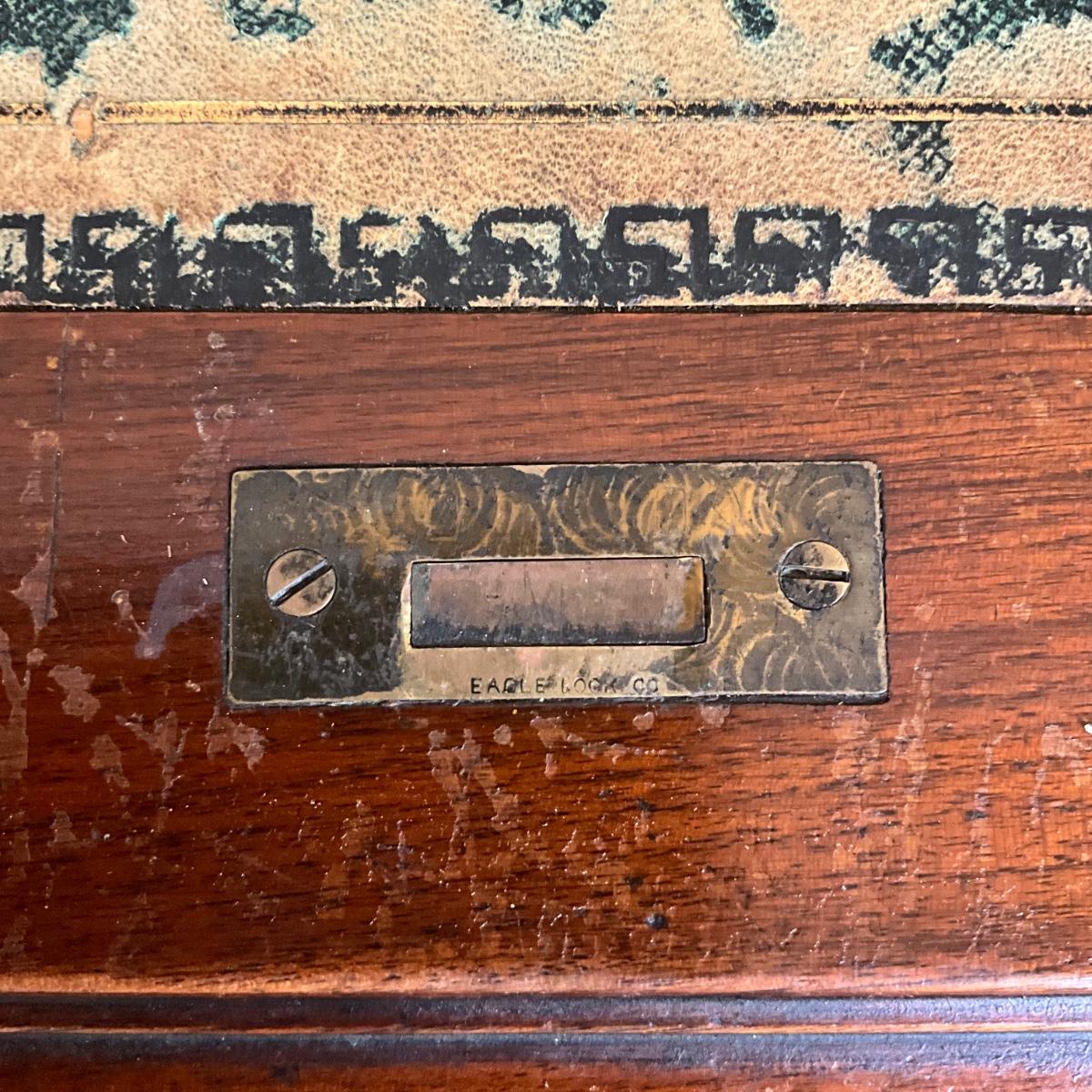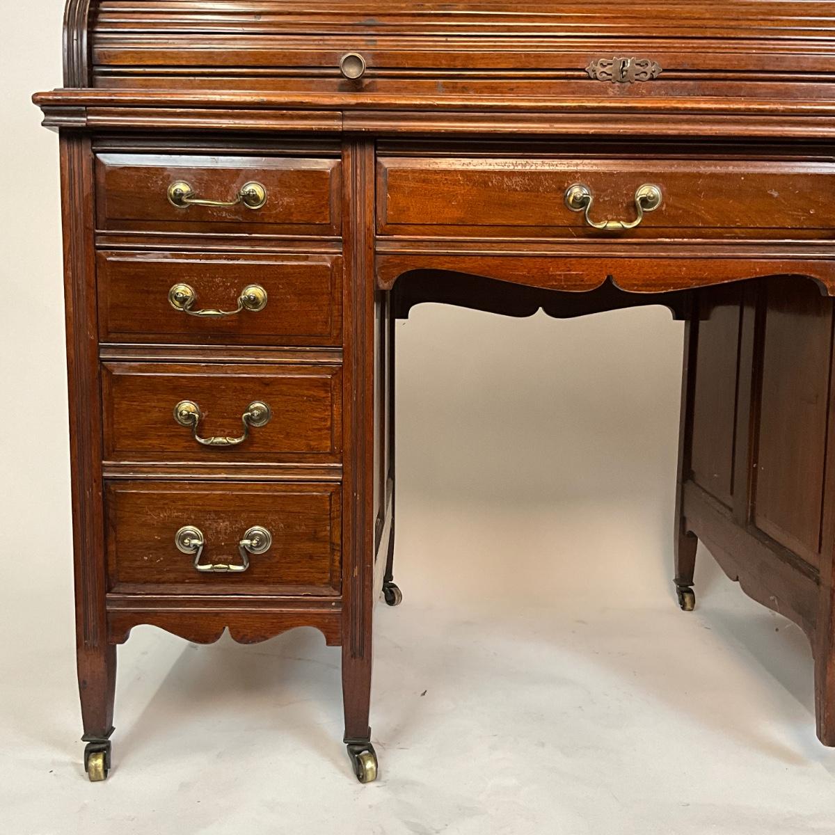 Beautiful Angus of London Roll Top Tambour Desk with 8 drawers, eagle lock co brass hardware, brass pulls & know, missing one castor wheel, leather top has some wear 43" high x 48" wide x 27" deep desk height is 30.5"