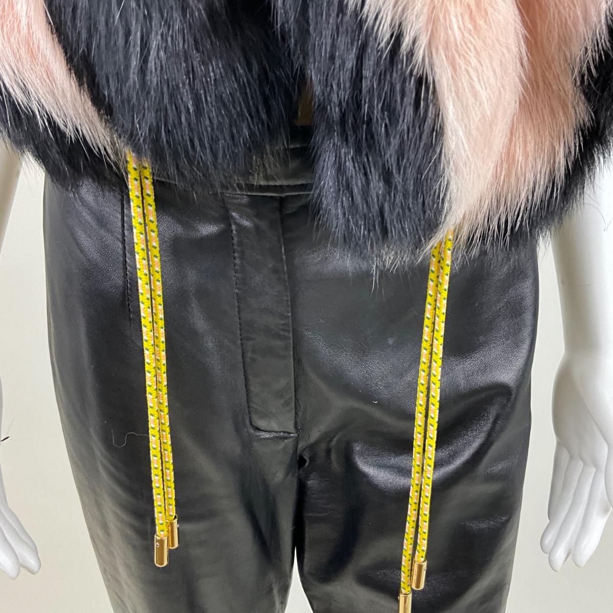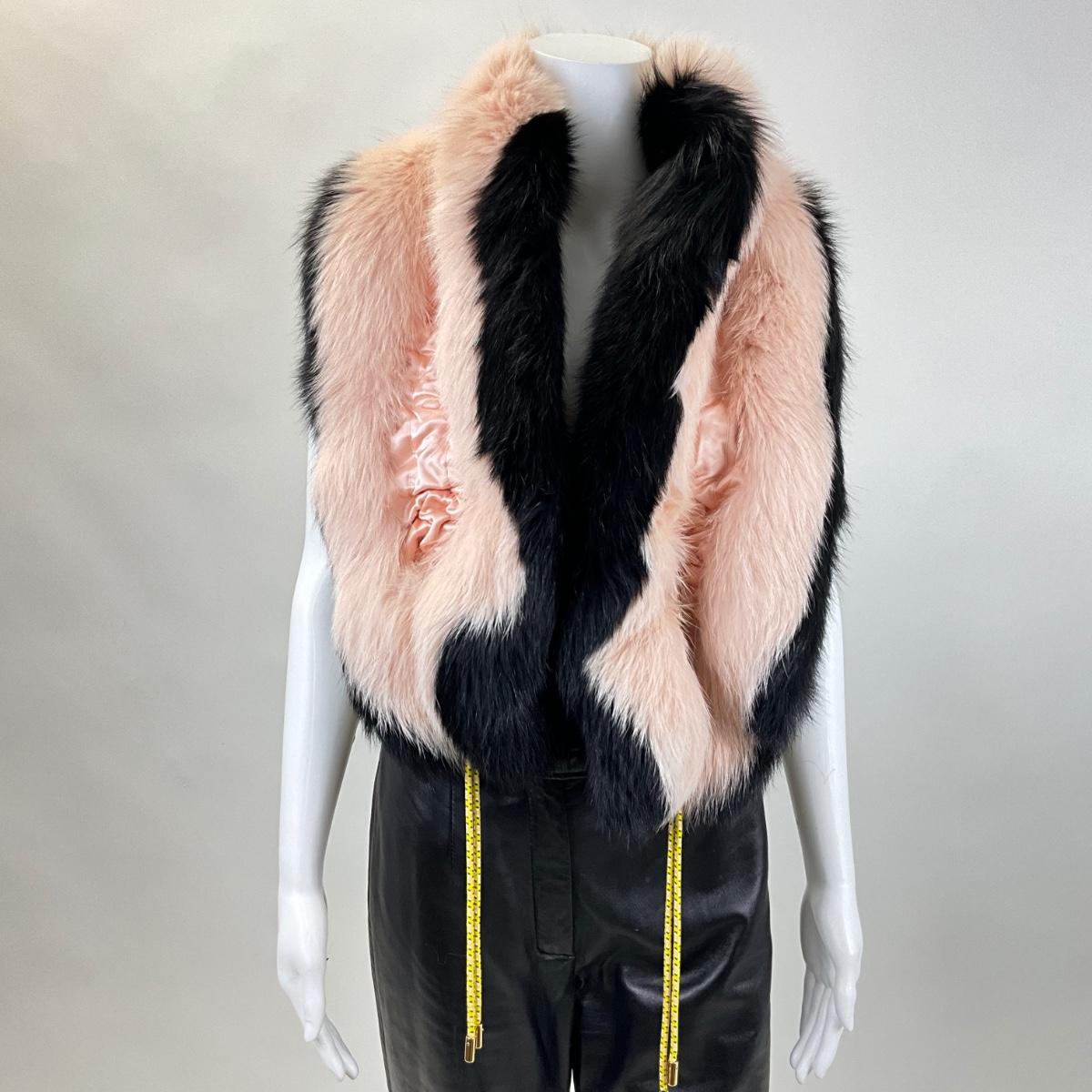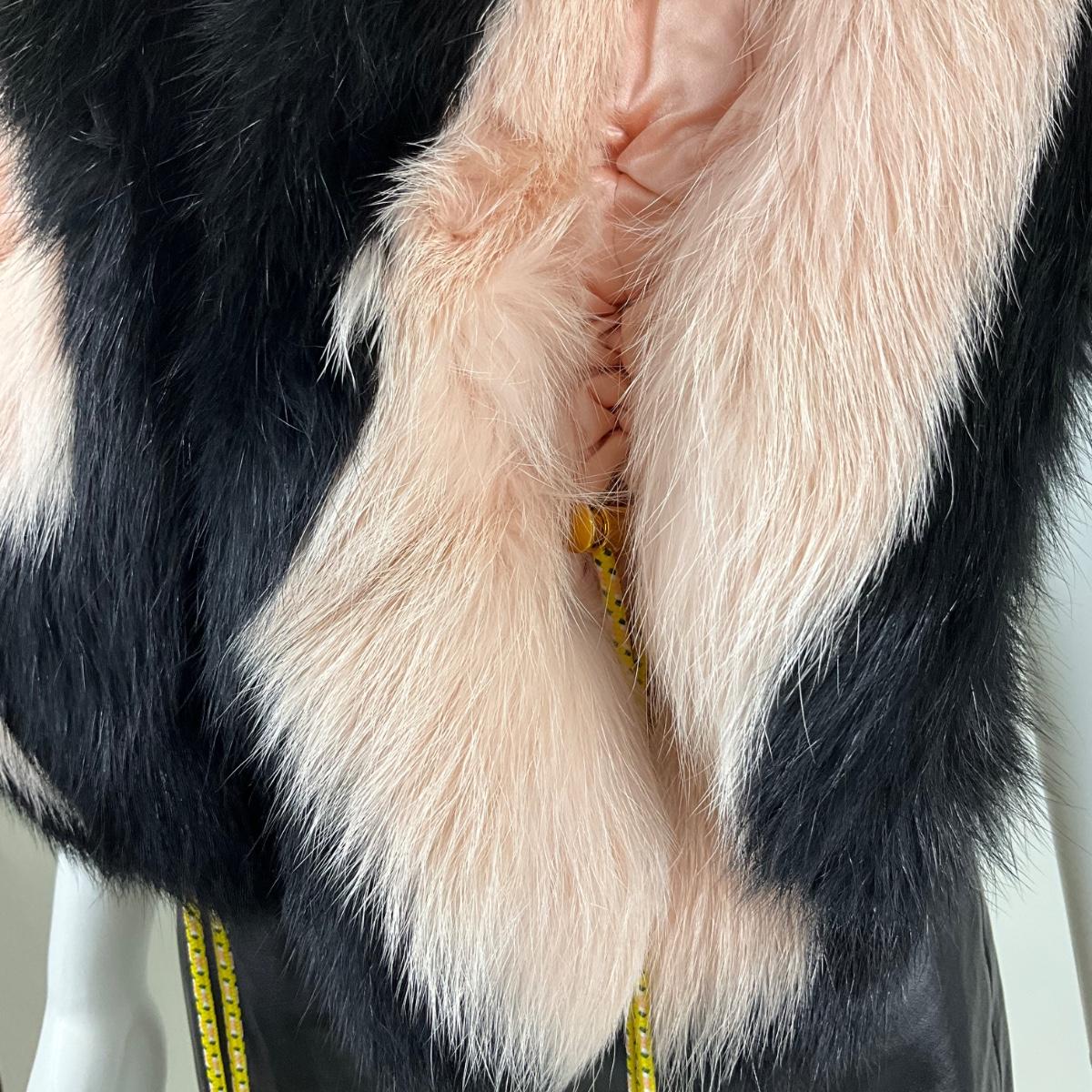 Elegant and luxurious, this FENDI black and pink stole wrap is a striking accessory crafted from 100% silk and adorned with fox fur. Featuring a soft and sophisticated design, this piece exudes timeless glamour. The contrasting black and pink fur, combined with yellow cord details, makes this wrap a unique and versatile addition to any wardrobe.
