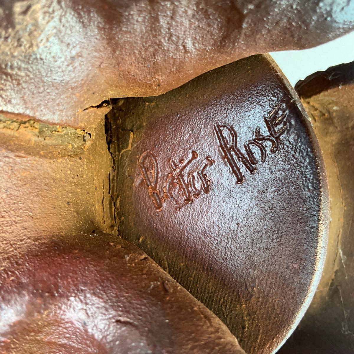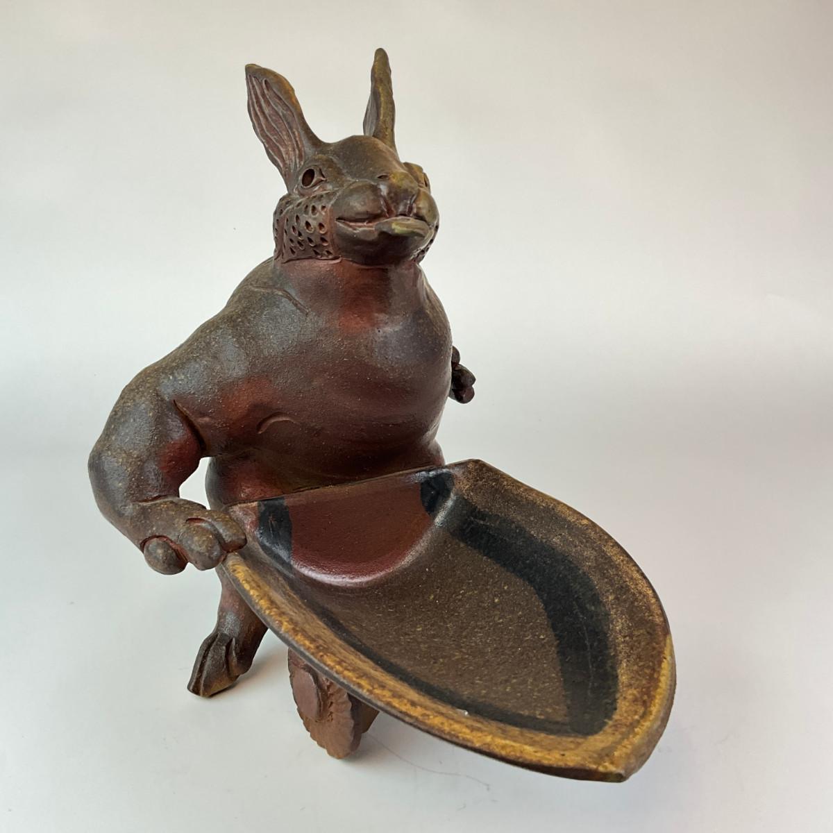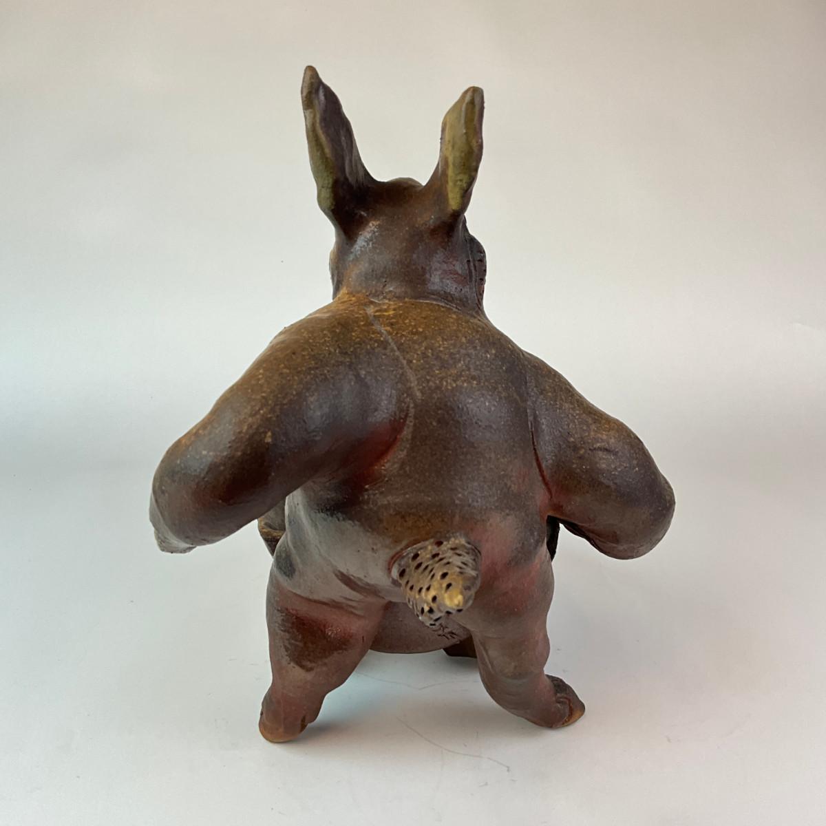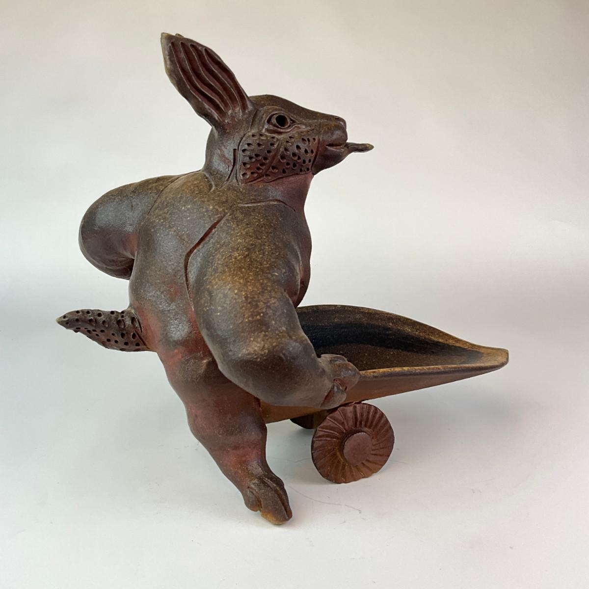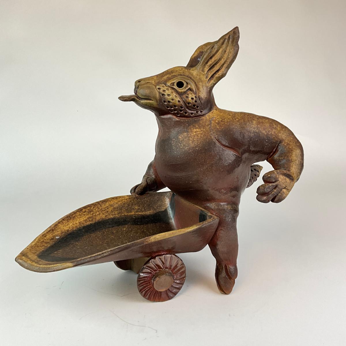 356 Ceramic Signed Peter Rose Scultpure Depicting Rabbit Figure Pushing Wheel Barrow