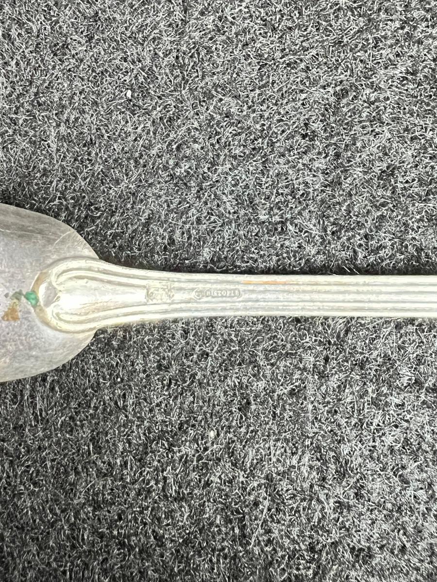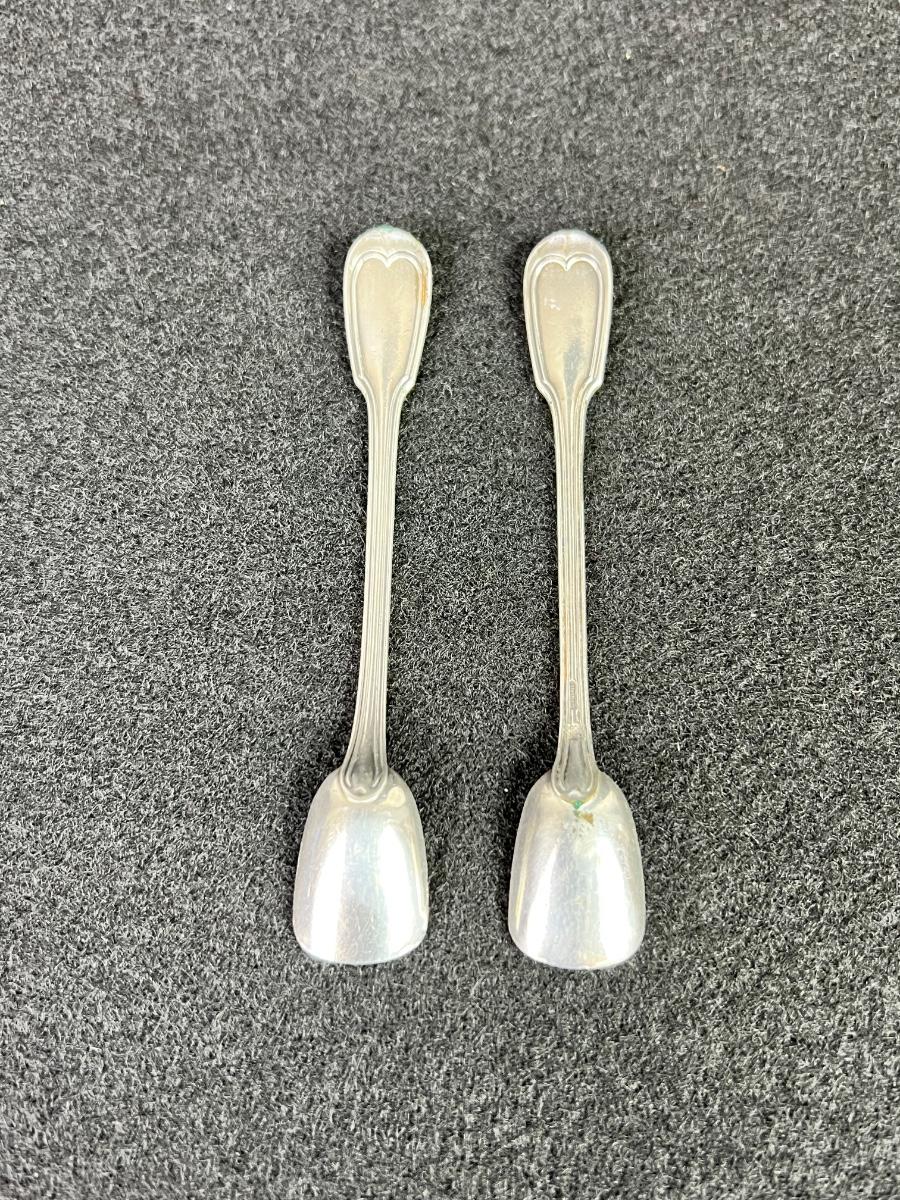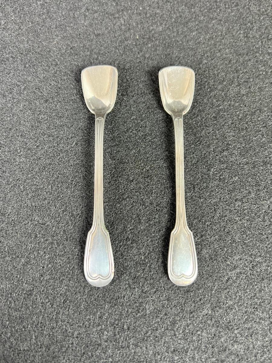 Pair of sterling Christolfe salt spoons marked. Measuring 3 1/2” long.
