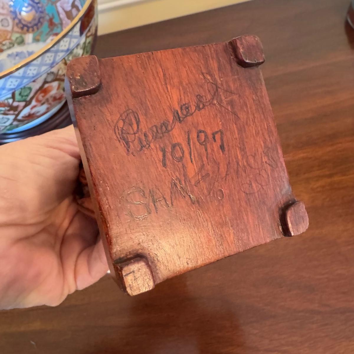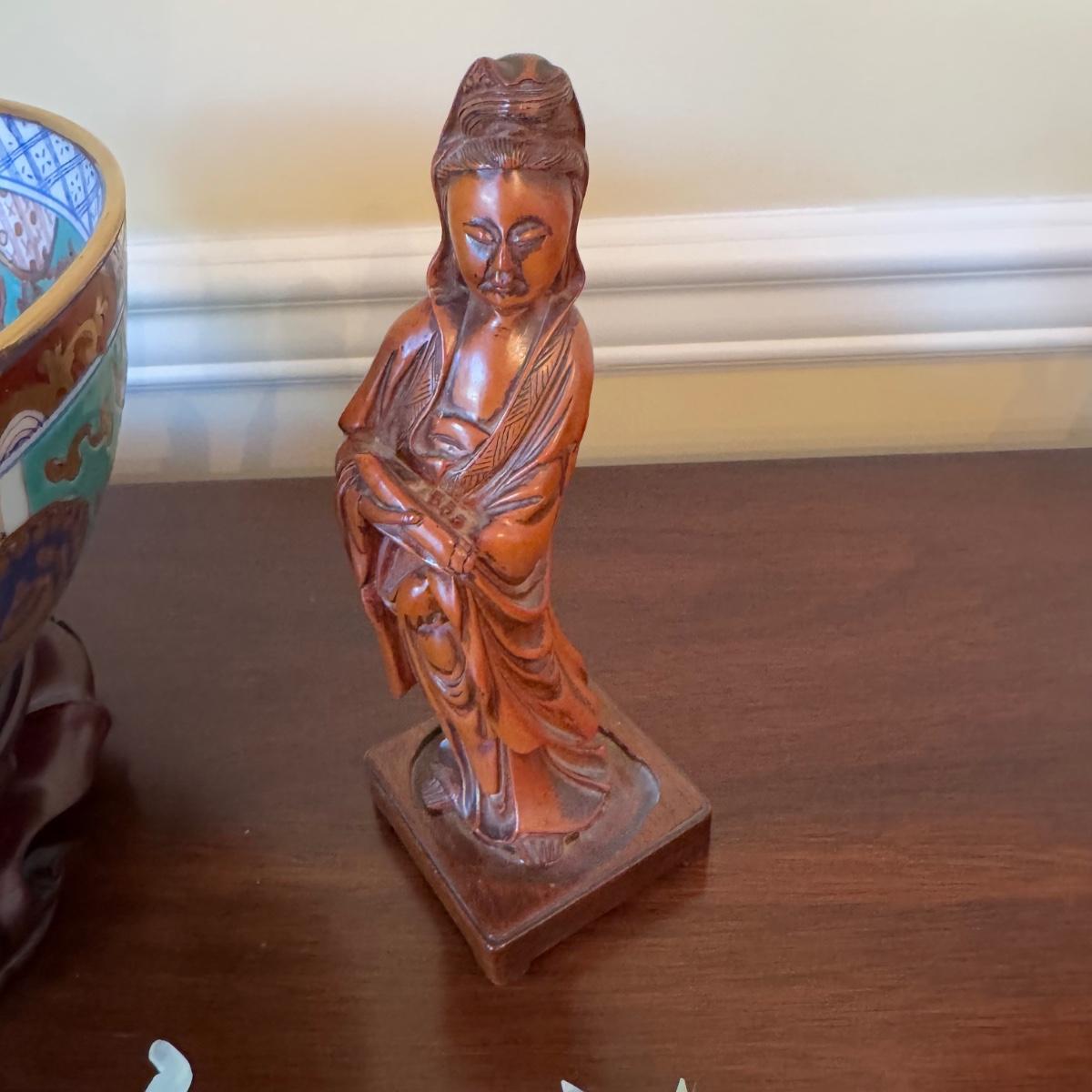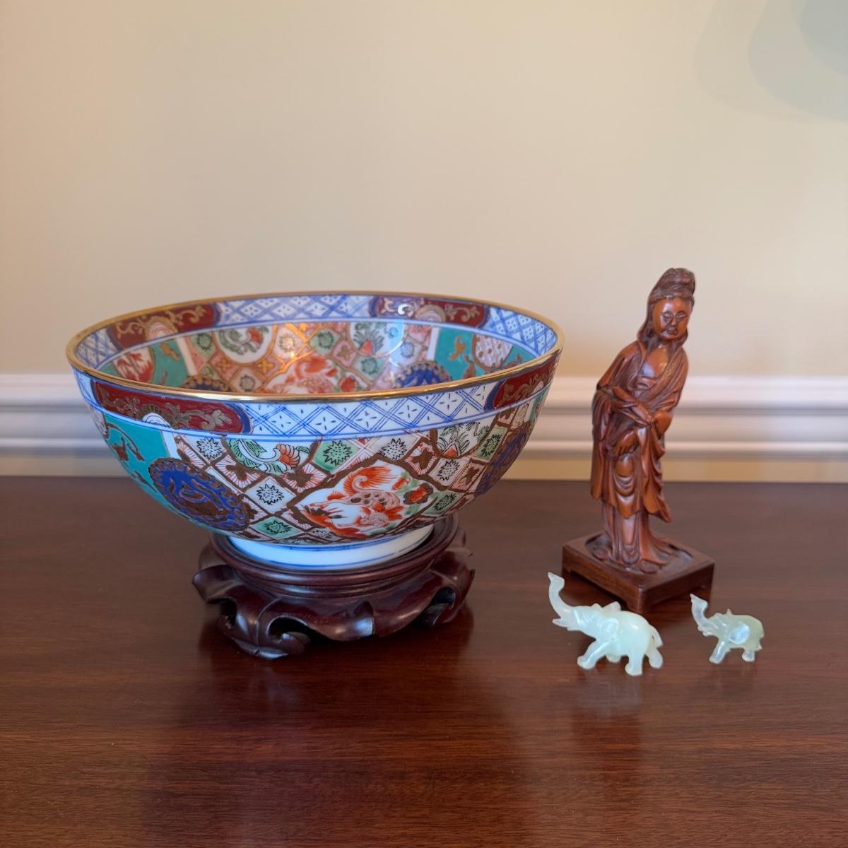 bowl is 10" in diameter on Chinese wooden stand , and carved asian woman figure, with two jade carved elephants