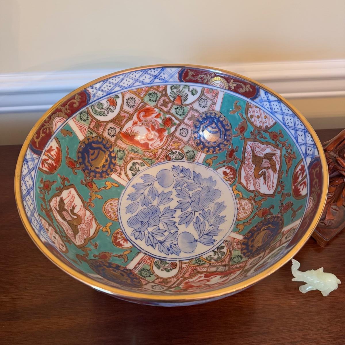 356 Vintage Asian Bowl with Figure and Jade Elephants