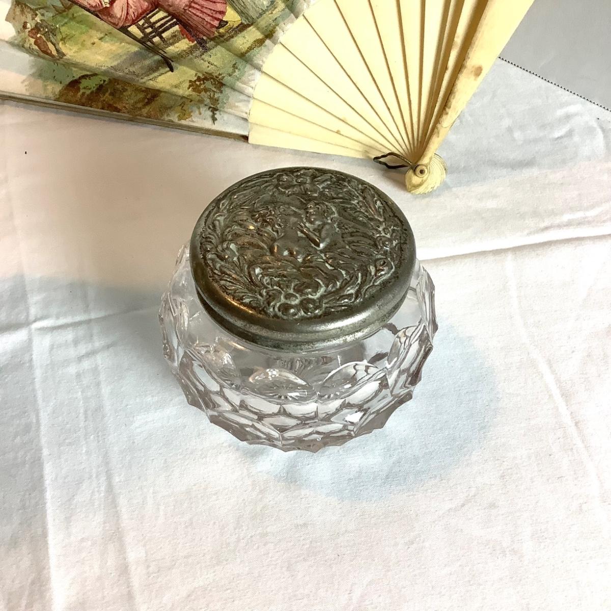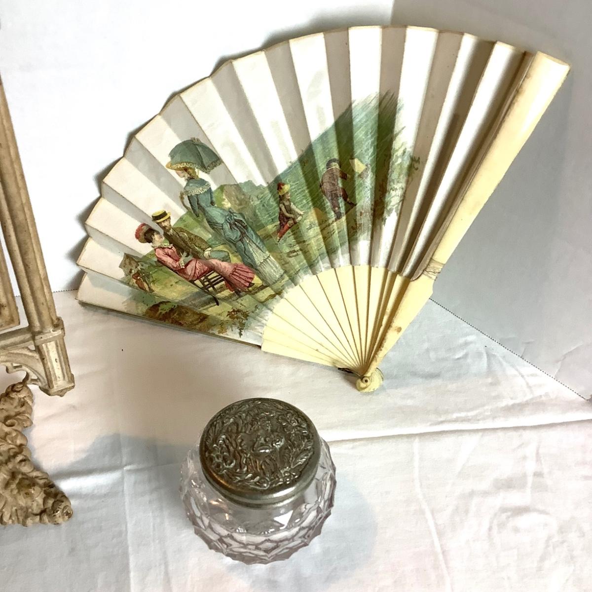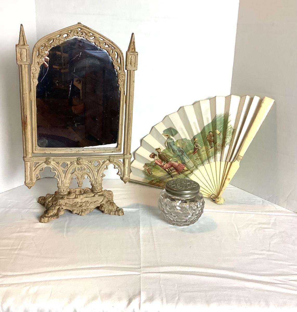 357 Victorian Ladies Cast Iron Vanity Mirror with Satin Fan and Glass Jar