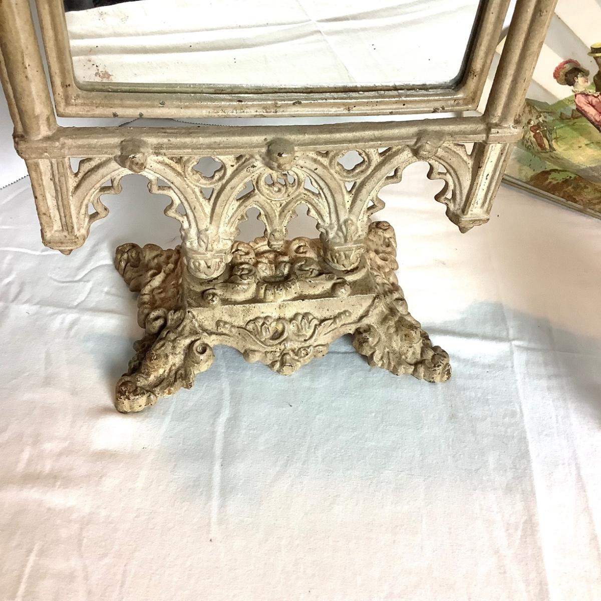 Mirror is a cast iron pedestal measuring 16" high x 9" wide