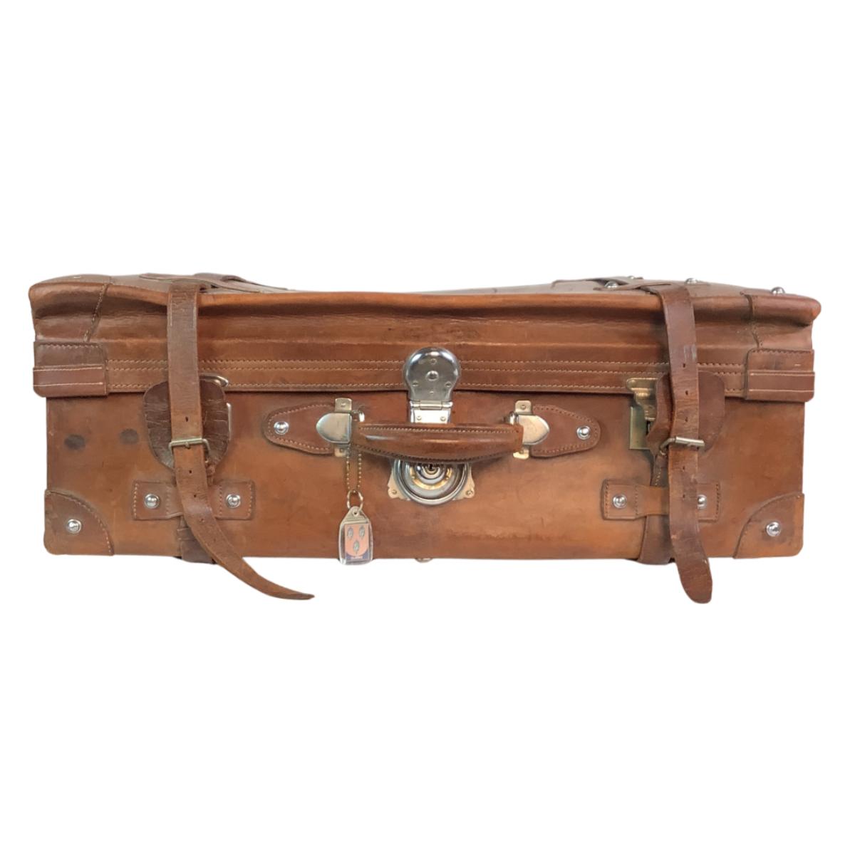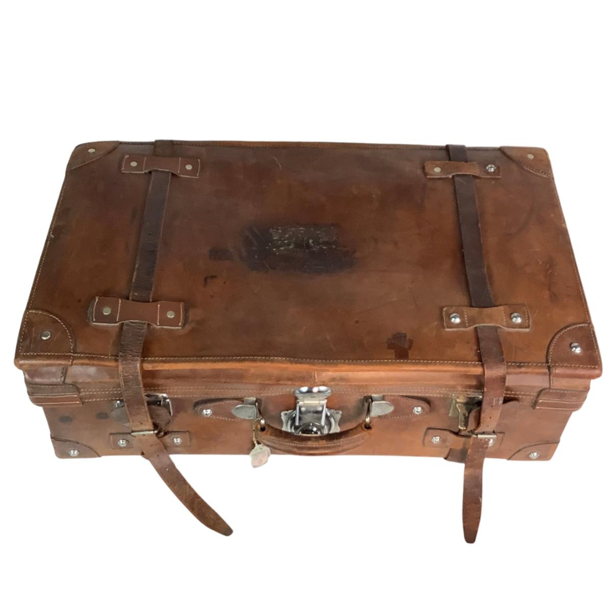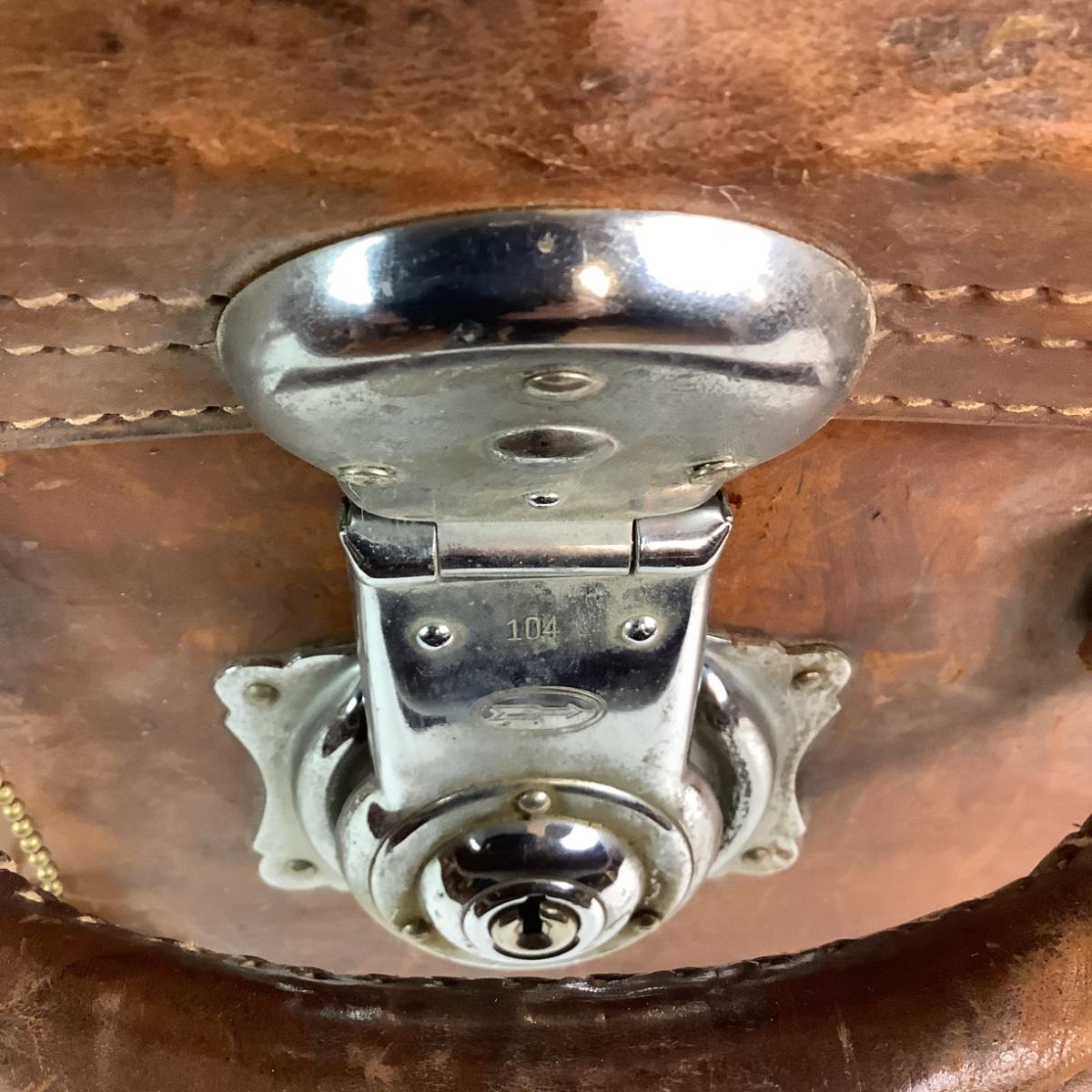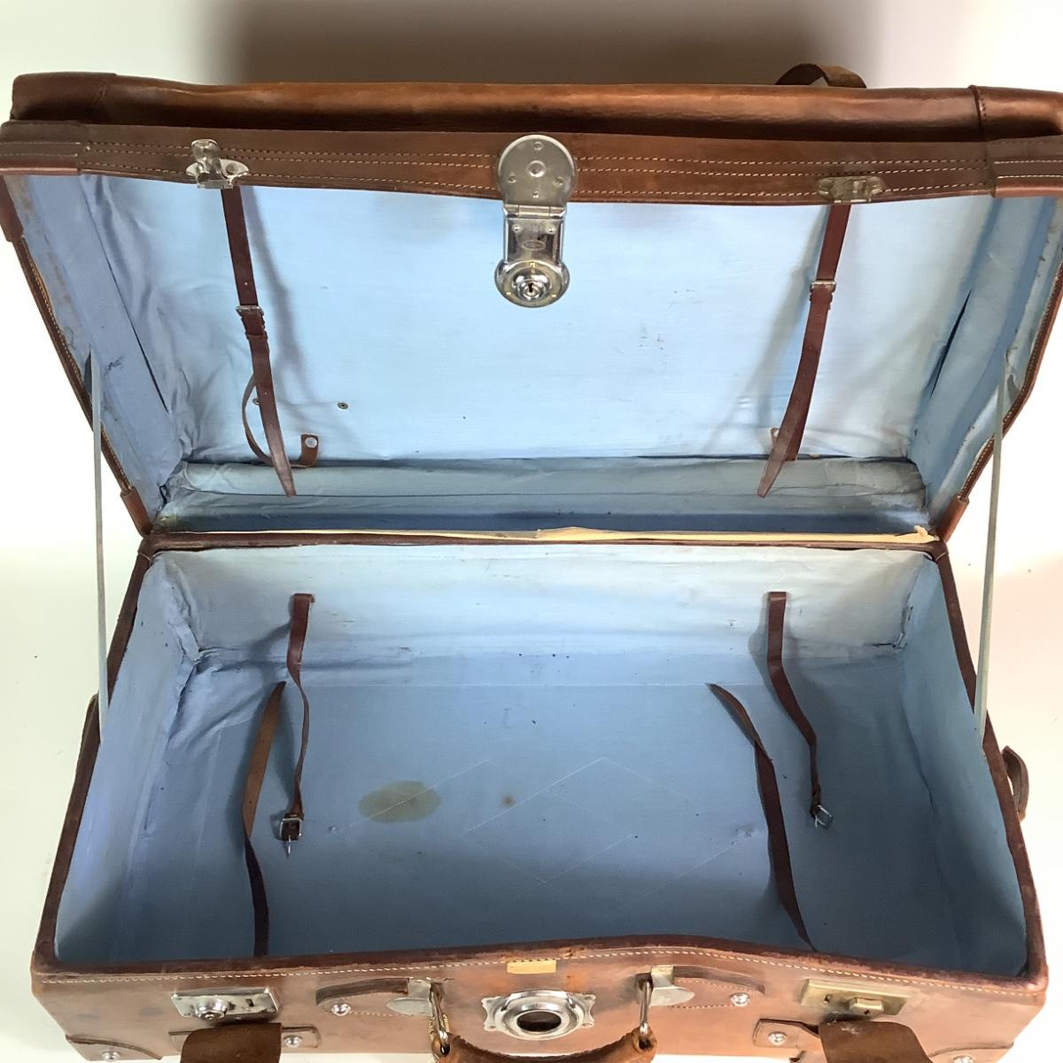 Reinforced exposed straps, handles, chrome latches, includes working key, original pale blue textile interior, one ripped strapped everything else leather is intact. Rich dark leather patina. 30" wide x 11.5" high x 17" deep.