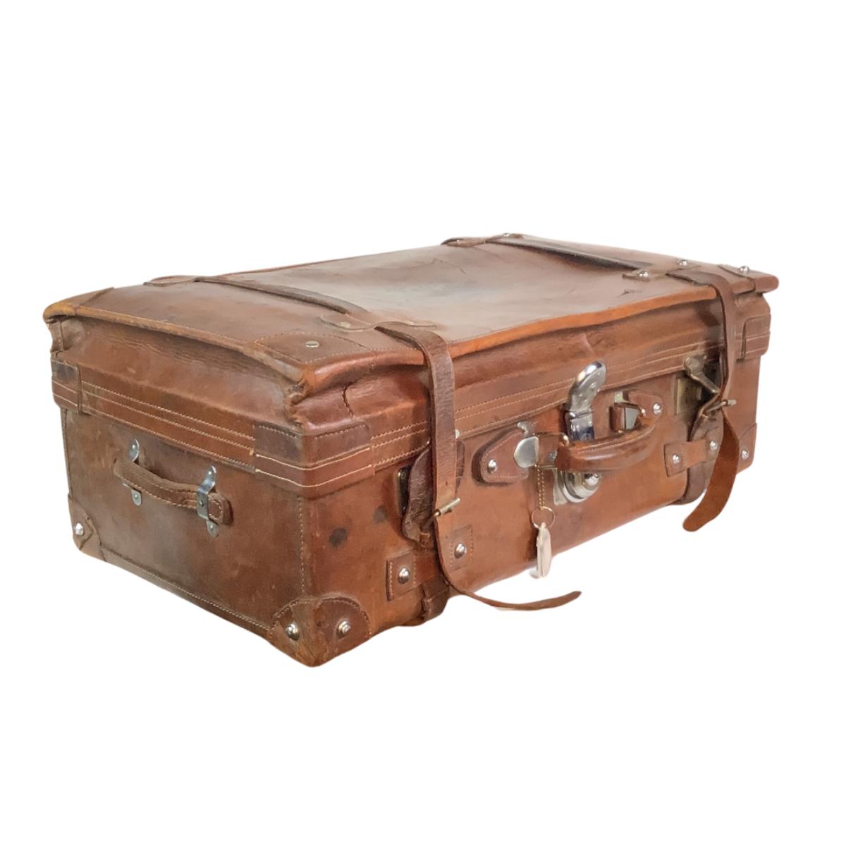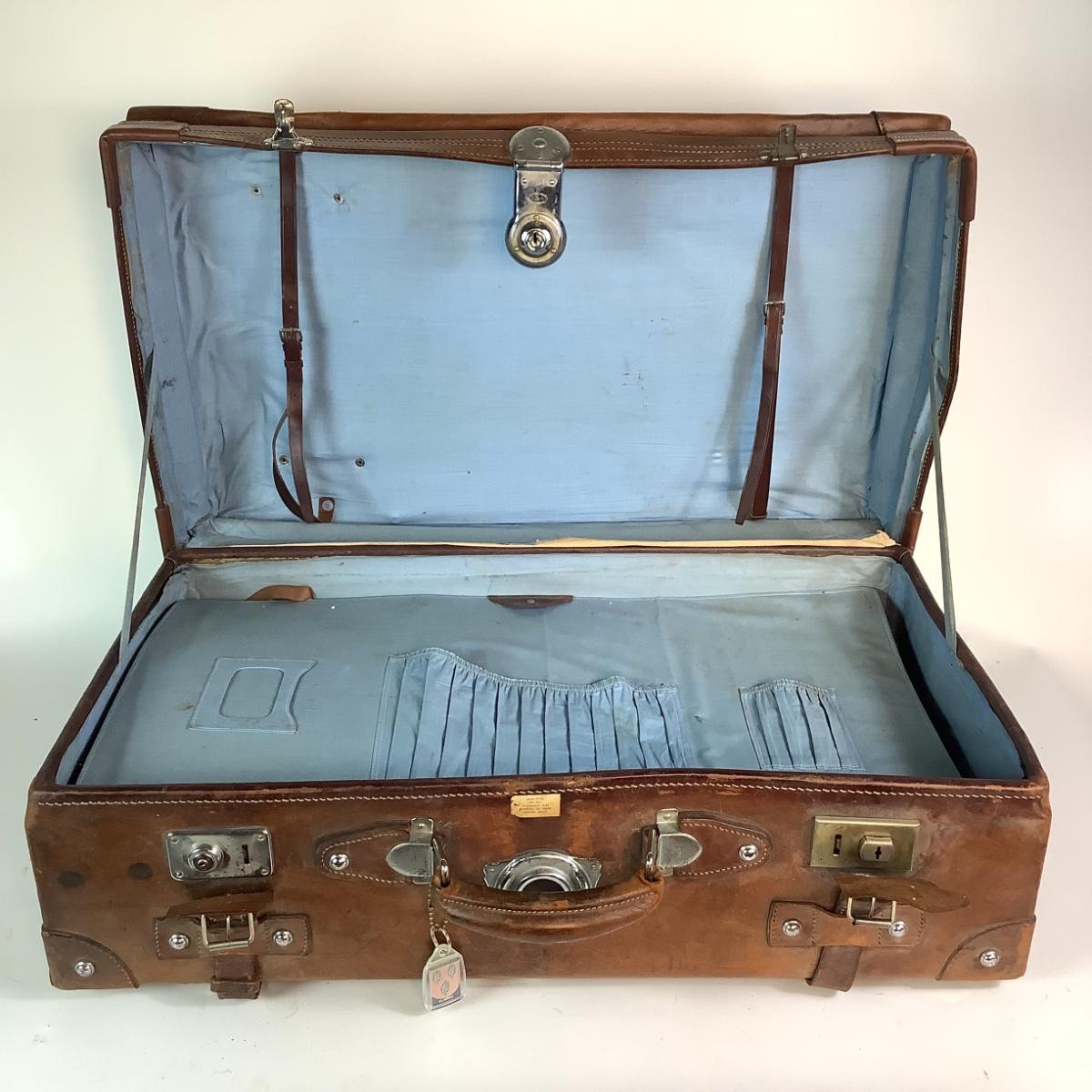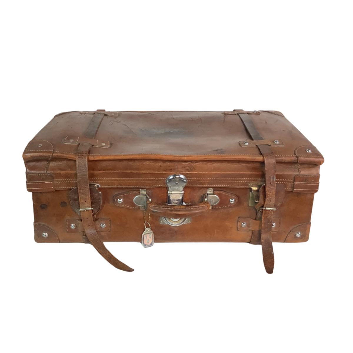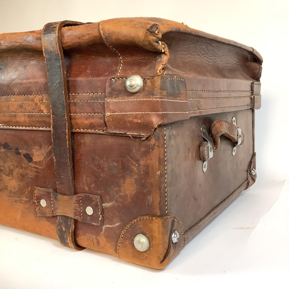 Reinforced exposed straps, handles, chrome latches, includes working key, original pale blue textile interior, one ripped strapped everything else leather is intact. Rich dark leather patina. 30" wide x 11.5" high x 17" deep.